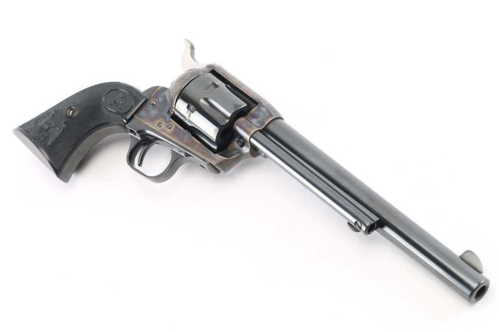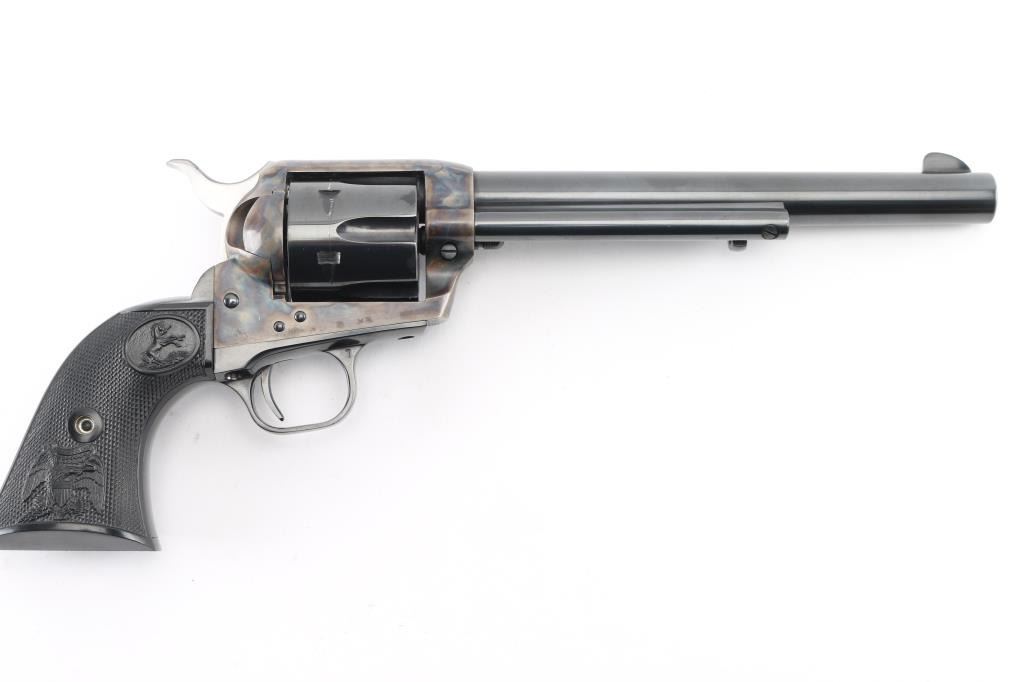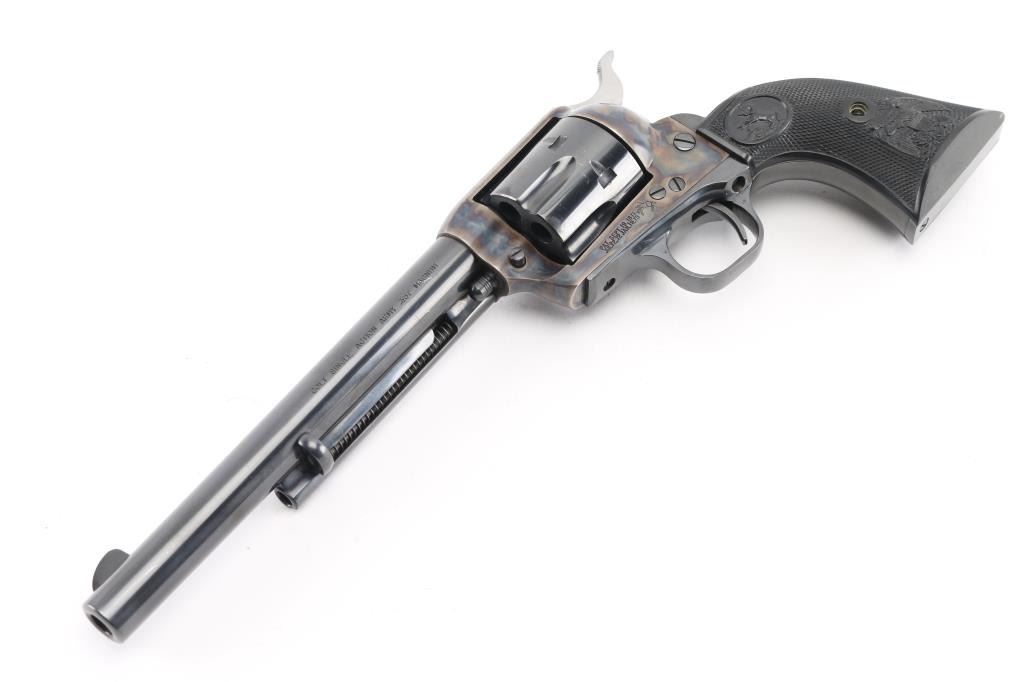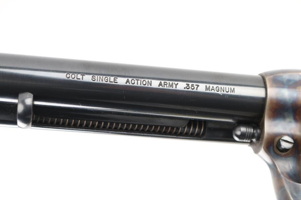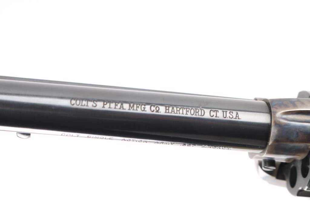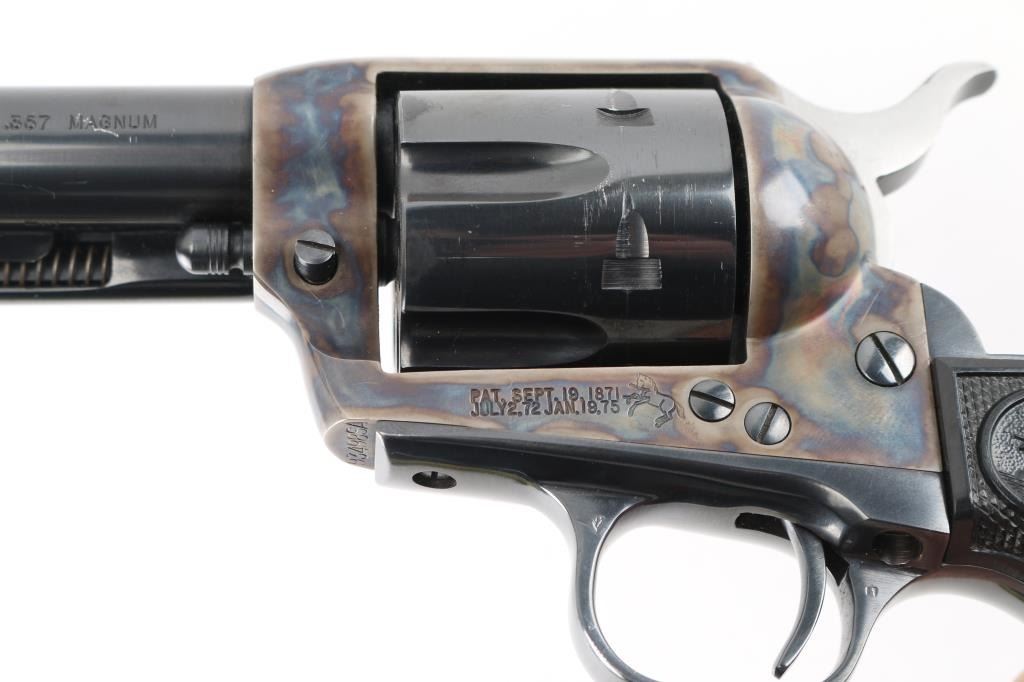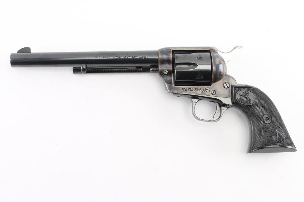 Single-Action. 6 rd capacity. 3rd Generation. Manufactured 1978. 7.5" barrel with front blade, and top strap notched rear sight. Blued metal finish, with case-hardened frame. One line Colt Address on top of barrel. Side stamped "Colt Single Action Army .357 Magnum. 2 line patent dates, with Rampant Colt on left frame. Checkered black hard rubber grips with Rampant Colts, and American Eagles. Cylinder indexes properly, and hammer locks up tight. Metal finish is excellent with some very minor muzzle wear/scratches. & tracking on the the cylinder. Charge holes are excellent. Bore is excellent/bright. Grips are excellent. Revolver is in almost new condition. Appears unfired. NRA Condition-Excellent. Modern firearm.