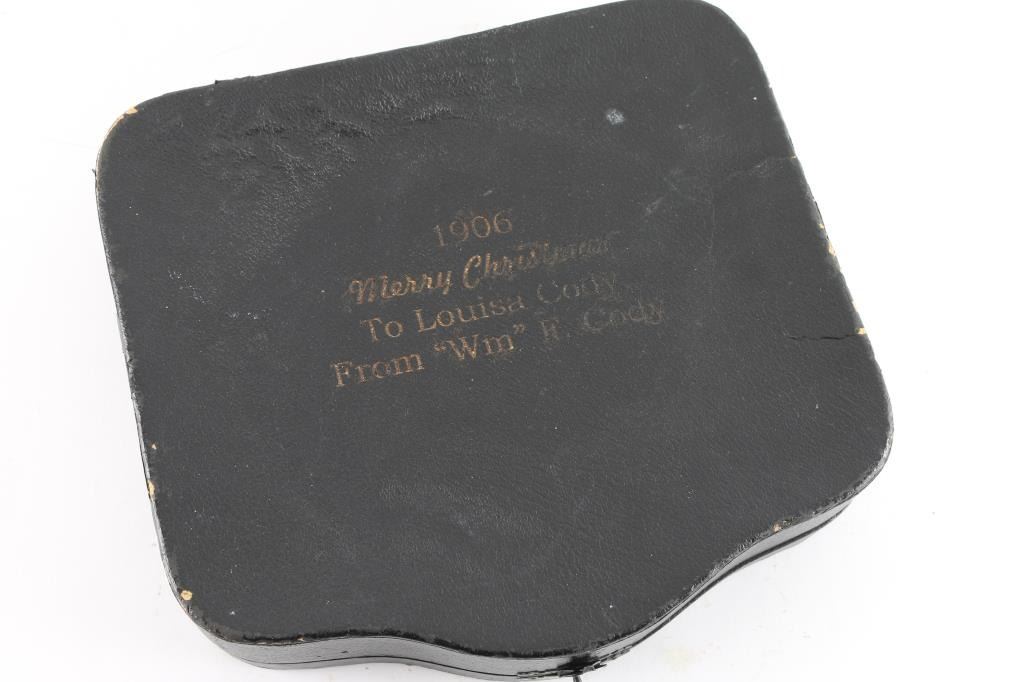 In presentation case from William F Cody includes engraved mirror, brush, nail file buffer, and nail pick all in a pink sorbet colored satin case. Top of case reads "1906 Merry Christmas to Louisa Cody from WM F Cody"