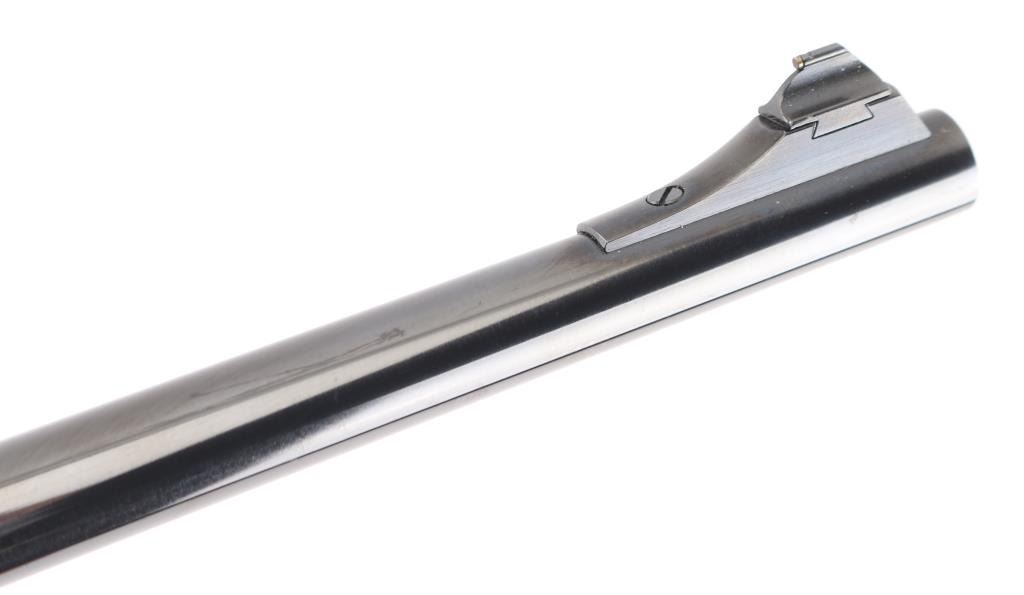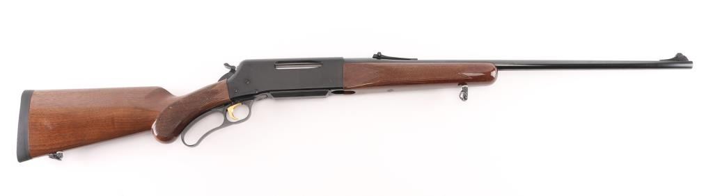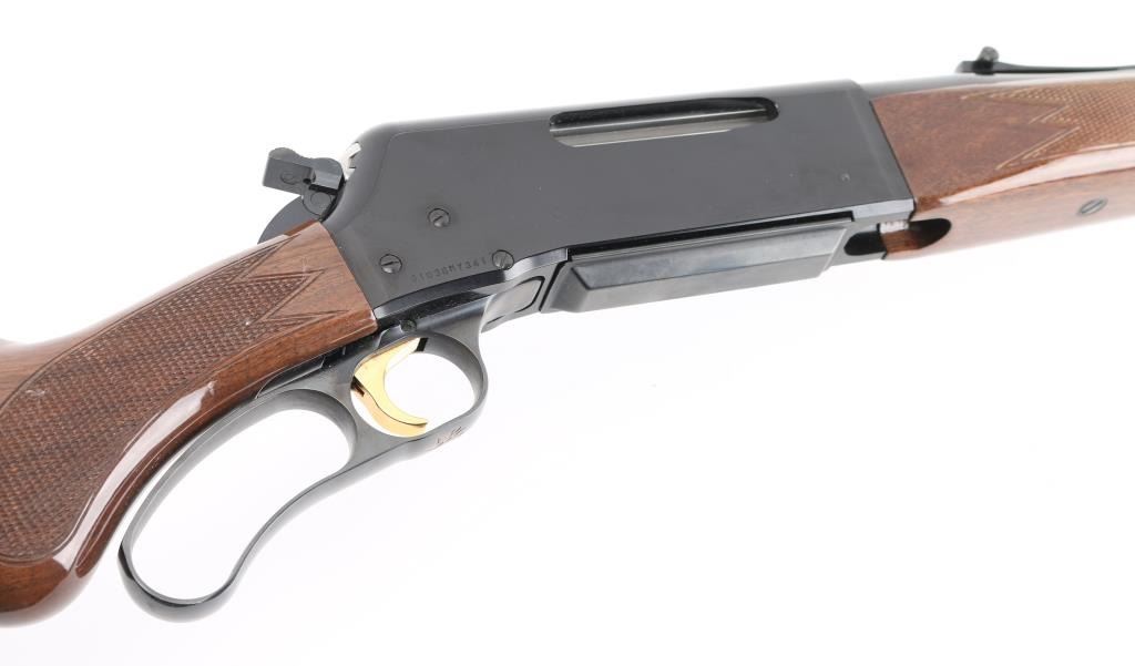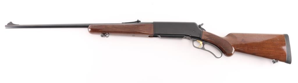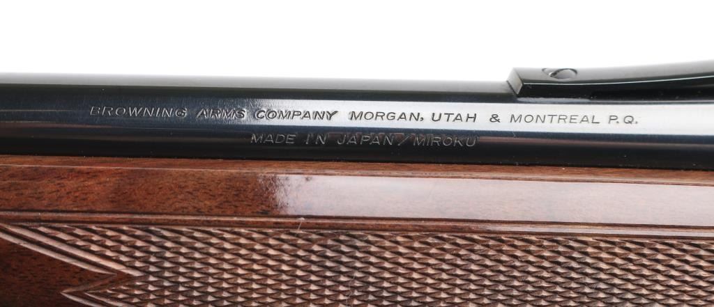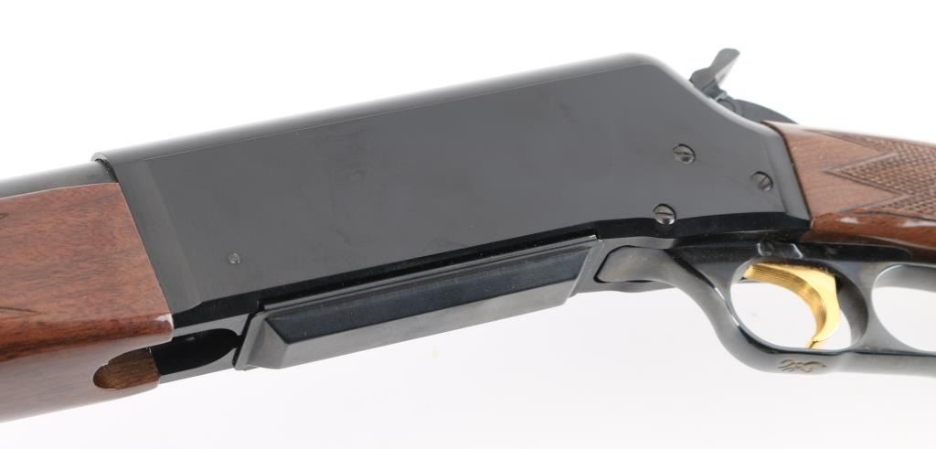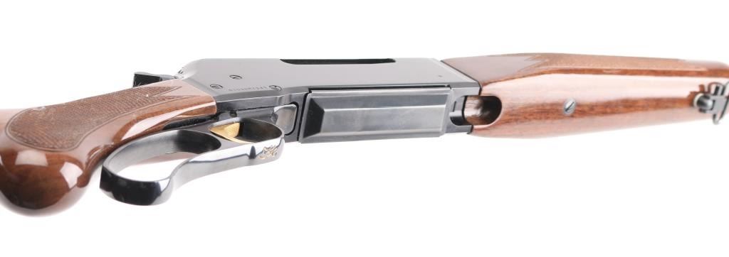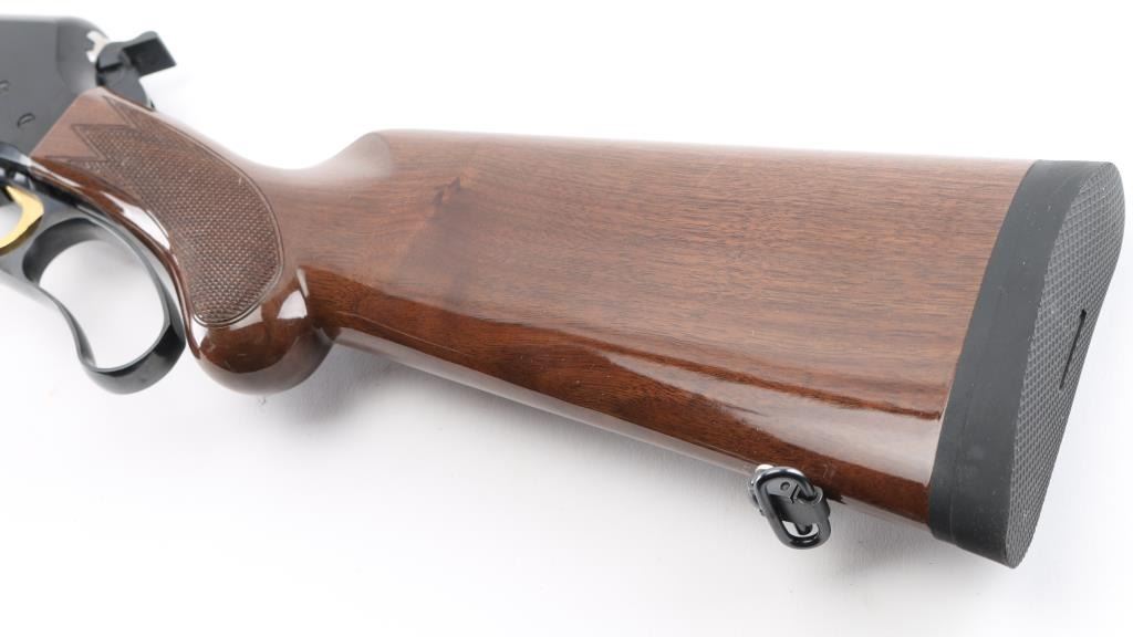 SN: 01038MY341. Made in Japan by Miroku for Browning this is a lever action center fire rifle chambered in .300 Win. Mag.. circa 2002. It features a 24" tapered, blued barrel and receiver with a detachable magazine, serrated hammer spur, gold Browning "Buckmark" logo on bottom of lever, gold serrated trigger and raised blade/brass bead front sight, adjustable notch rear sight. The two piece wood stocks are checkered at the 'Prince of Wales' style grip and forearm, with metal barrel band and Browning factory rubber recoil pad. Comes with sling swivels. Receiver drilled/tapped for optics. LOP is 14.50". Bore is excellent/bright. Wood stocks and blue finish are excellent. Condition is NRA Excellent. Modern Firearm.