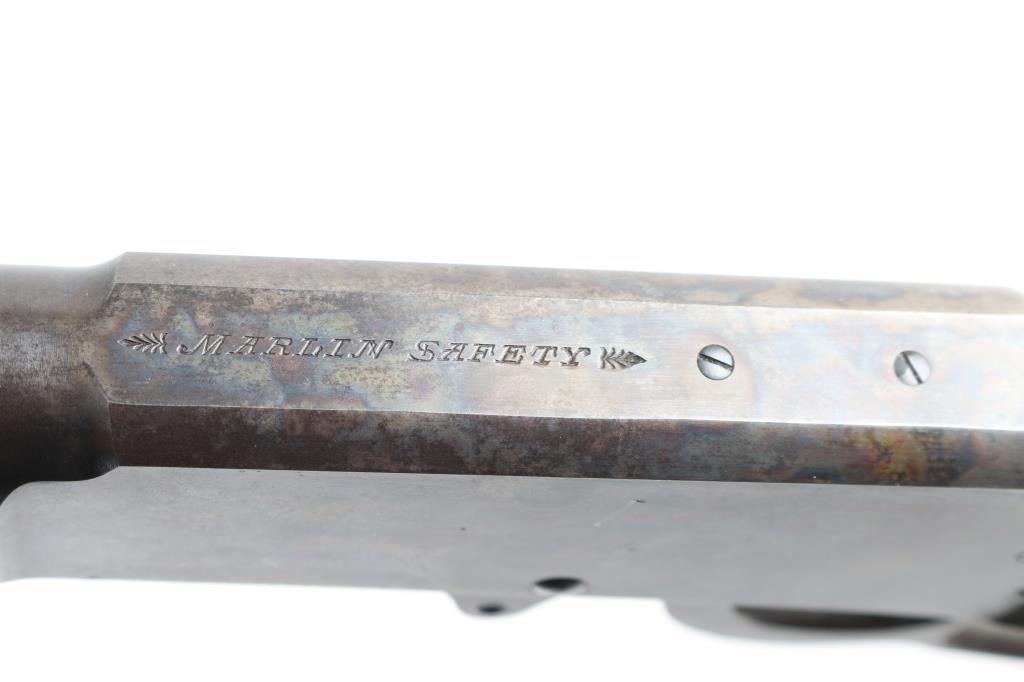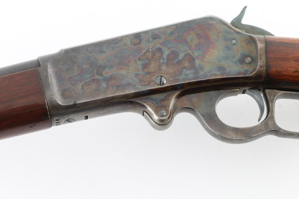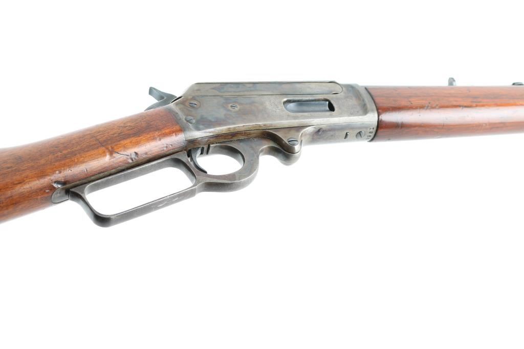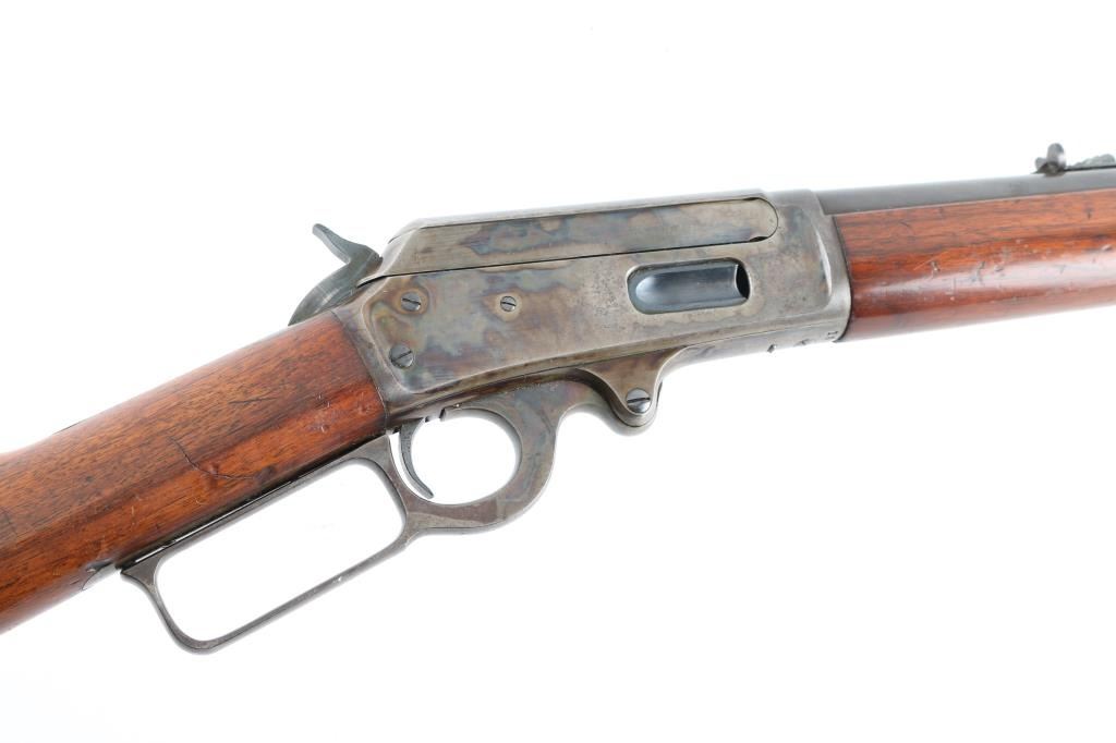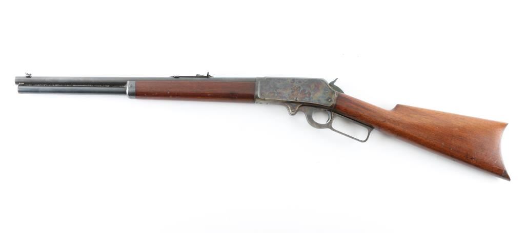 Lever action rifle manufactured circa 1905-1920. Features 17.5" round barrel, full length magazine tube, L-flip front sight (choose from thick post, or narrow post inside ring), semi-buckhorn sporting rear sight, straight grip, curved steel carbine buttplate. Bore is very good condition. Barrel and magazine tube retain 80% deep blued finish, the remainder shows thinning and fading, some color change to gray. Slight edge losses. Action retains very good case color, with much mottled bright blue color throughout, some light patina, several scratches. Buttplate is blued, very good condition overall. Wood is very good condition walnut, varnished, small dents & gouges in many places, no Marlin "bull's eye". Some sticky residue on butt. Action is smooth. Markings are deep and readable, some letters lightly eroded at tops or bottoms. Condition is NRA Very Good+ *** C&R Firearm ***