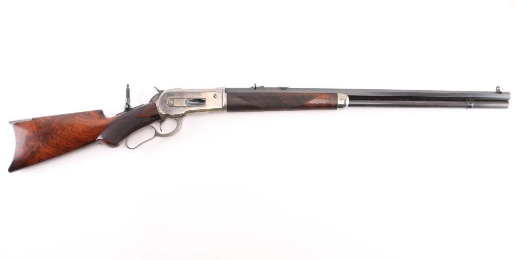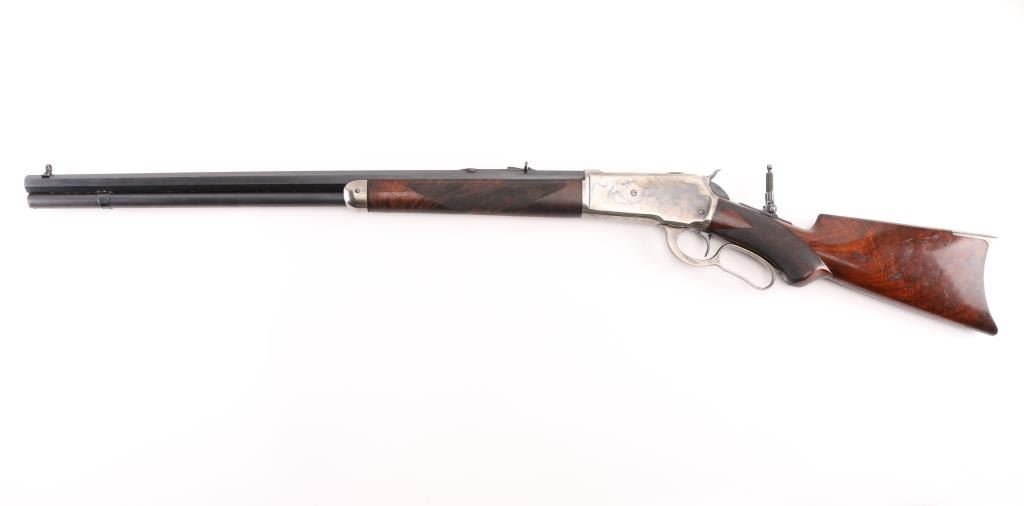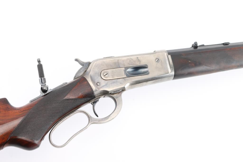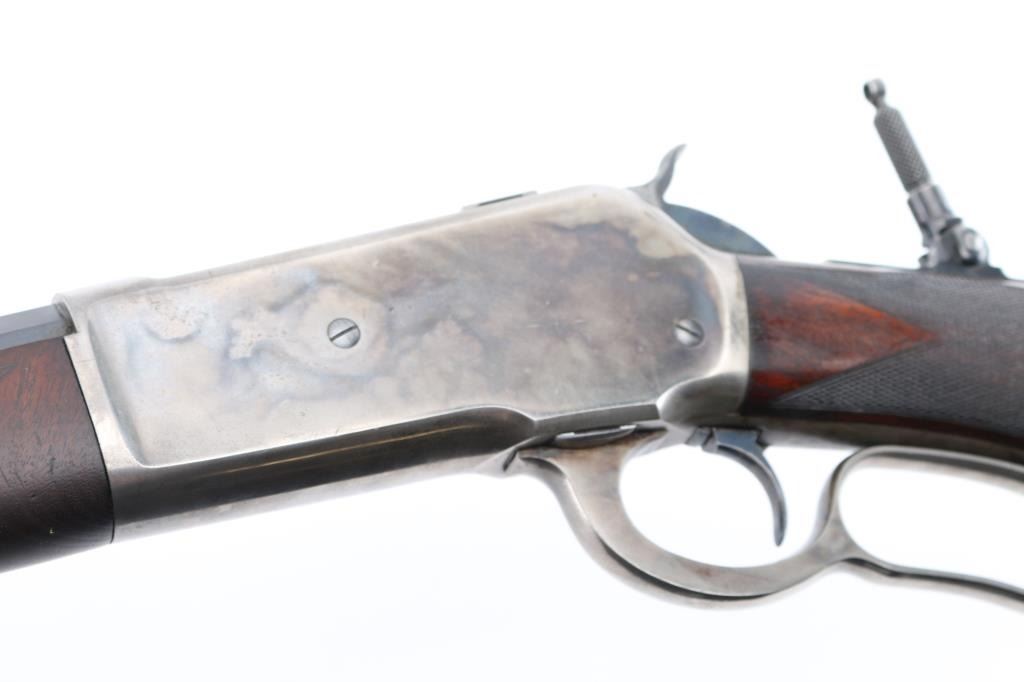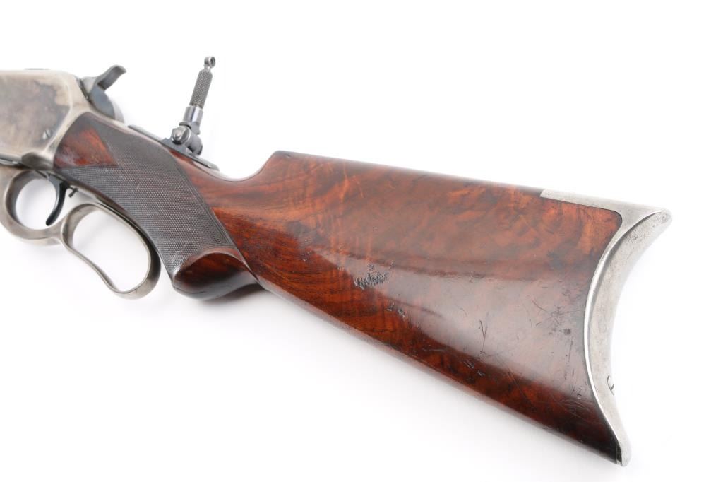 This deluxe Special order variation of the Winchester Model 1886 rifle is chambered in the very desirable 45-90, it was manufactured in 1893. 26" octagon barrel . The rifle is fitted with a special order dovetailed folding Beech combination front sight. Buckhorn elevation adjustable rear sight, and a Lyman No. 1 folding tang peep sight. The top barrel flat has the two-line Winchester address ahead of the rear sight and "45-90 W.C.F." at the breech. The lower tang has the two-line patent dates marking and the serial number. The deluxe "XX" walnut forearm and pistol grip stock feature "H" style checkering. The pistol grip stock features an ebony grip insert and is fitted with a smooth steel crescent buttplate. Special order single-set trigger. Full length magazine. Bore is near excellent/bright with a couple of small patches of very light pitting. Action is crisp/smooth, the highly figured stocks are very good, with minor scratches/dings, original blue finished barrel, & magazine has dulled somewhat, but is mostly all there, about 95% with some thinning on the magazine, slight edge/muzzle wear. Nice nitre blue on the loading gate, and the blue on the bolt is all there. The case colored receiver, hammer, lever, buttplate, & fore cap are mostly in the white, with traces remaining, mostly on the receiver. All markings are crisp/clear. NRA Condition-Excellent. Antique Firearm.