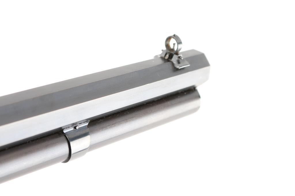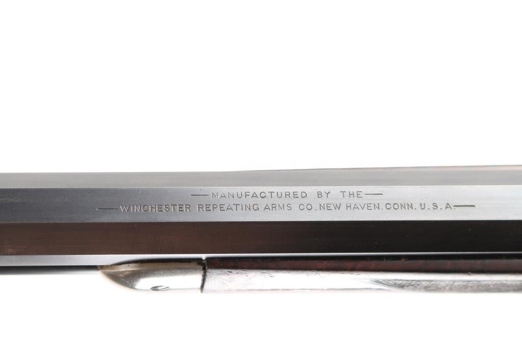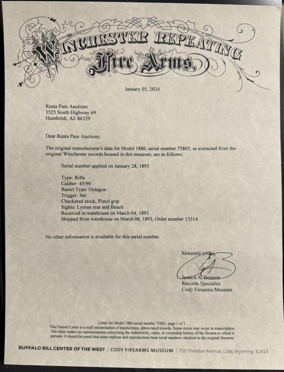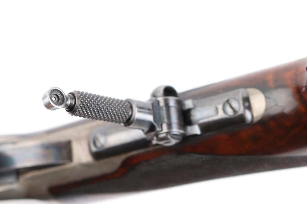 This deluxe Special order variation of the Winchester Model 1886 rifle is chambered in the very desirable 45-90, it was manufactured in 1893. 26" octagon barrel . The rifle is fitted with a special order dovetailed folding Beech combination front sight. Buckhorn elevation adjustable rear sight, and a Lyman No. 1 folding tang peep sight. The top barrel flat has the two-line Winchester address ahead of the rear sight and "45-90 W.C.F." at the breech. The lower tang has the two-line patent dates marking and the serial number. The deluxe "XX" walnut forearm and pistol grip stock feature "H" style checkering. The pistol grip stock features an ebony grip insert and is fitted with a smooth steel crescent buttplate. Special order single-set trigger. Full length magazine. Bore is near excellent/bright with a couple of small patches of very light pitting. Action is crisp/smooth, the highly figured stocks are very good, with minor scratches/dings, original blue finished barrel, & magazine has dulled somewhat, but is mostly all there, about 95% with some thinning on the magazine, slight edge/muzzle wear. Nice nitre blue on the loading gate, and the blue on the bolt is all there. The case colored receiver, hammer, lever, buttplate, & fore cap are mostly in the white, with traces remaining, mostly on the receiver. All markings are crisp/clear. NRA Condition-Excellent. Antique Firearm.