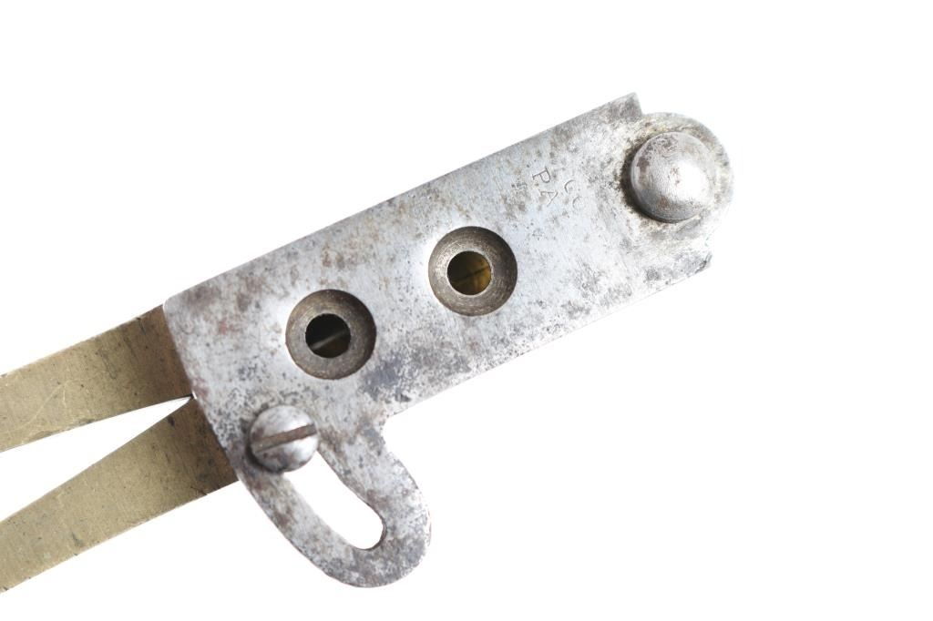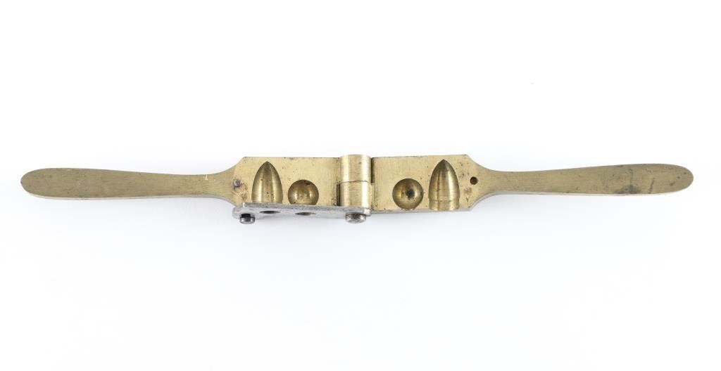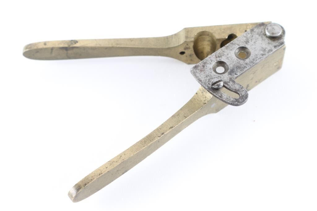 Colt's 2nd to 3rd type Dragoon mold with brass body and iron sprue cutter. Marked, "Colt's Patent". Shows minor discoloration and slight pitting. Original bright finish on sprue cutter. Straight legs. Good and little used cavities with one grease groove and one conical ball.