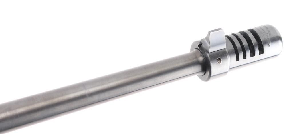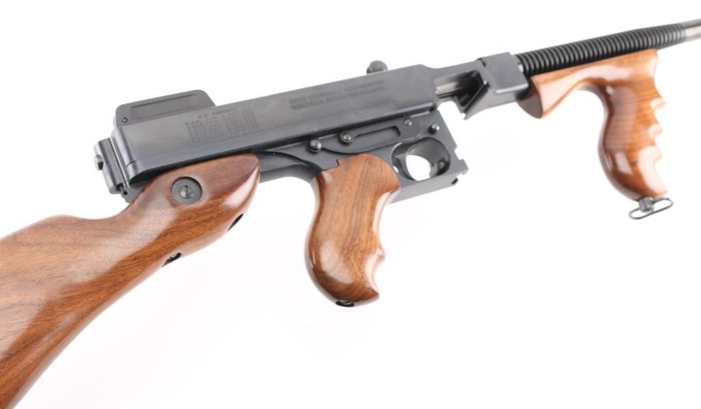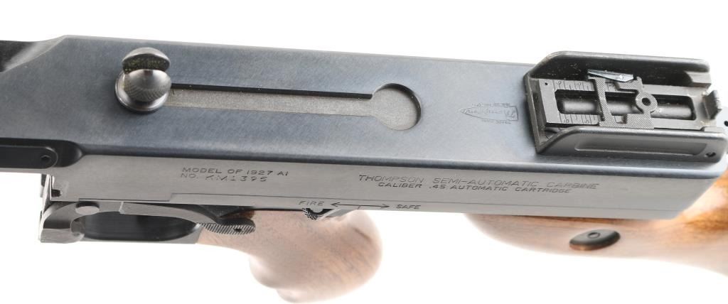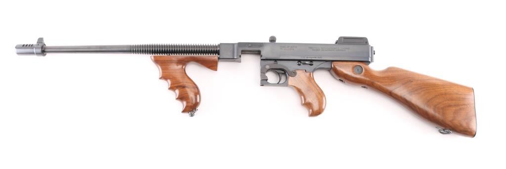 Semi-Automatic version of the Thompson Sub-Machine Gun. The "Chicago Typewriter". 18" finned barrel with pinned Cuts compensator. Blade front and flip ladder, adjustable rear sights. Blued finish with polished American Walnut fixed stock, and vertical foregrip. Steel buttplat. All correct Auto-Ordnance markings , including the "Thompson Trade Mark" bullet on the top receiver, and compensator. Sling swivel attached. Bore appears excellent/bright. Action is crisp/tight. Blue is about 98% with very minor edge wear. Wood is excellent. No magazine. NRA Condition-Excellent. Modern Firearm.
