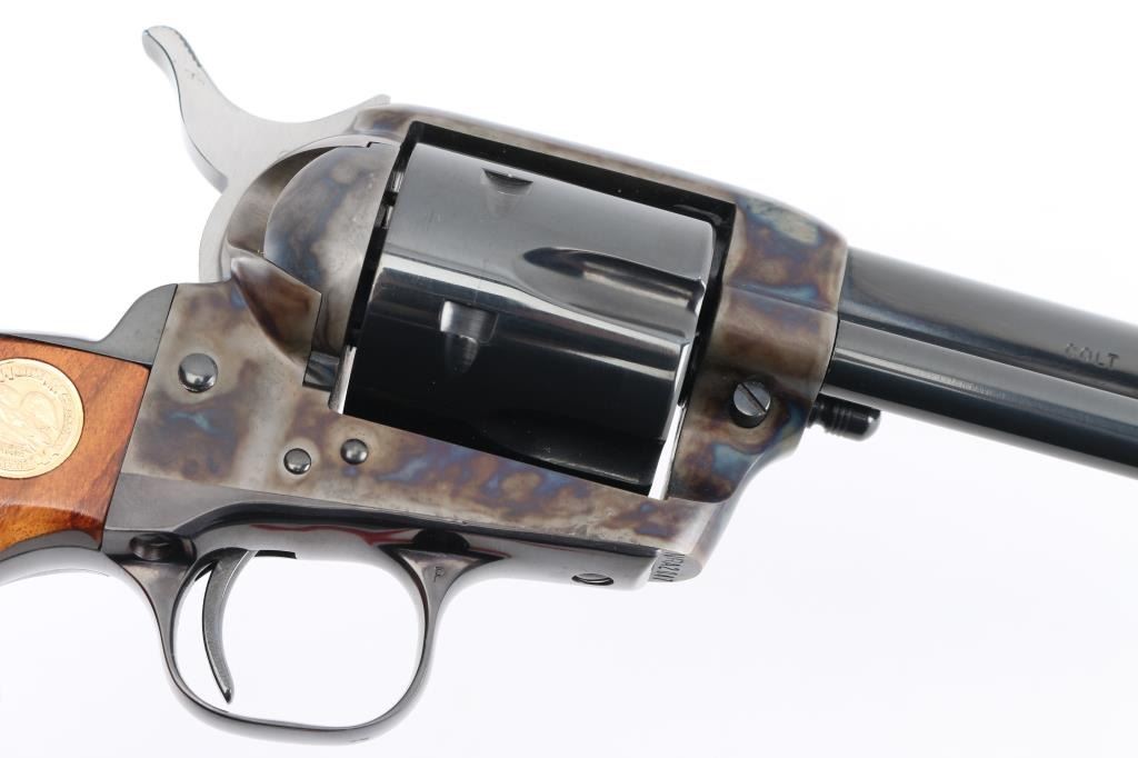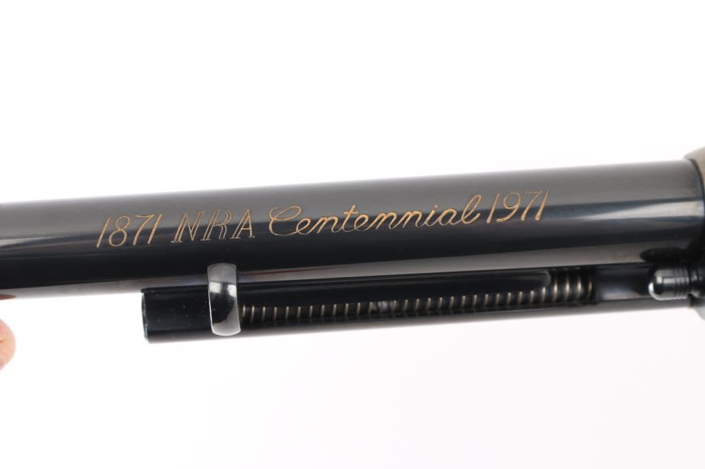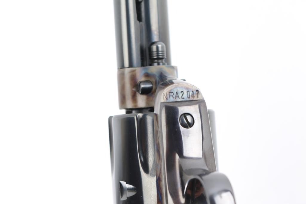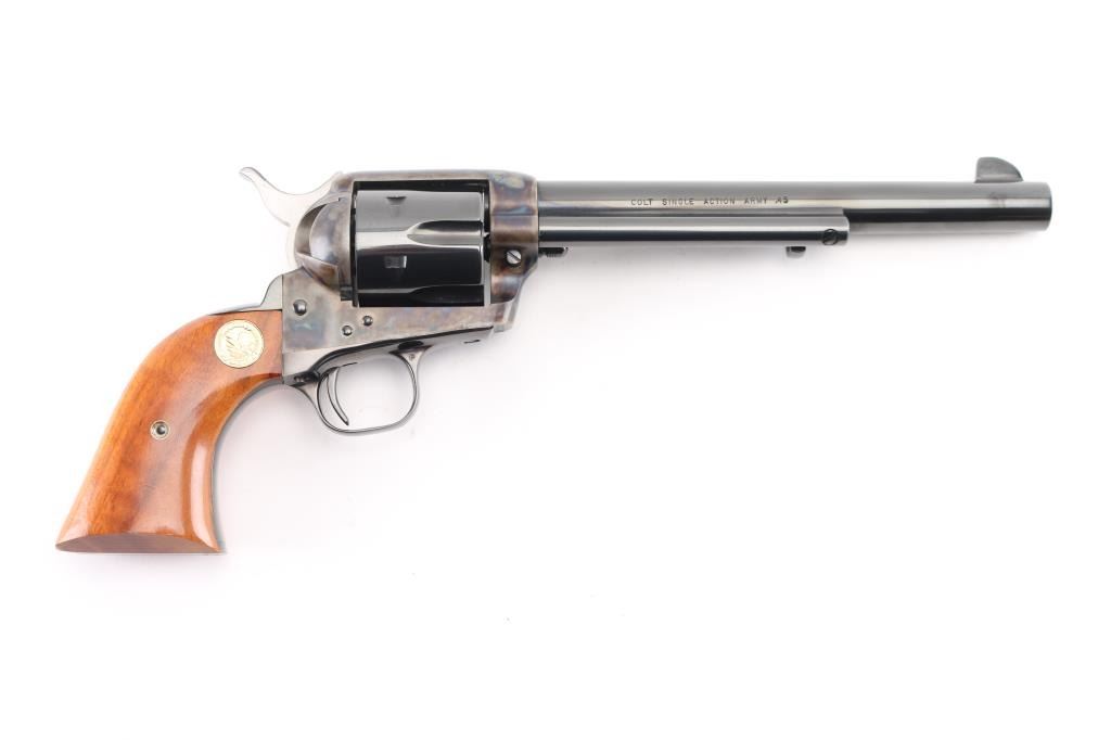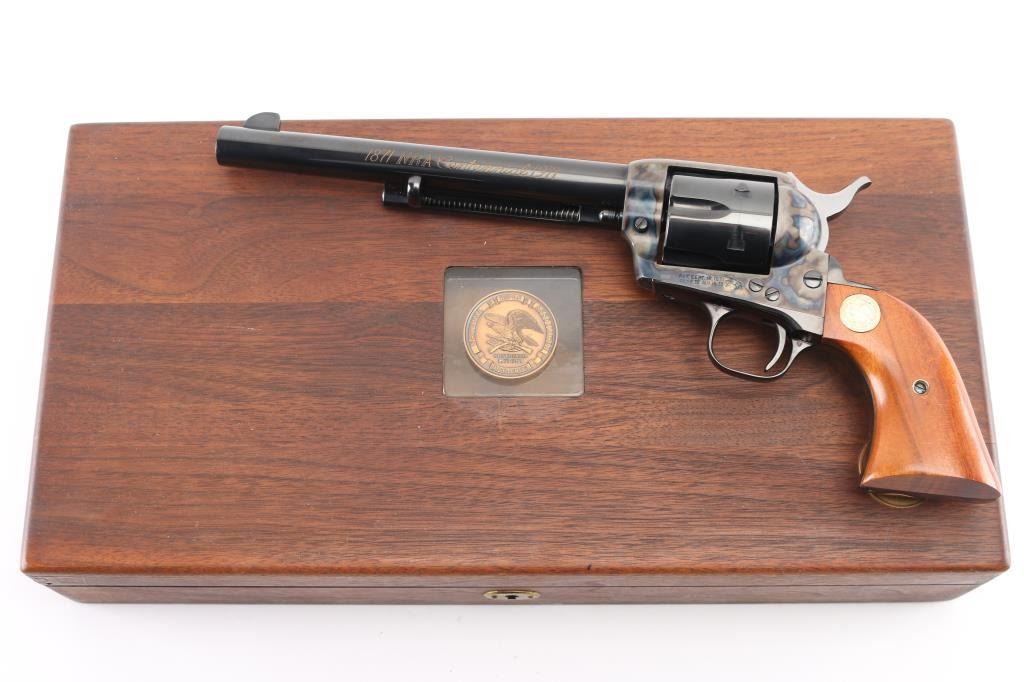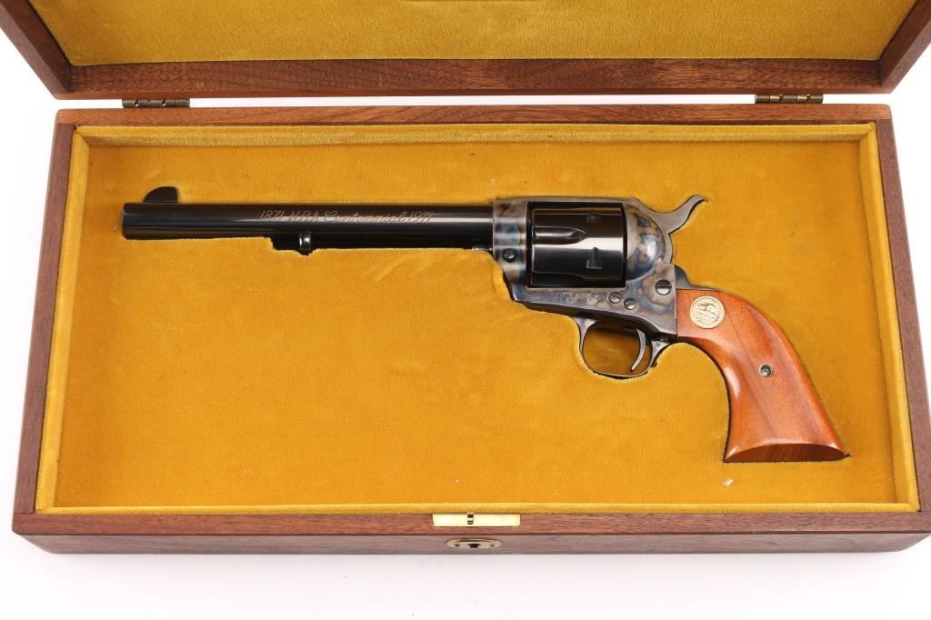 SN: NRA 2047. '1871 NRA Centennial 1971' Commemorative revolver features 7.5" barrel, blued/case colored finish, two piece walnut grips with NRA emblem medallions. Gold fill in roll marks on barrel are very good, with slight loss to left side markings. Retains over 98% finish with very few handling marks. Bore is very good/bright, action is crisp/tight. Includes locking walnut display case, fitted with dark yellow lining, missing key. NRA, and Colt medallions on case. Condition is NRA Very Good++. C&R Firearm.