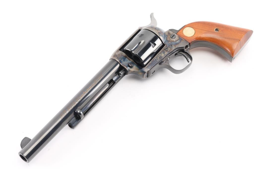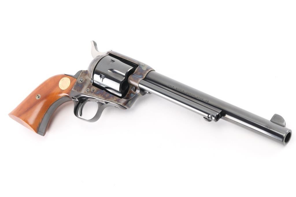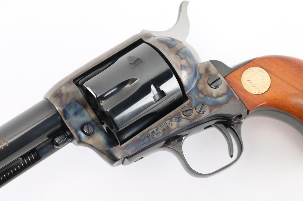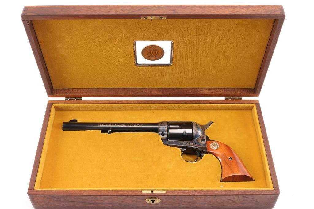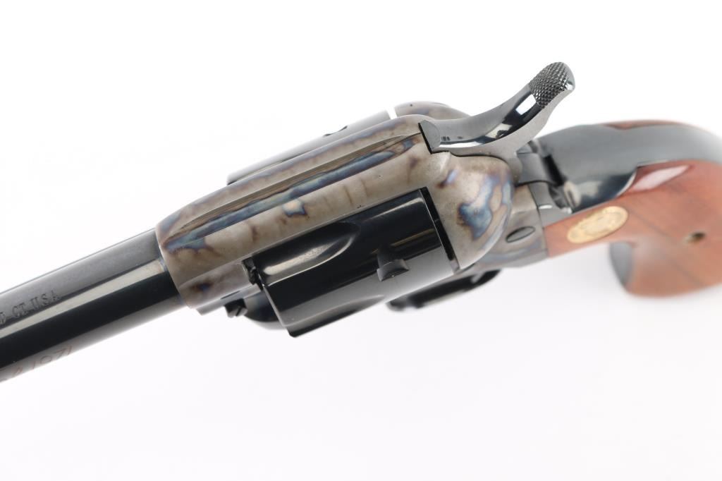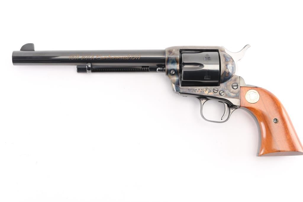 SN: NRA 2047. '1871 NRA Centennial 1971' Commemorative revolver features 7.5" barrel, blued/case colored finish, two piece walnut grips with NRA emblem medallions. Gold fill in roll marks on barrel are very good, with slight loss to left side markings. Retains over 98% finish with very few handling marks. Bore is very good/bright, action is crisp/tight. Includes locking walnut display case, fitted with dark yellow lining, missing key. NRA, and Colt medallions on case. Condition is NRA Very Good++. C&R Firearm.