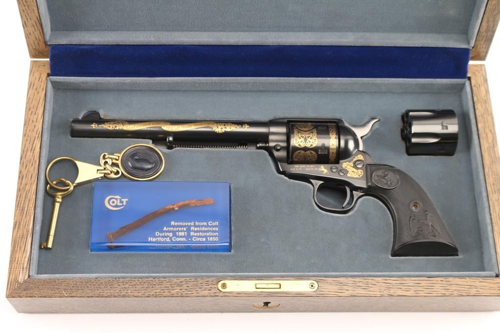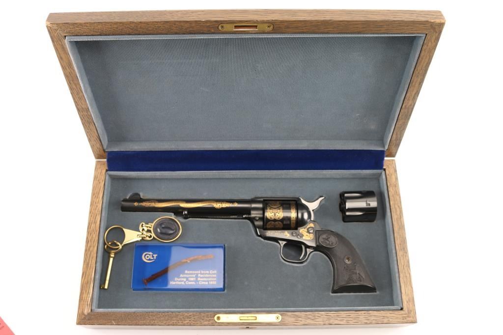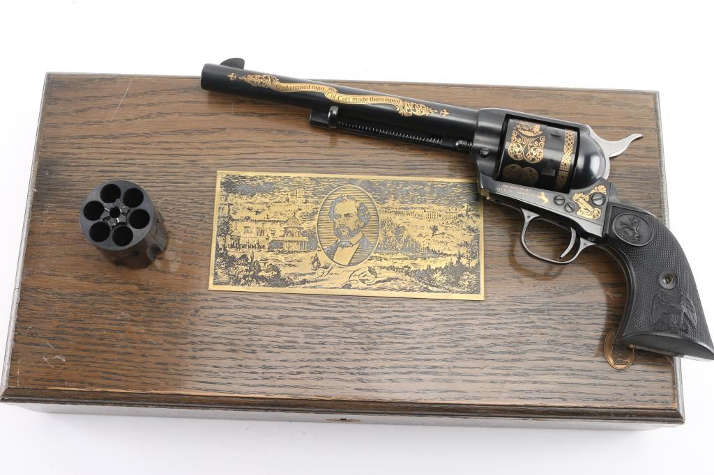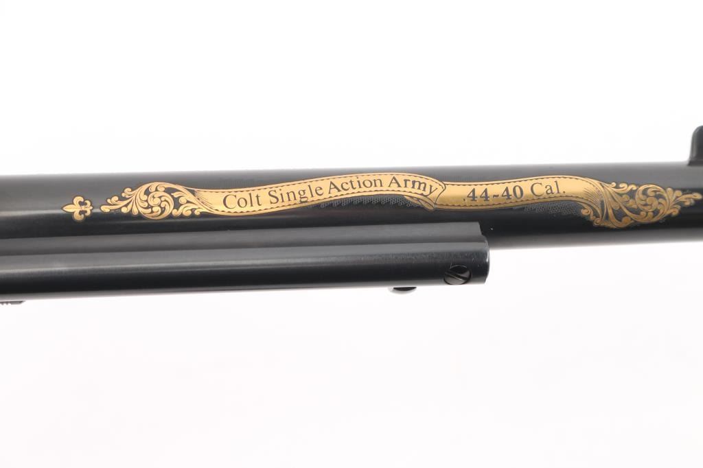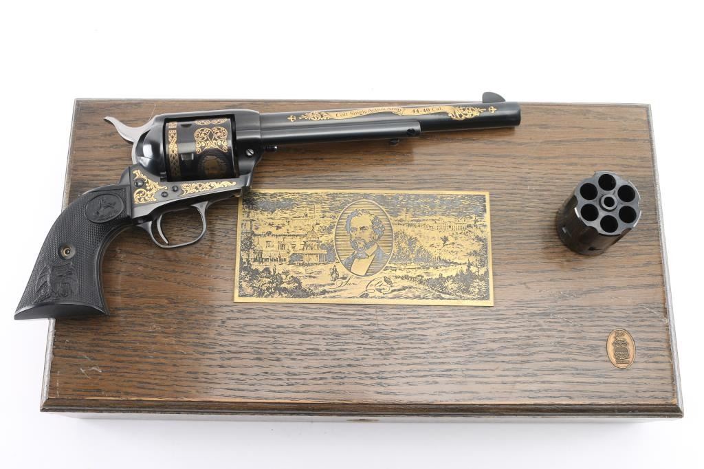 Colt single action army "Sam Colt", .44-40 cal revolver. Third Generation. Commemorative limited edition of 1000 from the Colt Custom Shop in 1987. 7 1/2" barrel, blue/black finish, gold inlays and vintage looking "Eagle" black checkered grips. Gold inlays on cylinder show Sam Colt as an older man and also as a young man discovering the Colt mechanism. Gold banner on left side of barrel proclaims the frontier creed: "God created man... Col. Colt made them equal". Right side of the barrel also has a gold banner stating: "Colt Single Action Army .44-40 cal." Gold scroll engraving on frame with prancing Colt and patent dates in gold as well as "1/1000". In blue/gray felt lined oak display box with nail in Lucite block from Colt armorer's residence removed during the 1981 restoration from Hartford CT, and a blue, fluted extra cylinder. Lid has brass plaque with Sam Colt image with armory in the background, & Colt custom shop medallion. Come with working skeleton key. Condition: NRA Excellent. Modern Firearm.