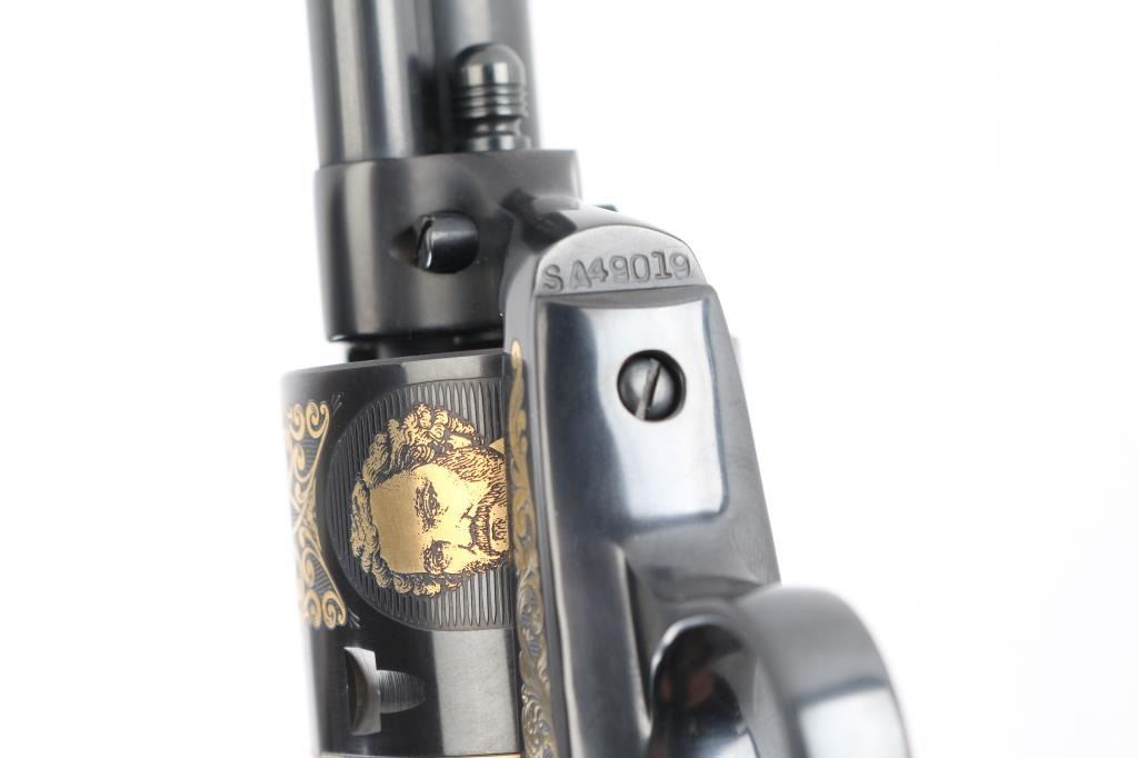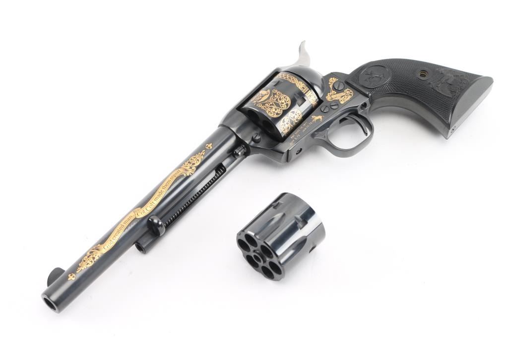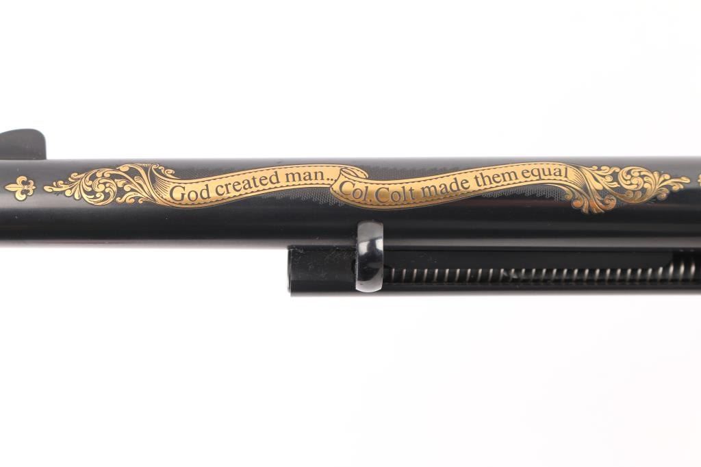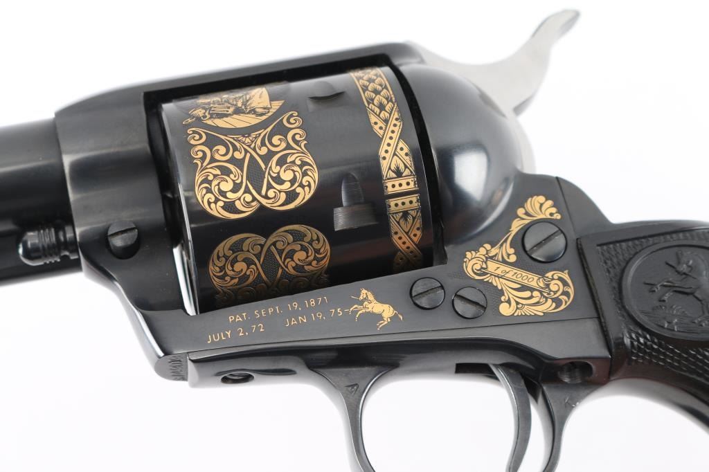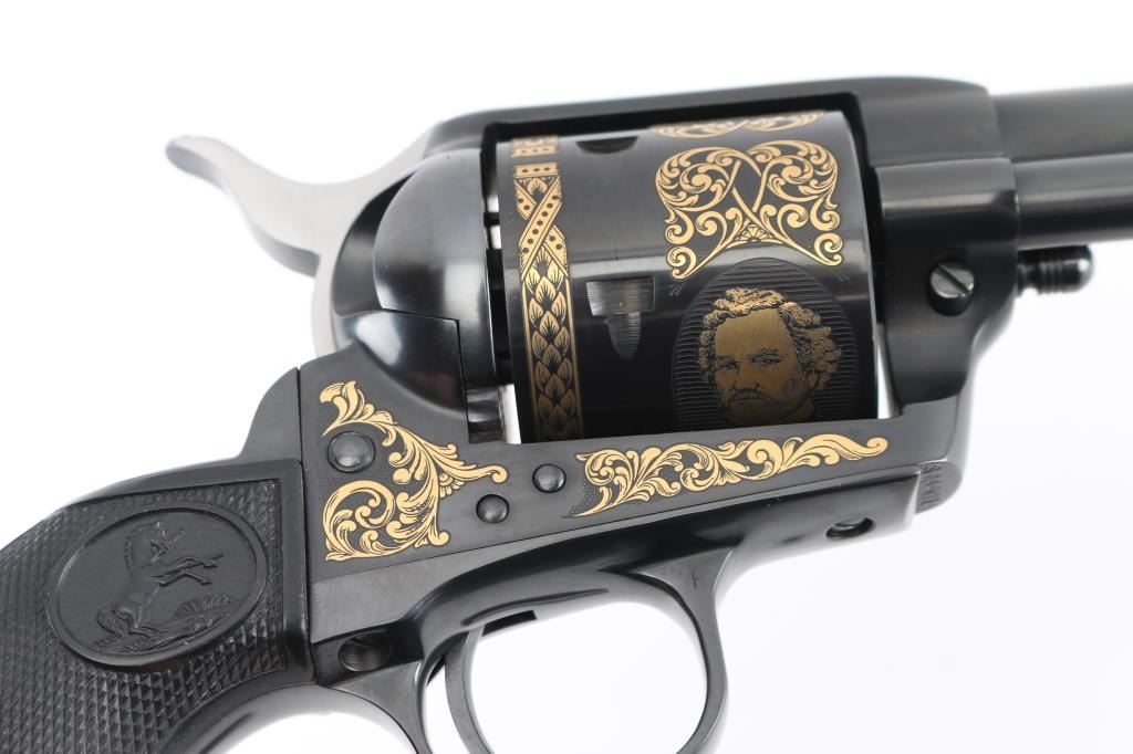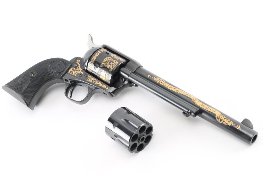 Colt single action army "Sam Colt", .44-40 cal revolver. Third Generation. Commemorative limited edition of 1000 from the Colt Custom Shop in 1987. 7 1/2" barrel, blue/black finish, gold inlays and vintage looking "Eagle" black checkered grips. Gold inlays on cylinder show Sam Colt as an older man and also as a young man discovering the Colt mechanism. Gold banner on left side of barrel proclaims the frontier creed: "God created man... Col. Colt made them equal". Right side of the barrel also has a gold banner stating: "Colt Single Action Army .44-40 cal." Gold scroll engraving on frame with prancing Colt and patent dates in gold as well as "1/1000". In blue/gray felt lined oak display box with nail in Lucite block from Colt armorer's residence removed during the 1981 restoration from Hartford CT, and a blue, fluted extra cylinder. Lid has brass plaque with Sam Colt image with armory in the background, & Colt custom shop medallion. Come with working skeleton key. Condition: NRA Excellent. Modern Firearm.