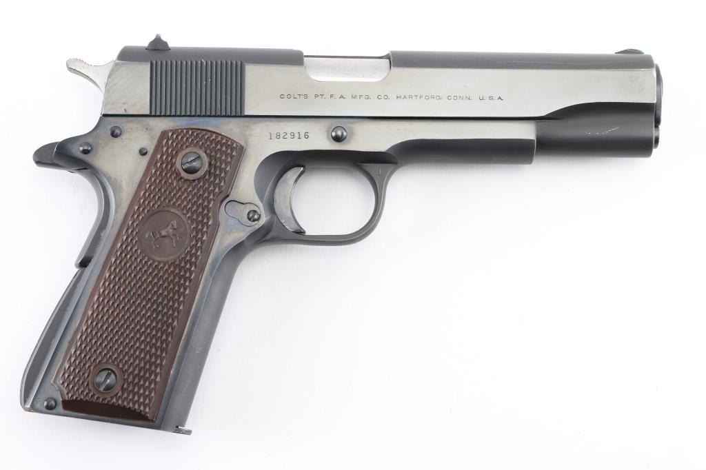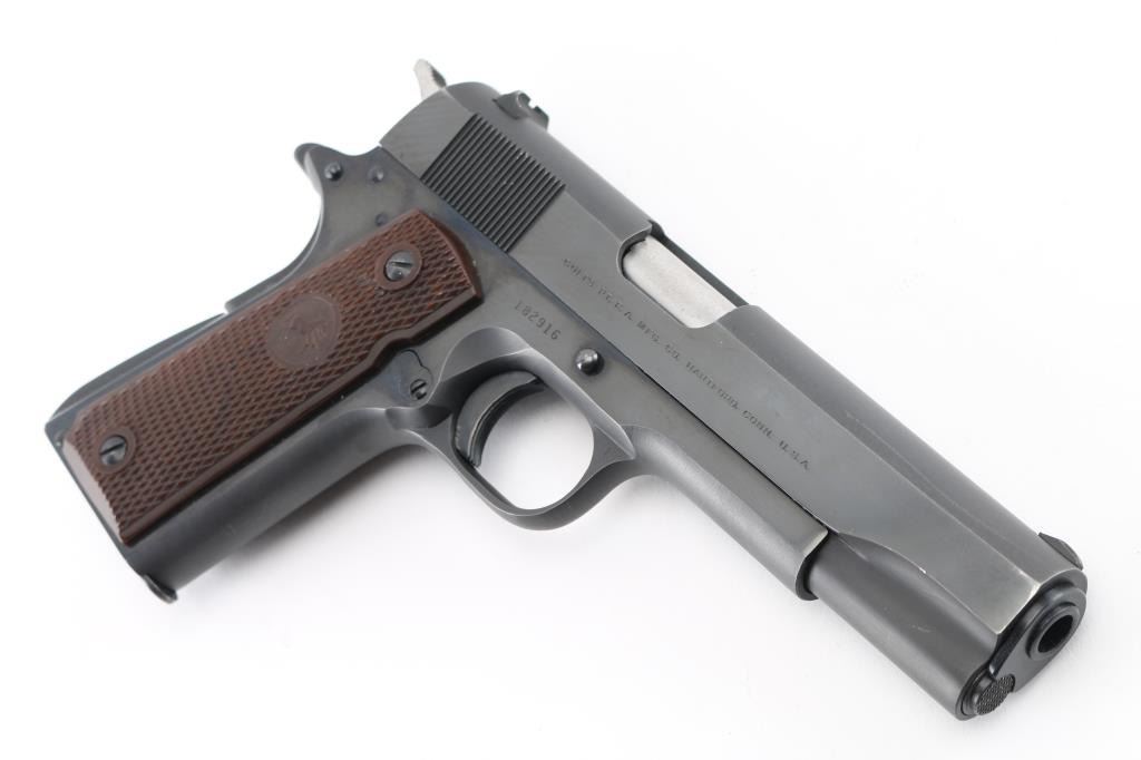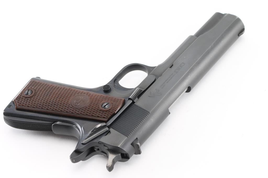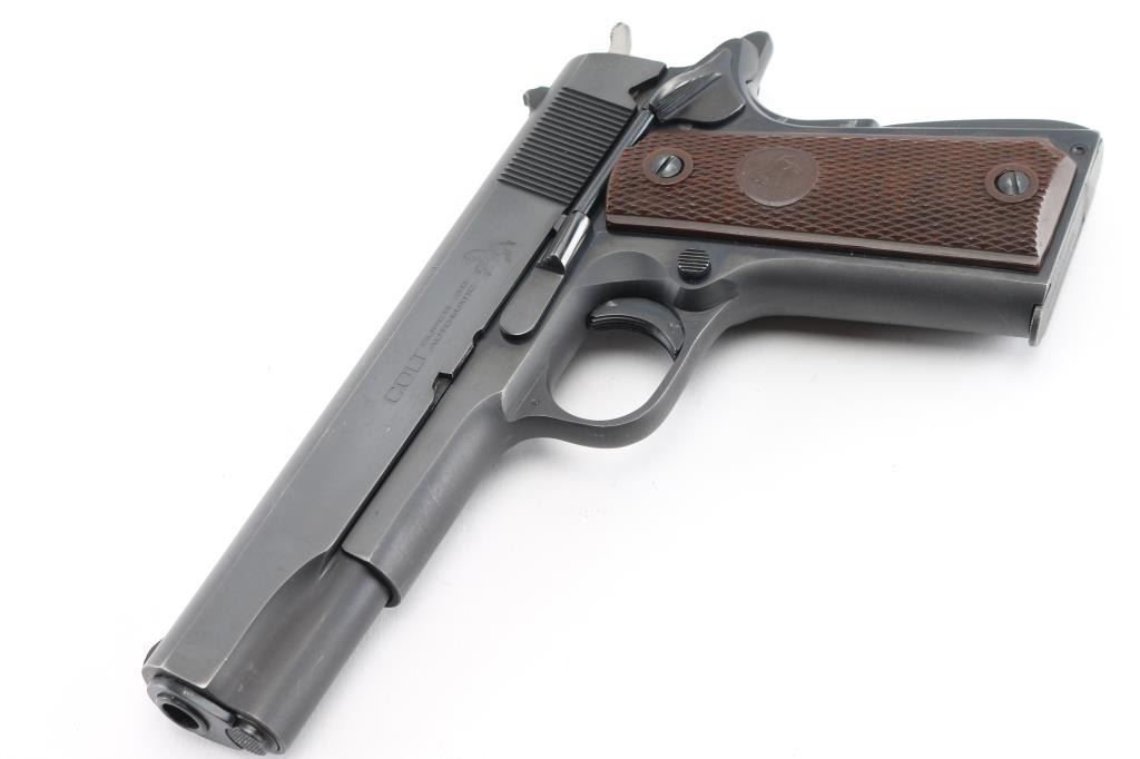 1911A1 pattern single action semi-automatic pistol manufactured circa 1966. Features polished blued finish with matte blue on flats, 5" barrel, serrated ramp front sight, notch rear sight in dovetail, grooved trigger, checkered spur hammer with polished sides, thumb safety on the left side of the frame, grip safety, push button magazine release, steel frame, serrated arched mainspring housing, checkered brown plastic "Coltwood" grips with Rampant Colt logo. Bore is pristine. Retains 95% finish with minor edge/muzzle wear, some minor scratches on left side of slide showing a little bare metal, edge wear. Grips are very good condition. Includes (1) Colt magazine. Condition is NRA Near Excellent. C&R firearm.