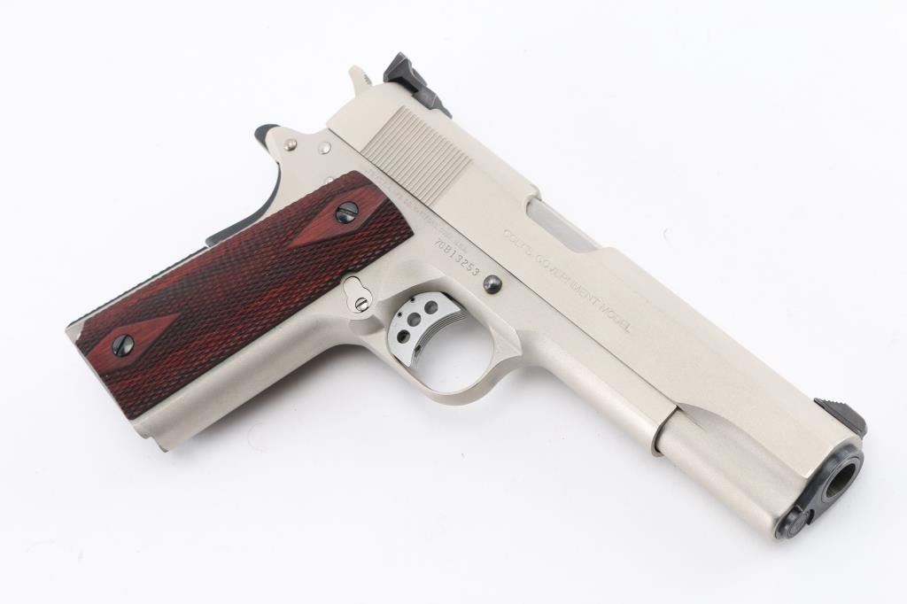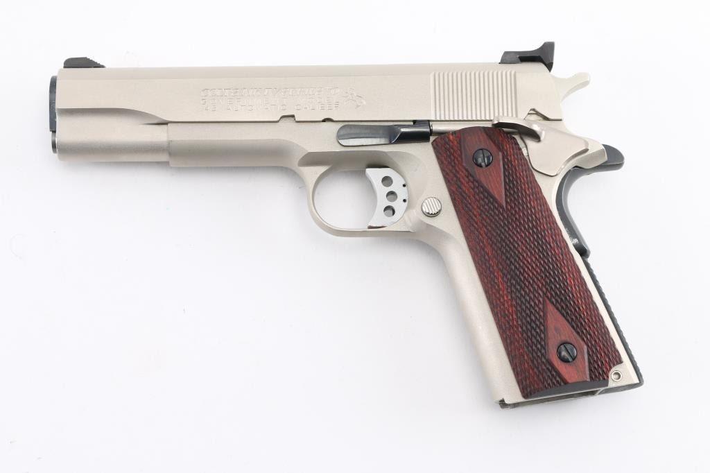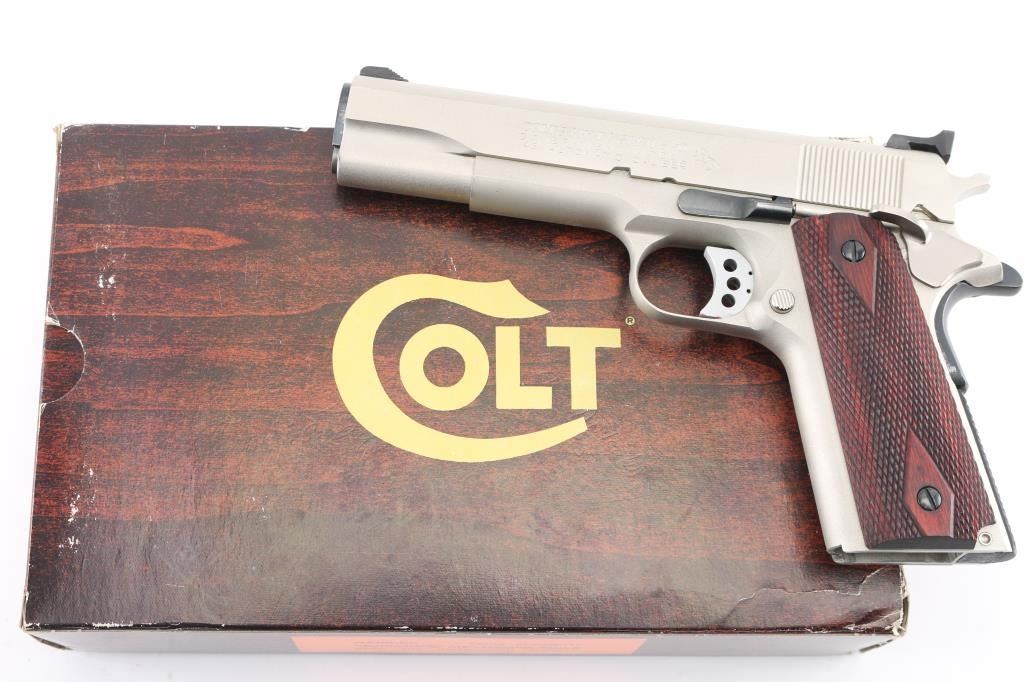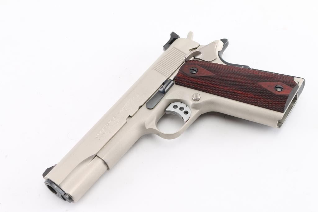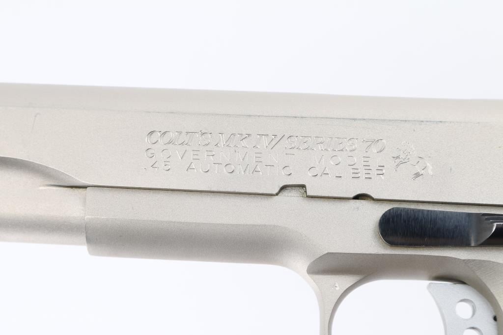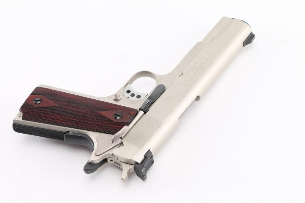 'MK IV/Series 70' 1911A1 pattern single action semi-automatic pistol manufactured circa 1982. Features stainless steel construction, satin finished metal with , 5" barrel, serrated blade front sight, square notch rear sight in dovetail, serrated lightweight trigger, serrated hammer, thumb safety on the left side of the frame, grip safety, push button magazine release, checkered flat mainspring housing, checkered diamond wood grips. King gun works recoil spring guide. Bore is excellent/bright. External surfaces are very good to excellent condition, with some minor scratches. Action is smooth and the grips are very good. No magazine. Comes in original factory box with documents. Condition is NRA Excellent. Modern Firearm.