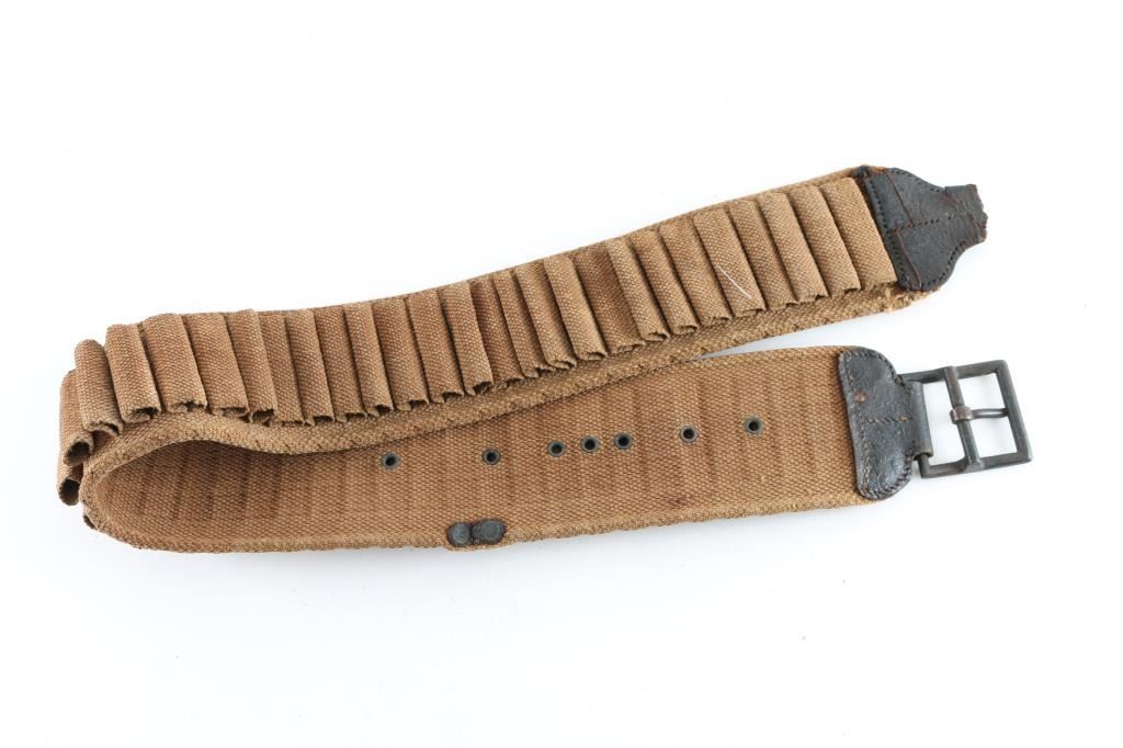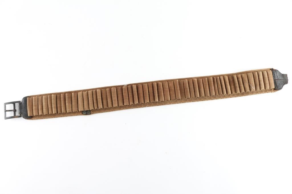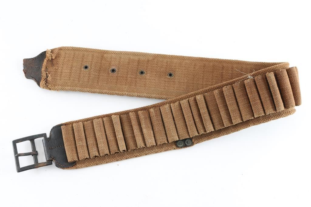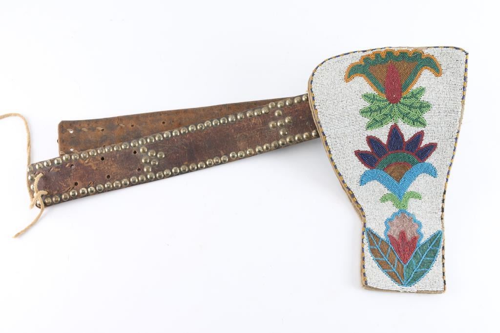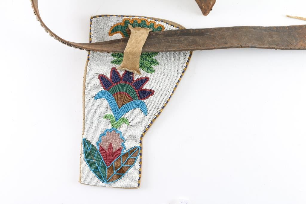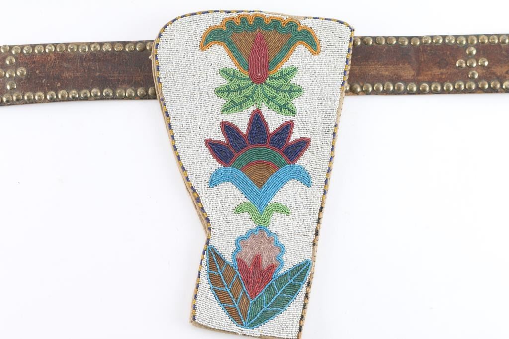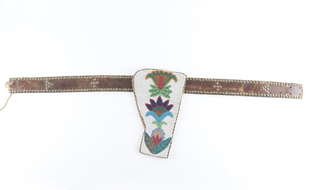 Leather spotted belt Blackfoot made with a floral Cree beaded holster both sides fully beaded for a large frame revolver. Holster 12"x7" Belt is 43" end to end. Includes a Prairie style webbed cartridge belt, fair condition, leather tongue missing.