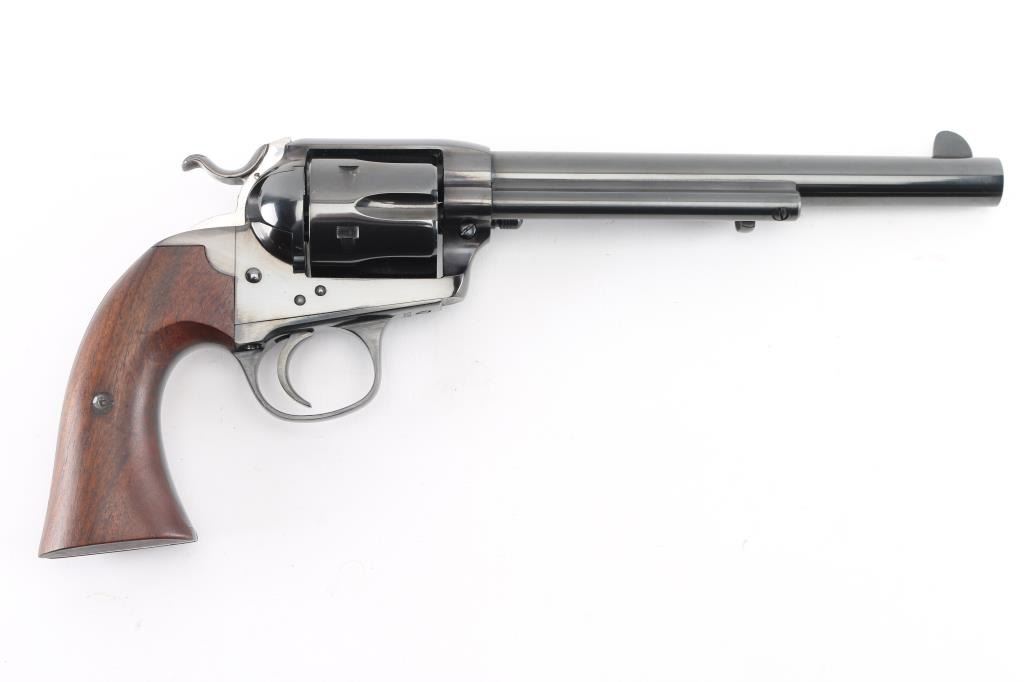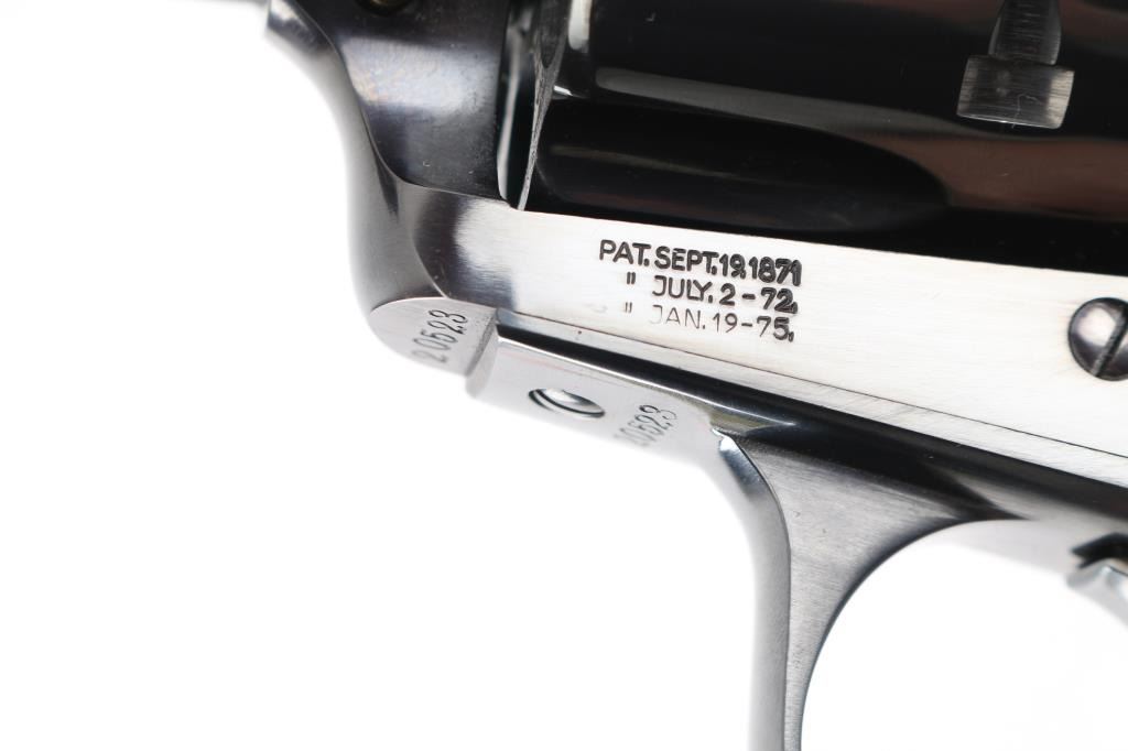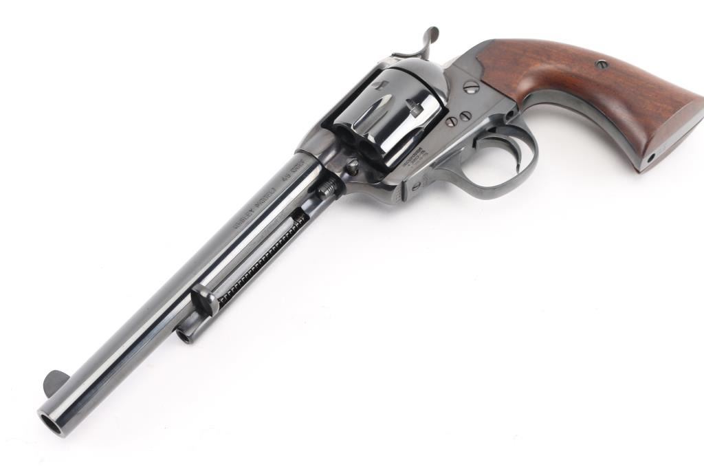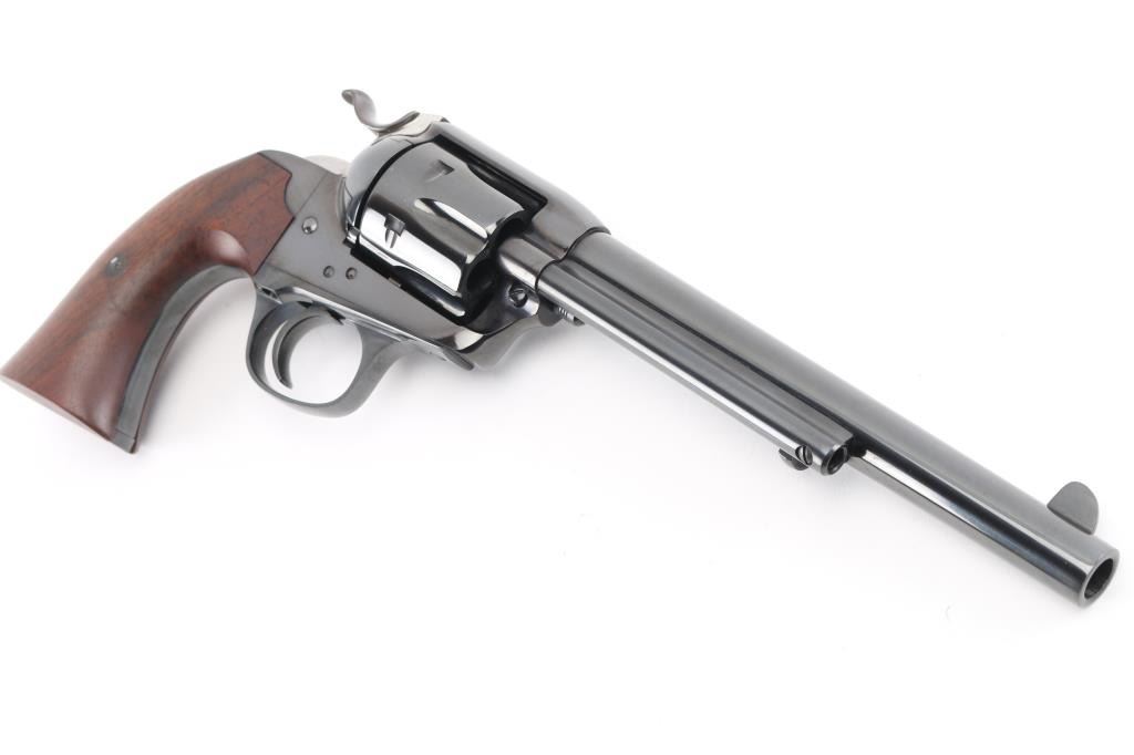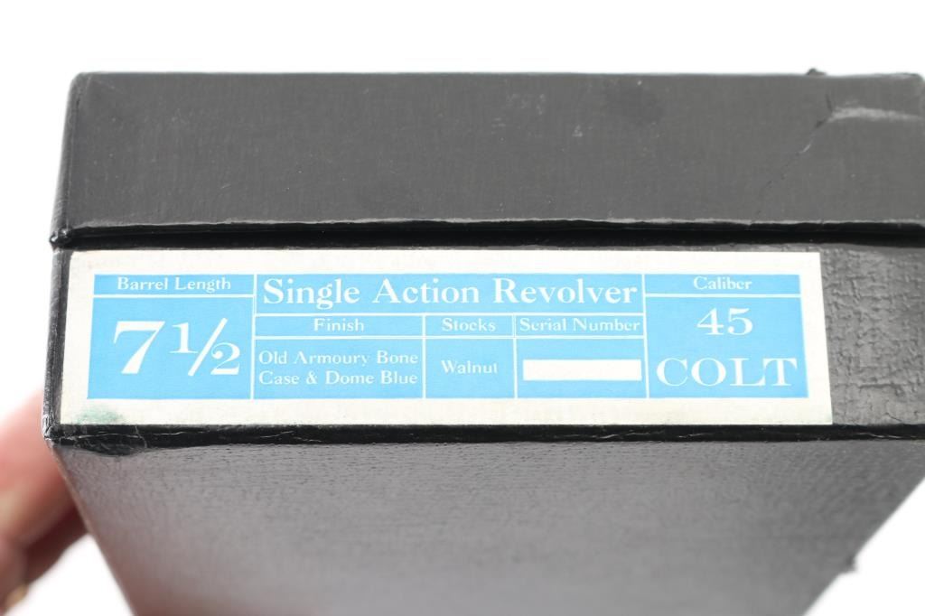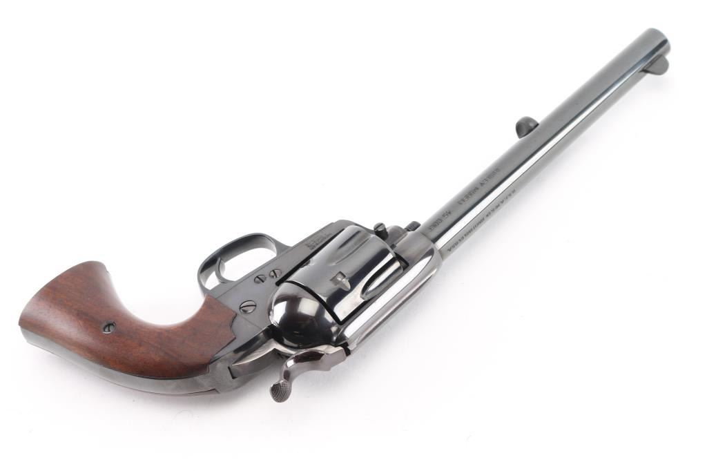 Exceptional single-action revolver chambered in .45 Colt, produced by United States Fire Arms Mfg. Co. based out of The Colt Armory complex in Hartford, Connecticut. The company is renowned for their superb quality and finish but went out of business in 2011. This revolver features blued finish, 7.5" barrel, blade front sight, 'v' notched rear sight, cresent ejector, fluted six-shot cylinder, black powder patent dated, 1st gen hammer spur checkering, and smooth one-piece walnut grip. All visible serial numbers match and the barrel is marked with the single line USFA address on the top. Bore and charge holes are bright, excellent condition. Retains approximately 99% of it's original blue finish. Wood grip is excellent. Action is smooth with tight lock up. Includes black cardboard factory box, with paperwork. Like new. Condition is NRA Excellent. Modern Firearm.