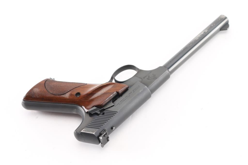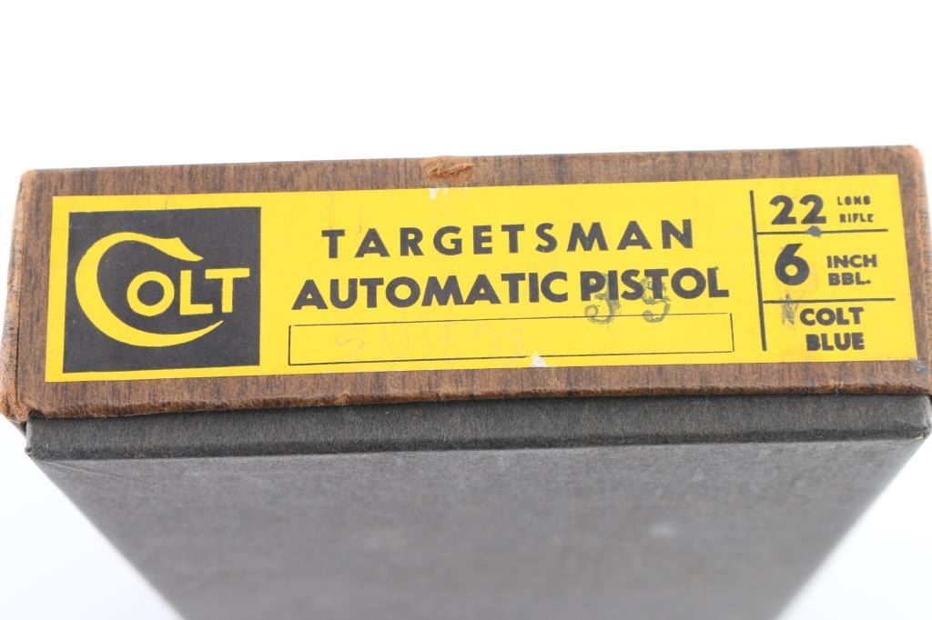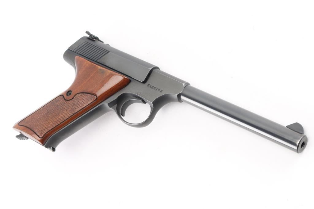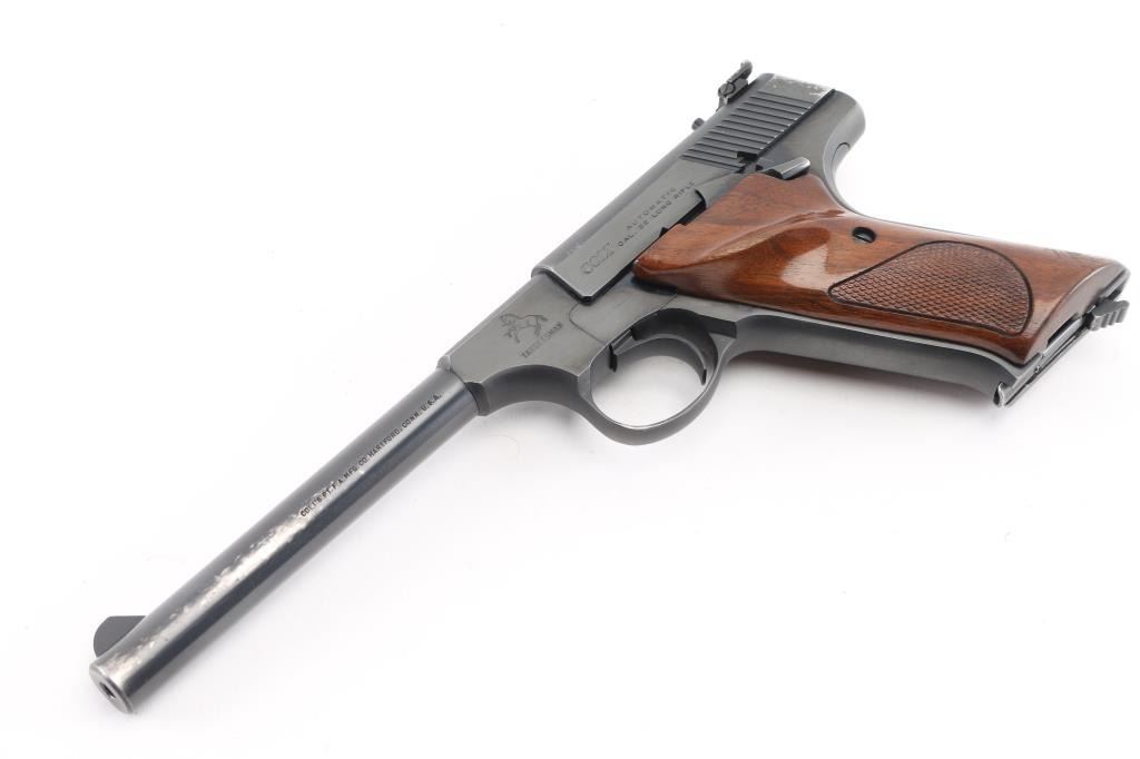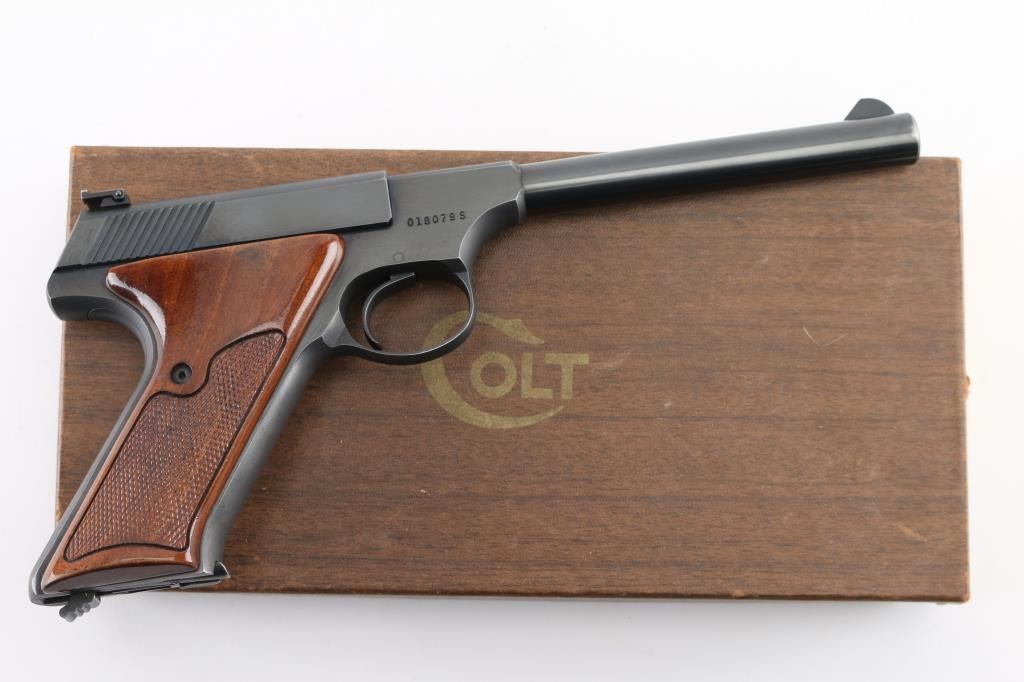 Third Series' Minty single action semi-automatic target pistol chambered for .22 Long Rifle, circa 1959-1977. Approximately only 65,000 of these pistol were ever produced. This one manufactured in 1969. Features a blued finish, 6" straight tapper barrel, blade front sight, adjustable rear target sight, smooth trigger, factory 10 round magazine, thumb safety/slide stop, and two-piece checkered wood thumb rest target grips. Includes a period Colt wood grain cardboard box with correct label, cleaning brush, documents and the serial number written on the underside of the box in sharpie (Mismatched). Pistol retains approximately 92% of it's original blued finish muzzle wear, and some finish loss/holster wear on the left barrel, and left rear of slide. Action is smooth, bore is excellent and grips are fine. Condition is very Good. C&R Firearm.