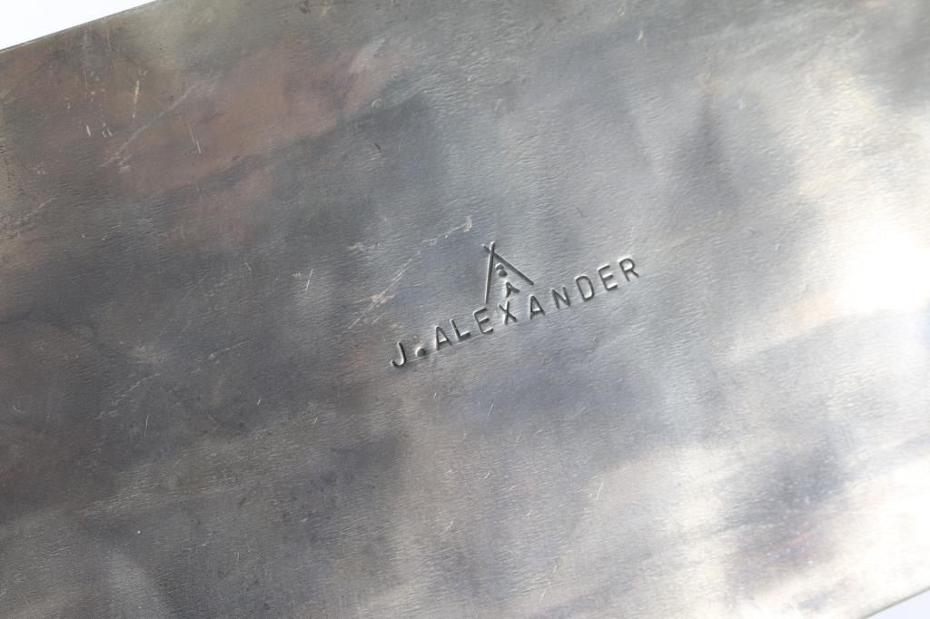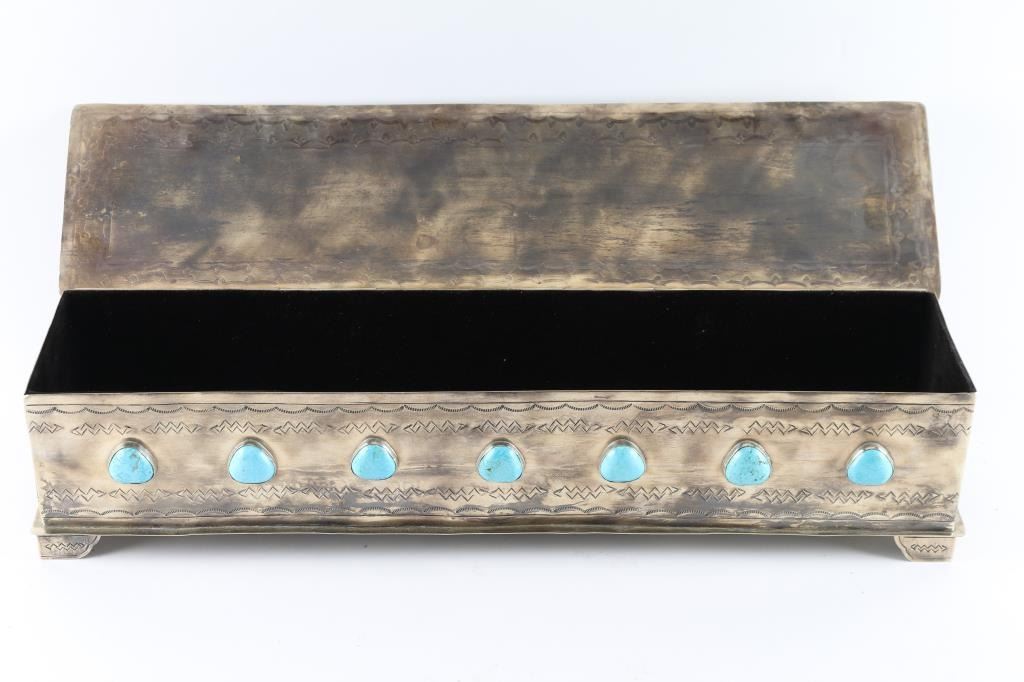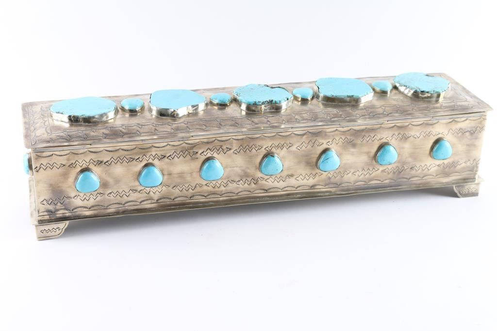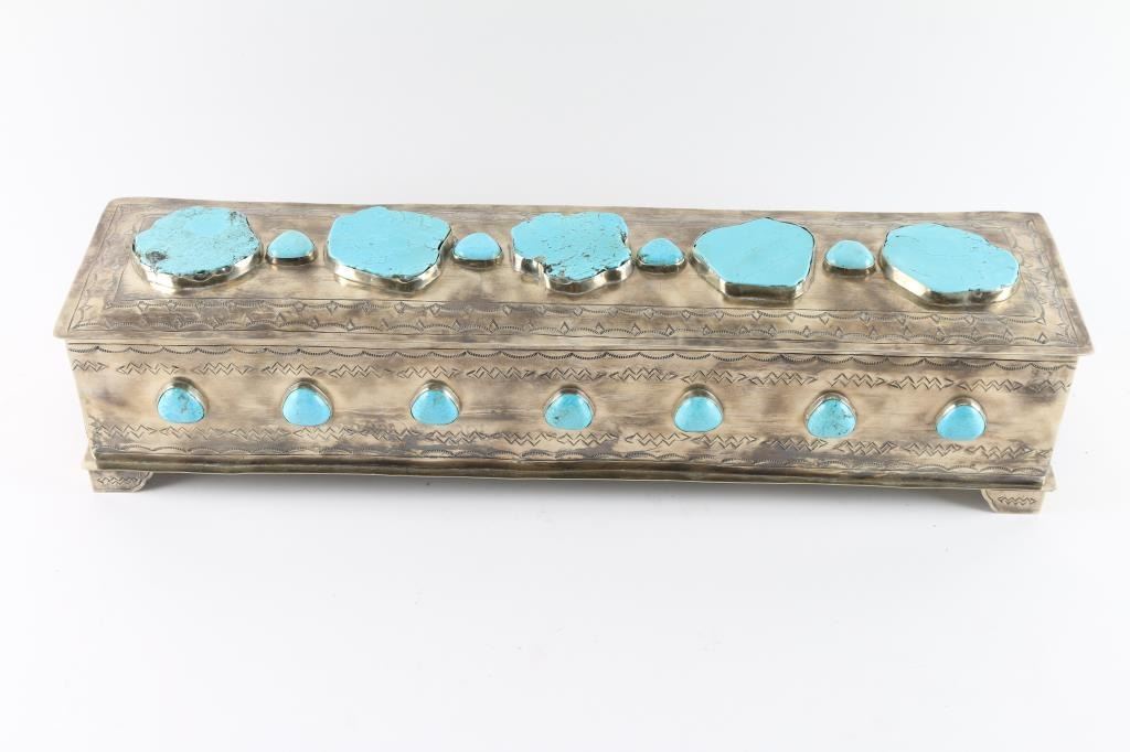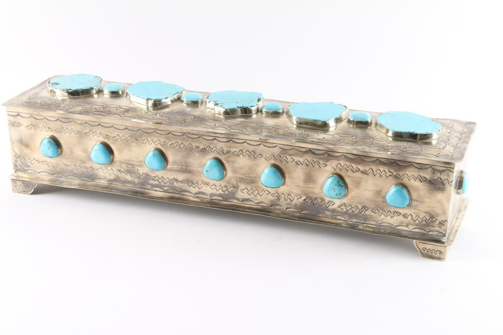 made by J. Alexander signed on base. Measures 26"x6"x4" black lined includes large pieces of turquoise inlaid in top and sides. Simply stunning.