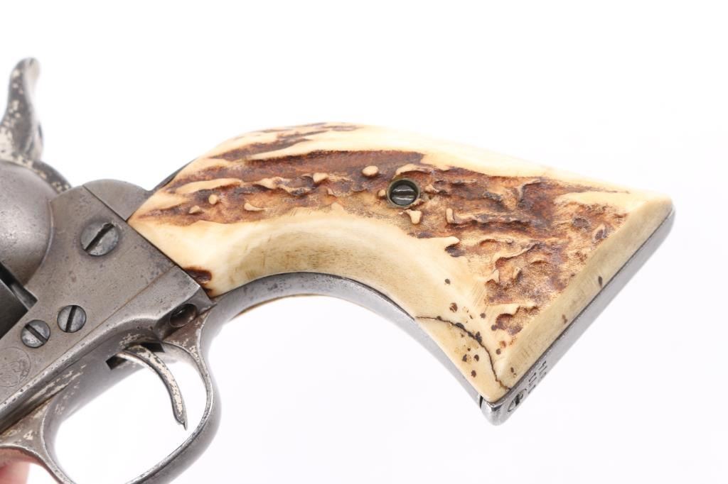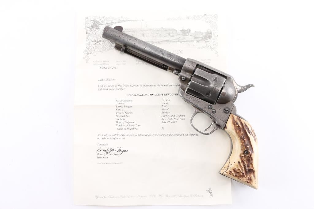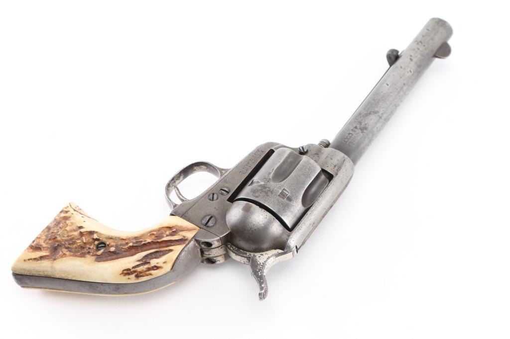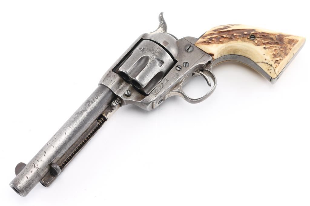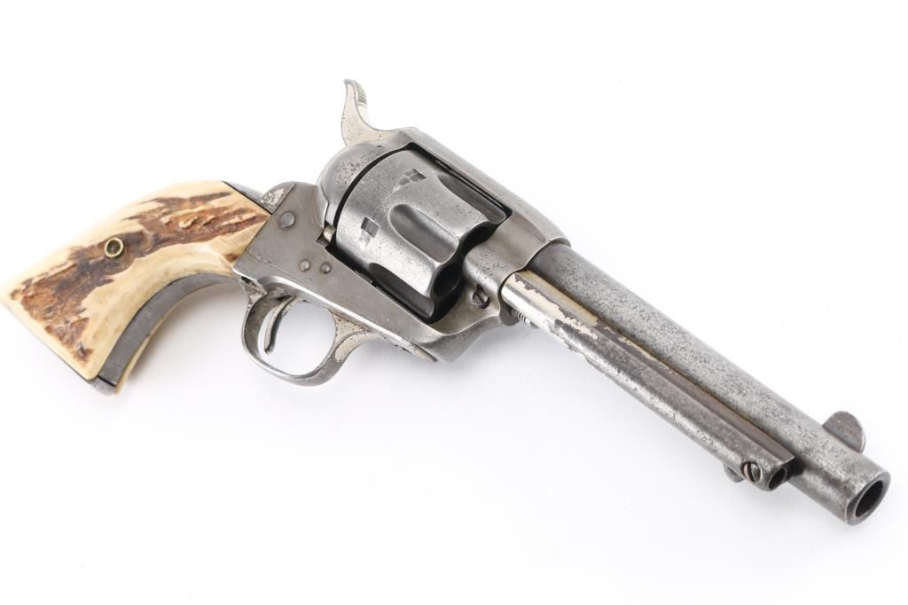 This revolver was manufactured in what is known as the "Blackpowder Transition" period. Serial numbers 165,000-182,000 (1896-1899) to distinguish SAA's made with modern, stronger frames yet still considered antique by federal law that uses 01-01, 1899 as the beginning off the modern gun era. Single-Action. 6-rd capacity. 1st Generation manufactured 1897. 5.5" barrel with front blade and v-notch rear sights. Top of barrel stamped "COLT'S PT.F.A.MFG. CO HARTFORD CT. U.S.A." Patent dates on the left frame, with Rampant Colt in circle. "45 Cal" stamped on left barrel. The serial number matches on the frame, triggerguard, and backstrap, Assembly # 176 on the loading gate. Comes with Colt factory letter which interestingly states the revolver was shipped July 29, 1897 in .44-40 cal. the .45 cal barrel, & cylinder, appear to have been on the gun for a very long time with matching finish & wear, shipped to Hartley & Graham in NYC with nickel finish,& hard rubber grips. Bore is good with strong rifling, scattered areas of pitting are present. Cylinders appears good. Action is crisp, and hammer locks up tight. Traces of the original nickel finish are present on the hammer, top of the backstrap, triggerguard, & the ejector housing. It now has real vintage stag grips, good overall with a small crack on the bottom left grip. An Interesting SAA. NRA Condition-Very Good. Antique Firearm.
