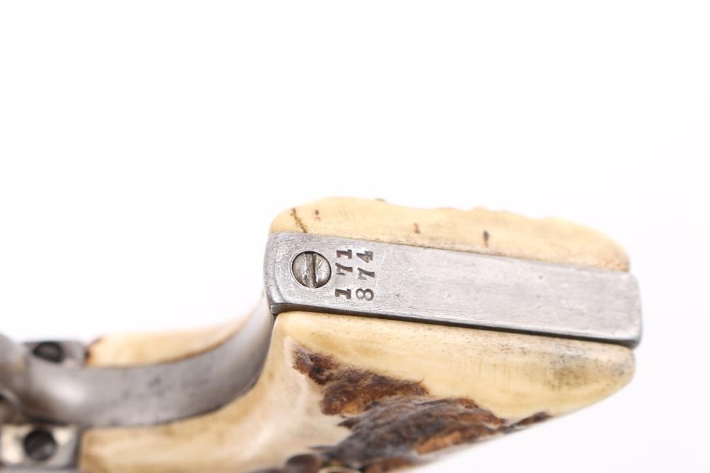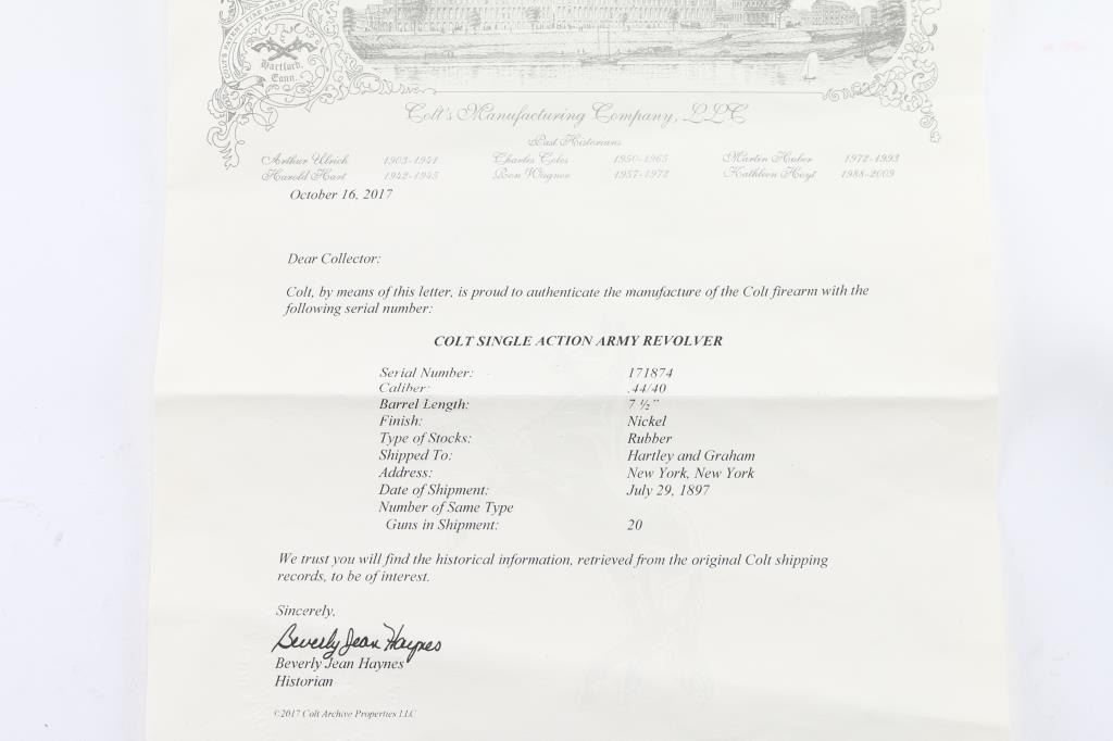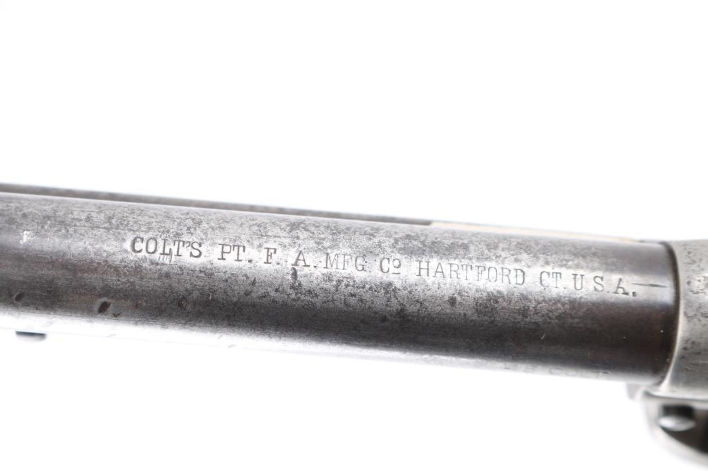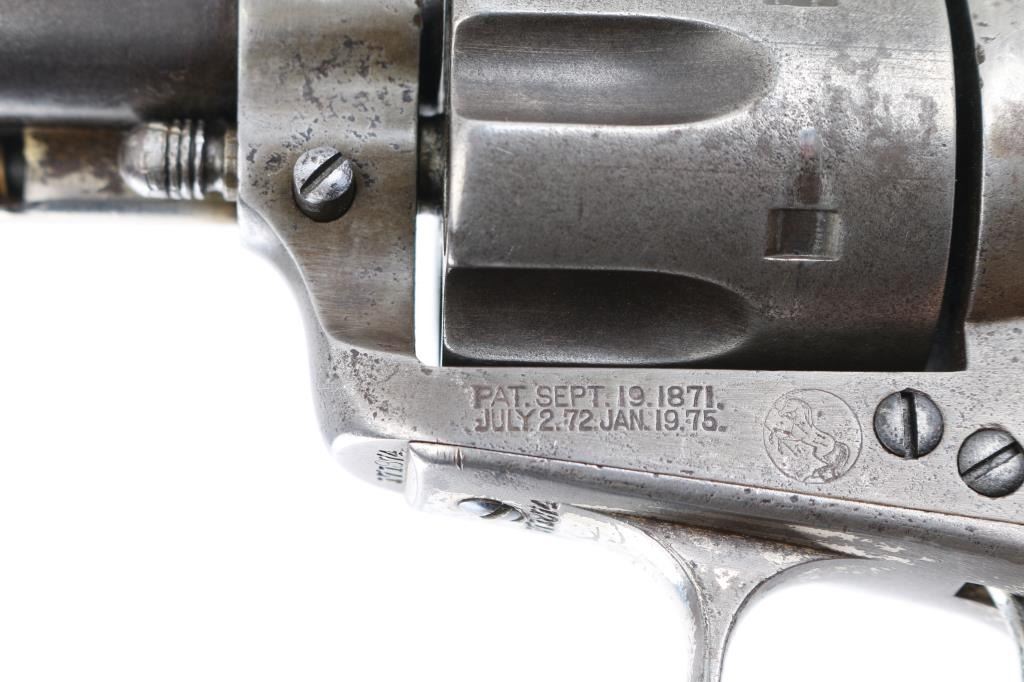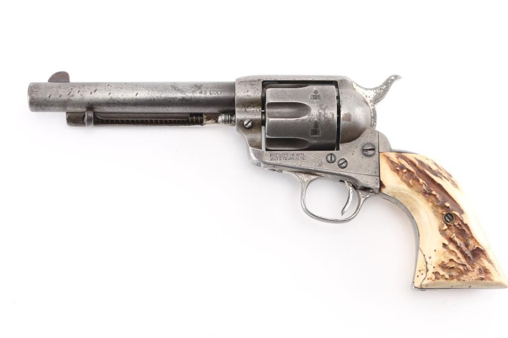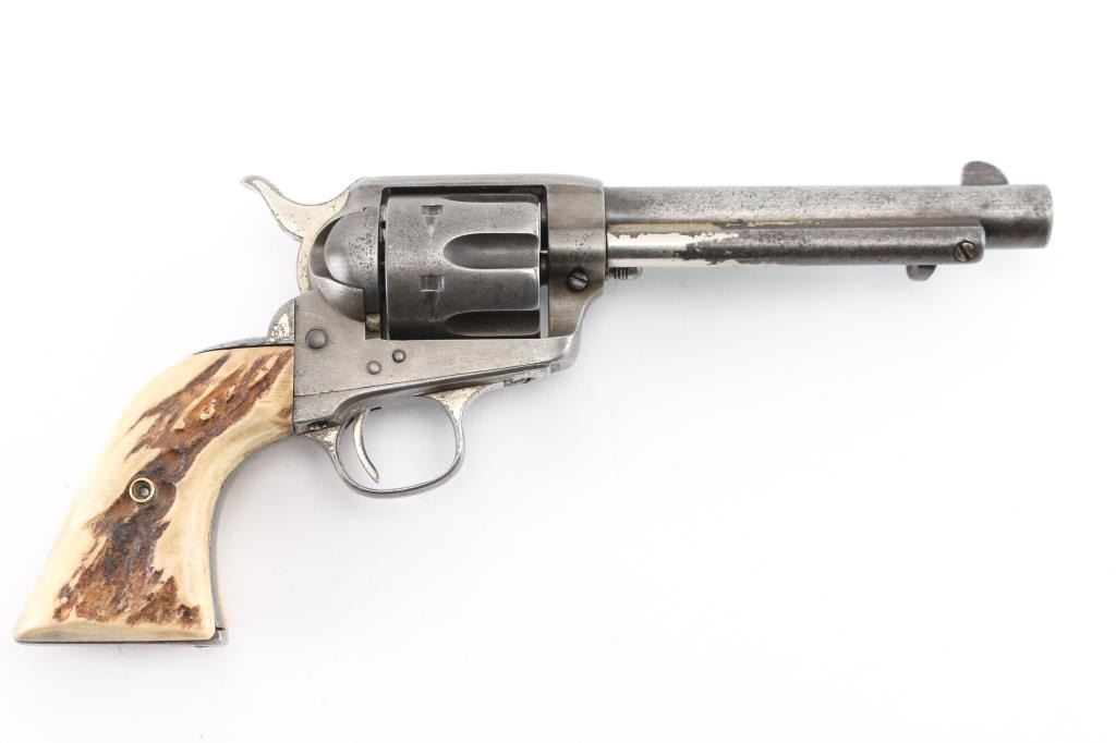 This revolver was manufactured in what is known as the "Blackpowder Transition" period. Serial numbers 165,000-182,000 (1896-1899) to distinguish SAA's made with modern, stronger frames yet still considered antique by federal law that uses 01-01, 1899 as the beginning off the modern gun era. Single-Action. 6-rd capacity. 1st Generation manufactured 1897. 5.5" barrel with front blade and v-notch rear sights. Top of barrel stamped "COLT'S PT.F.A.MFG. CO HARTFORD CT. U.S.A." Patent dates on the left frame, with Rampant Colt in circle. "45 Cal" stamped on left barrel. The serial number matches on the frame, triggerguard, and backstrap, Assembly # 176 on the loading gate. Comes with Colt factory letter which interestingly states the revolver was shipped July 29, 1897 in .44-40 cal. the .45 cal barrel, & cylinder, appear to have been on the gun for a very long time with matching finish & wear, shipped to Hartley & Graham in NYC with nickel finish,& hard rubber grips. Bore is good with strong rifling, scattered areas of pitting are present. Cylinders appears good. Action is crisp, and hammer locks up tight. Traces of the original nickel finish are present on the hammer, top of the backstrap, triggerguard, & the ejector housing. It now has real vintage stag grips, good overall with a small crack on the bottom left grip. An Interesting SAA. NRA Condition-Very Good. Antique Firearm.
