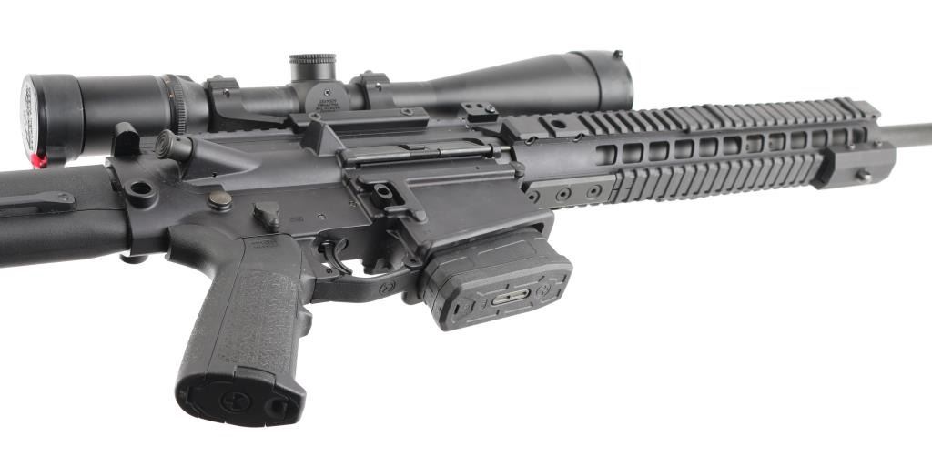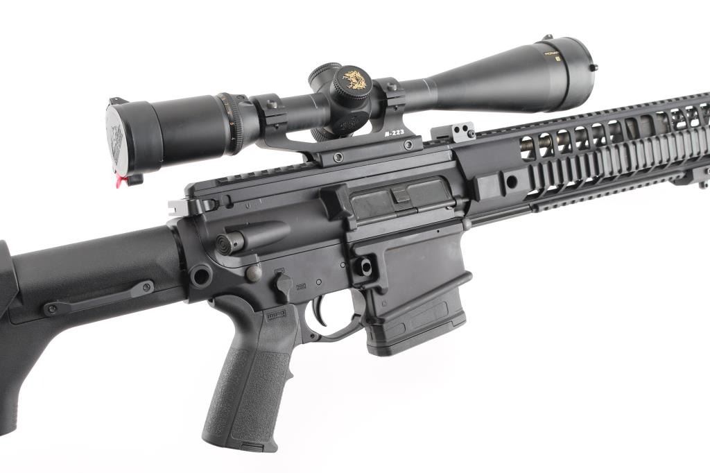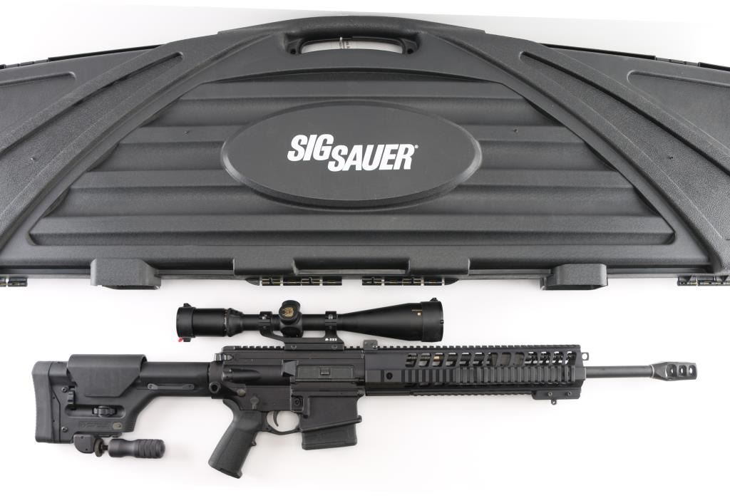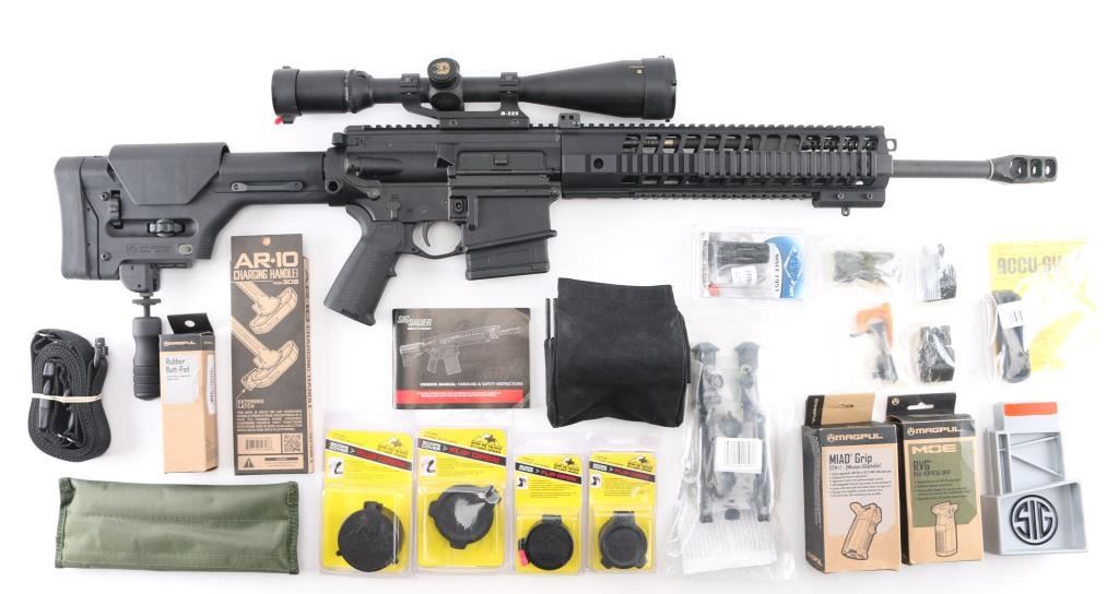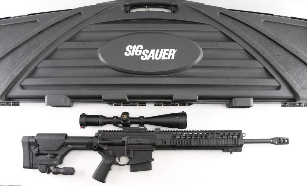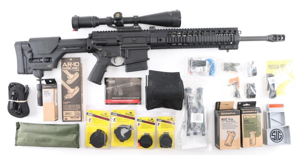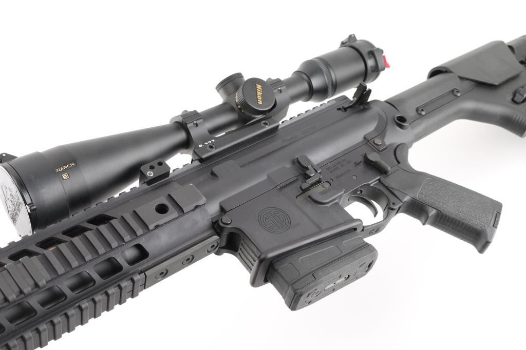 SN: 23D014472. Upgraded AR-based rifle chambered in 7.62 x 51mm.(.308) Utilizing the short stroke push rod operating system,with 4 position gas valve, an M1913 Mil-Std rail, free-floating barrel, aluminum quad rail forend. 18" hammer forged. chrome lined barrel with a 1 in 10 twist, Precision Armament M11A2 severe duty muzzle brake, shell deflector, forward assist, Magpul MIAO grip, Magpul PRS (Precision Rifle Stock) with adjustable comb, and LOP, adjustable folding monopod vertical grip.M-223 scope mount, & rings with a Nikon Monarch 4-16x50 scope, clear optics.10 rd PMAG magazine, Bore is pristine, rifle is in like new condition. Comes with original Sig Sauer factory hard case with extra PMAG 10 rd magazine (2) total. Box with strike Industries AR-10 charging handle, black nylon sling, Magpul rubber butt pad, front & rear Magpul grip straps, manual, GI style cleaning kit, black nylon shell catcher, YHM flash hider, rail mount sling stud, lock, Harris BR bipod, 2 sets of Butler Creek flip open scope covers. bag of 24 Brownells 5/8 accu-washers, rail mount flip-up front & rear sights. NRA condition-Excellent=Like New. Modern Firearm