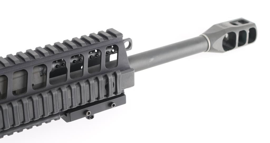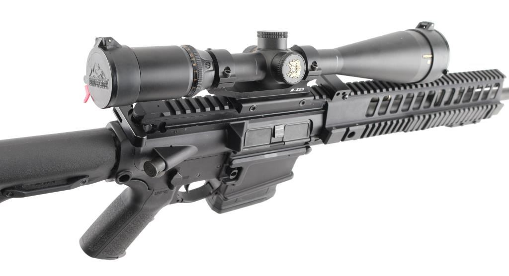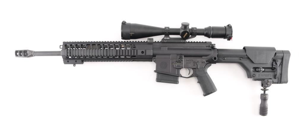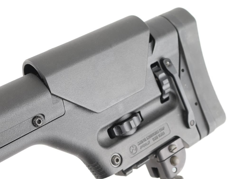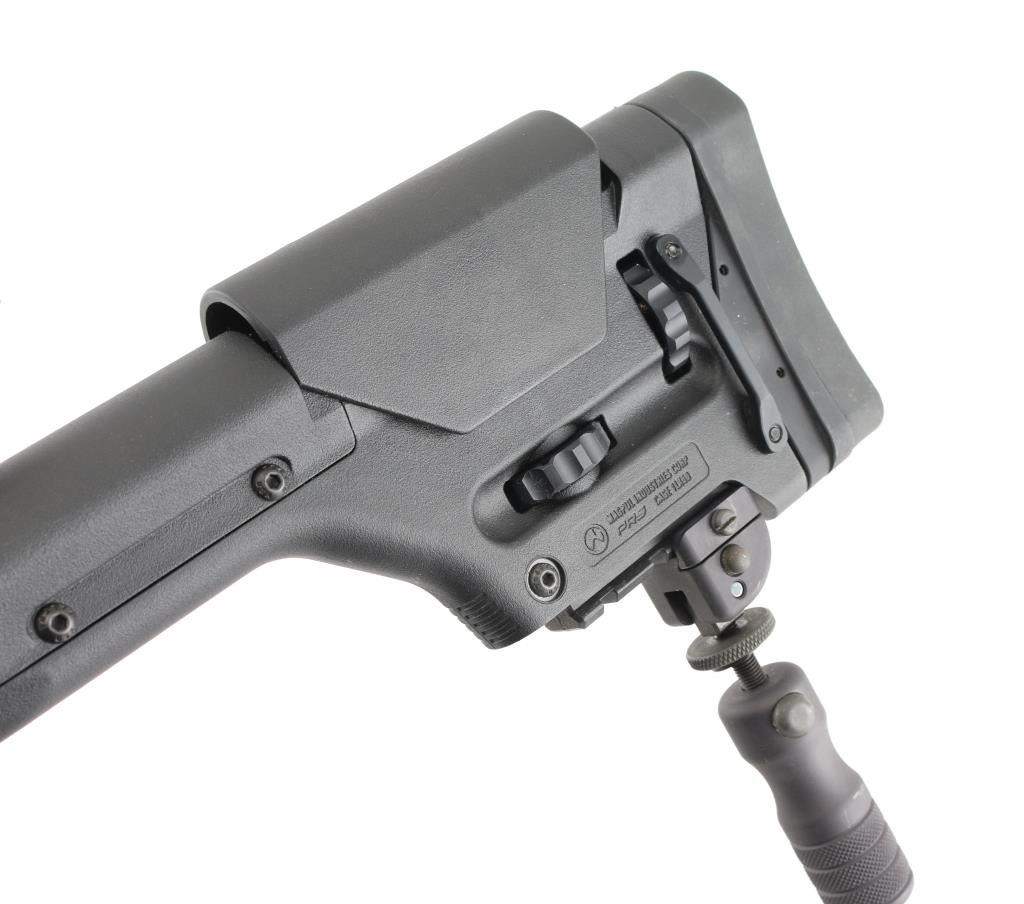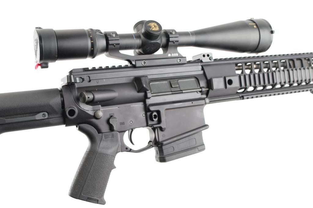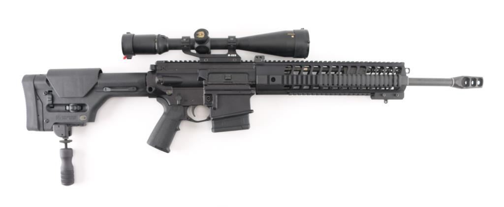 SN: 23D014472. Upgraded AR-based rifle chambered in 7.62 x 51mm.(.308) Utilizing the short stroke push rod operating system,with 4 position gas valve, an M1913 Mil-Std rail, free-floating barrel, aluminum quad rail forend. 18" hammer forged. chrome lined barrel with a 1 in 10 twist, Precision Armament M11A2 severe duty muzzle brake, shell deflector, forward assist, Magpul MIAO grip, Magpul PRS (Precision Rifle Stock) with adjustable comb, and LOP, adjustable folding monopod vertical grip.M-223 scope mount, & rings with a Nikon Monarch 4-16x50 scope, clear optics.10 rd PMAG magazine, Bore is pristine, rifle is in like new condition. Comes with original Sig Sauer factory hard case with extra PMAG 10 rd magazine (2) total. Box with strike Industries AR-10 charging handle, black nylon sling, Magpul rubber butt pad, front & rear Magpul grip straps, manual, GI style cleaning kit, black nylon shell catcher, YHM flash hider, rail mount sling stud, lock, Harris BR bipod, 2 sets of Butler Creek flip open scope covers. bag of 24 Brownells 5/8 accu-washers, rail mount flip-up front & rear sights. NRA condition-Excellent=Like New. Modern Firearm