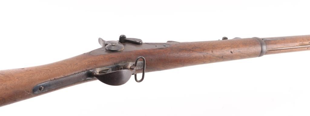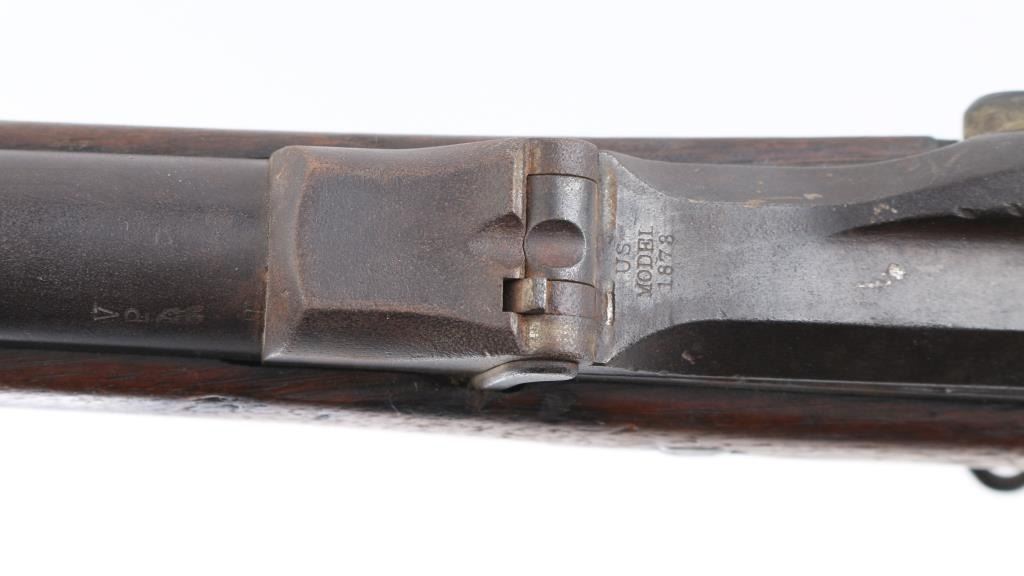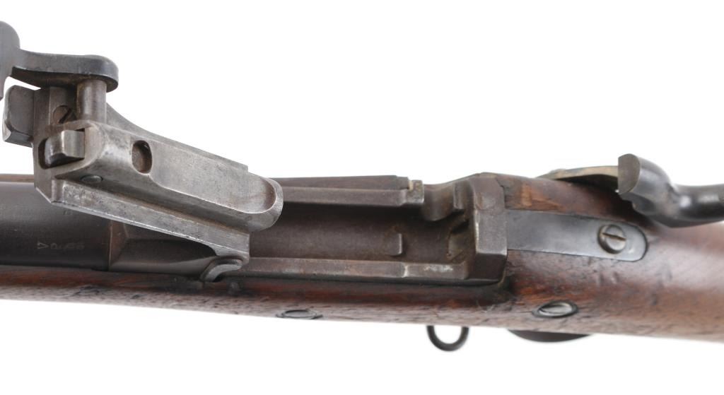 United States military single shot rifle features blued finish, full length wood stock, case color breech block & tang, 32" barrel, cleaning rod, sling swivels, missing stacking swivel, adjustable rear sight, marked "R", blade front sight. Bore is ok, rough with rifling present. Blue finish is faded. turning a light brown patina. Markings are typically crisp and even, serial number is unreadable due to wear, include: "US SPRINGFIELD" and eagle on lock plate, "A", "P", "V / P" over eagle on barrel over chamber, "US" on buttplate. Stock is good/sound condition with some chips/scratches. Observed large circled "P" under wrist, faint "SWP / 1889" in box on left of wrist. Hammer locks up tight. There is some pitting around the muzzle, cleaning rod has light surface rust NRA Condition-Good. Antique Firearm.