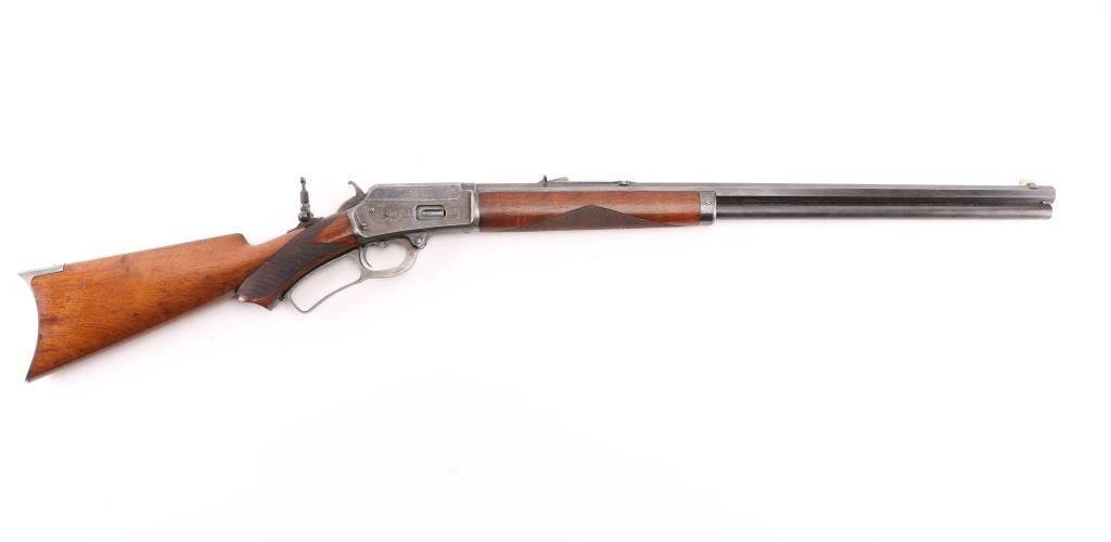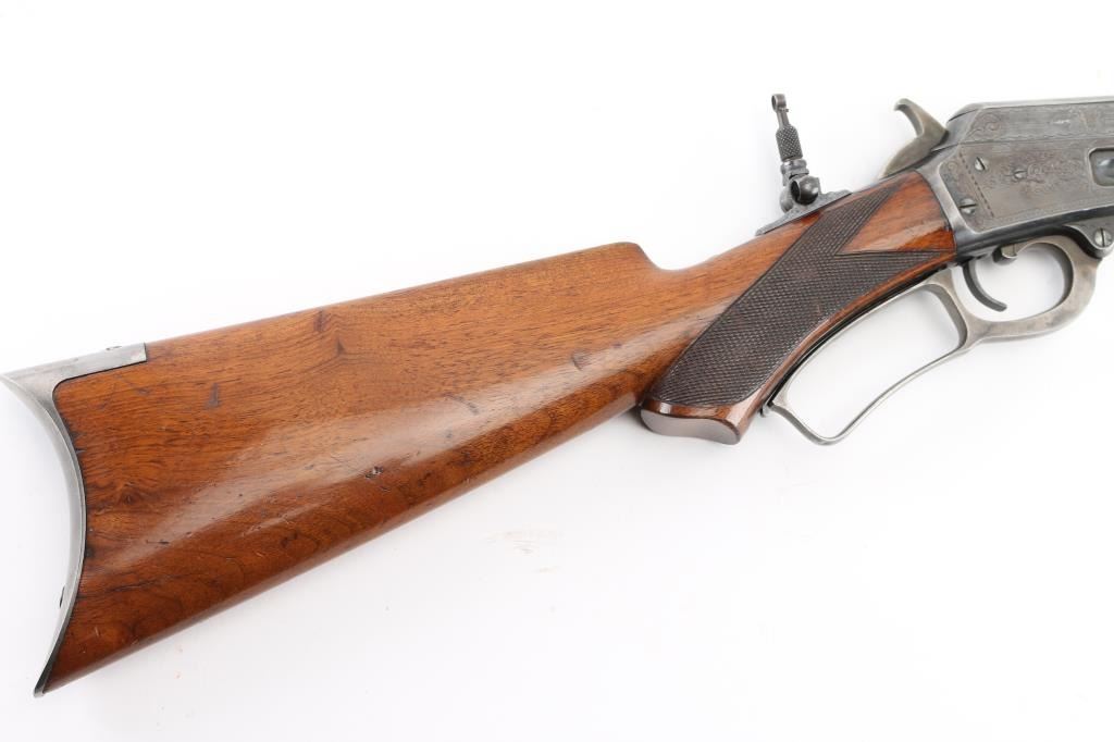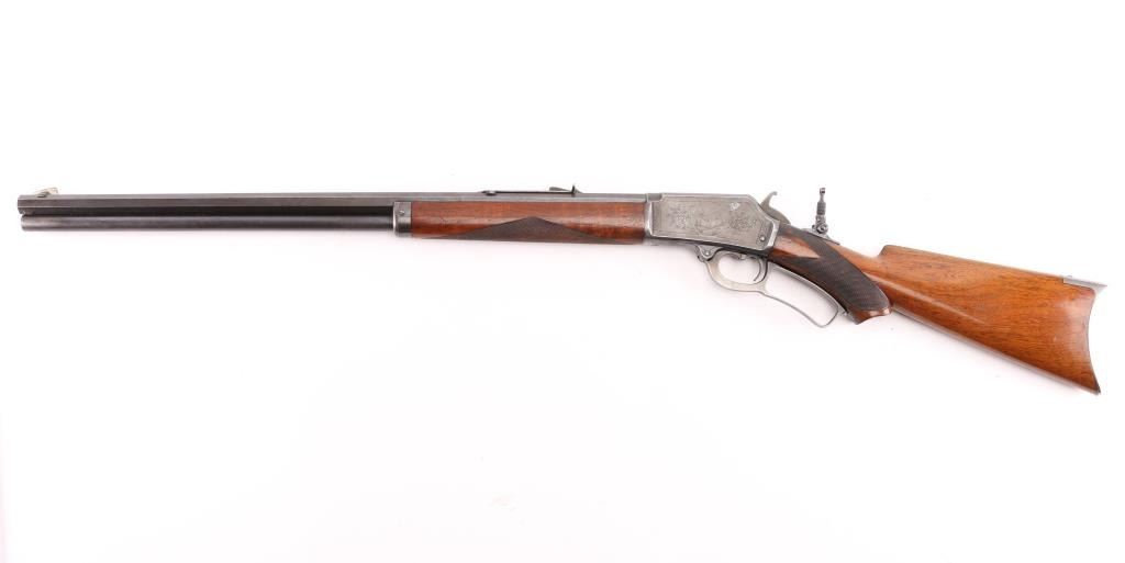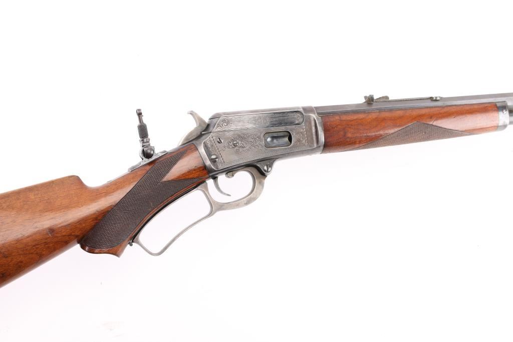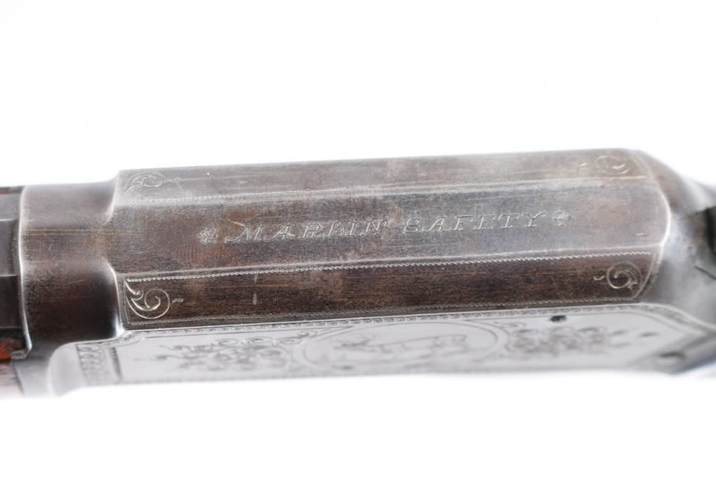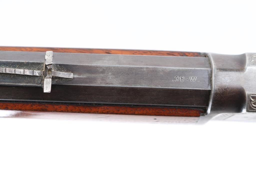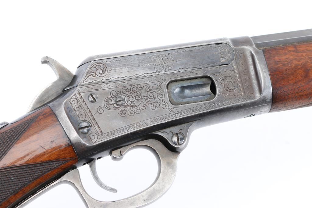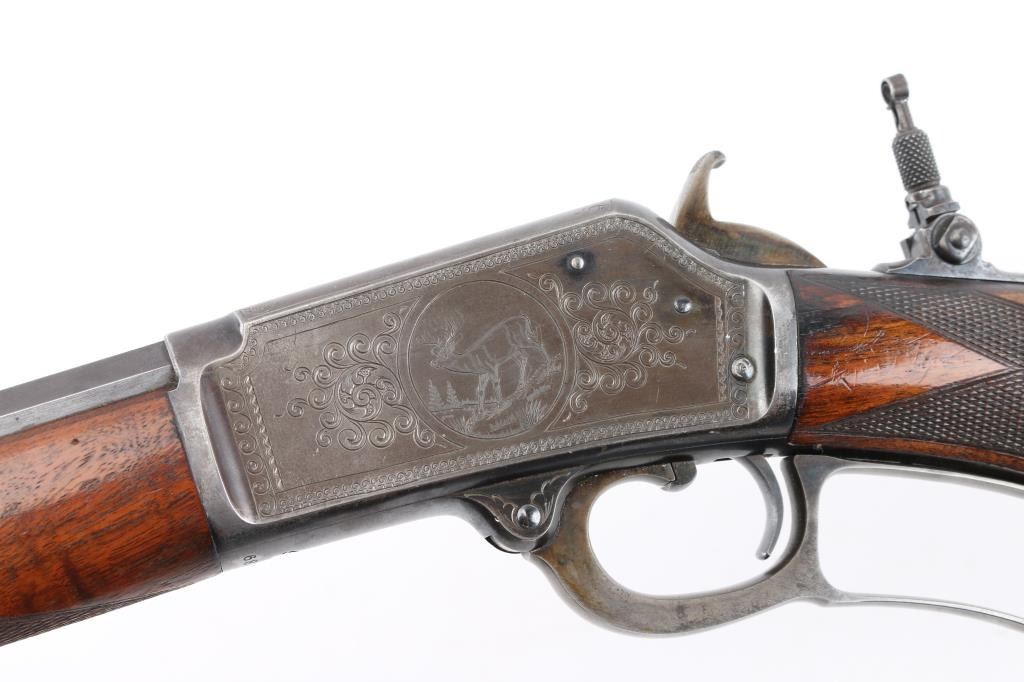 Period Engraved Deluxe, with the engraving attributed to Master Engraver Conrad Ulrich who did most of the engraving for Marlin at the time. Manufactured circa 1892. The top barrel flat is marked "MARLIN FIRE-ARMS CO. NEW-HAVEN, CT. U.S.A./PATENTED. OCT. 11. 1887, APRIL 2. 1889", ahead of the rear sight and "38-W" at the breech. The top of the receiver is marked "MARLIN SAFETY" .24" octagonal barrel with German silver front blade. V-notch adjustable rear sights. Full length tube magazine. Factory installed Lyman peep sight on tang, "H" code, stamped on the underside. Crescent steel buttplate, & fore cap. Deluxe stock with fine point checkering on grip. and forearm. Superb example of late 19th century Marlin artistry. The casehardened receiver is decorated with attractive factory floral scrollwork on a punch dot background, light scroll and line borders and a game scene depicting a stag in a circular panel on the left side. The motif is very similar to Marlin's No. 1 pattern as illustrated in Brophy's "Marlin Firearms" on page 531. At the time this rifle was manufactured, famed Master Engraver Conrad Ulrich, who spent a lifetime embellishing some of the finest high art firearms of the late 19th century to early 20th century, did most of the engraving for Marlin, and the embellishment on this rifle certainly follows a standard well-known Ulrich pattern encountered on Marlin arms. Bore is overall good, bright with good rifling, but has scattered light pitting. Blue on the barrel, & fore cap is mostly there, with some edge wear, slight handling loss on the lower barrel. The tube shows some slight areas of brown patina on the underside. The case colors on the frame, lever. hammer, & buttplate is mostly gone with only traces remaining, there is a small area of light pin-prick pitting. The bolt retains most of its hight polish blue, and the loading gate retains about 60% of its nitre blue finish. The stock is very good, with sharp checkering, some minor scratches/dings. Comes with shipping record from Cody Firearms Record Office, confirming the type/length of barrel, caliber, and stock configuration. Shipped November 26. 1892. Marlin expert William Brophy explained, "Unfortunately, the few remaining factory records do not, with any regularity, indicate if the gun was factory engraved or not." Factory engraved Model 1889s are rare. All the markings, & engraving are crisp/clear.