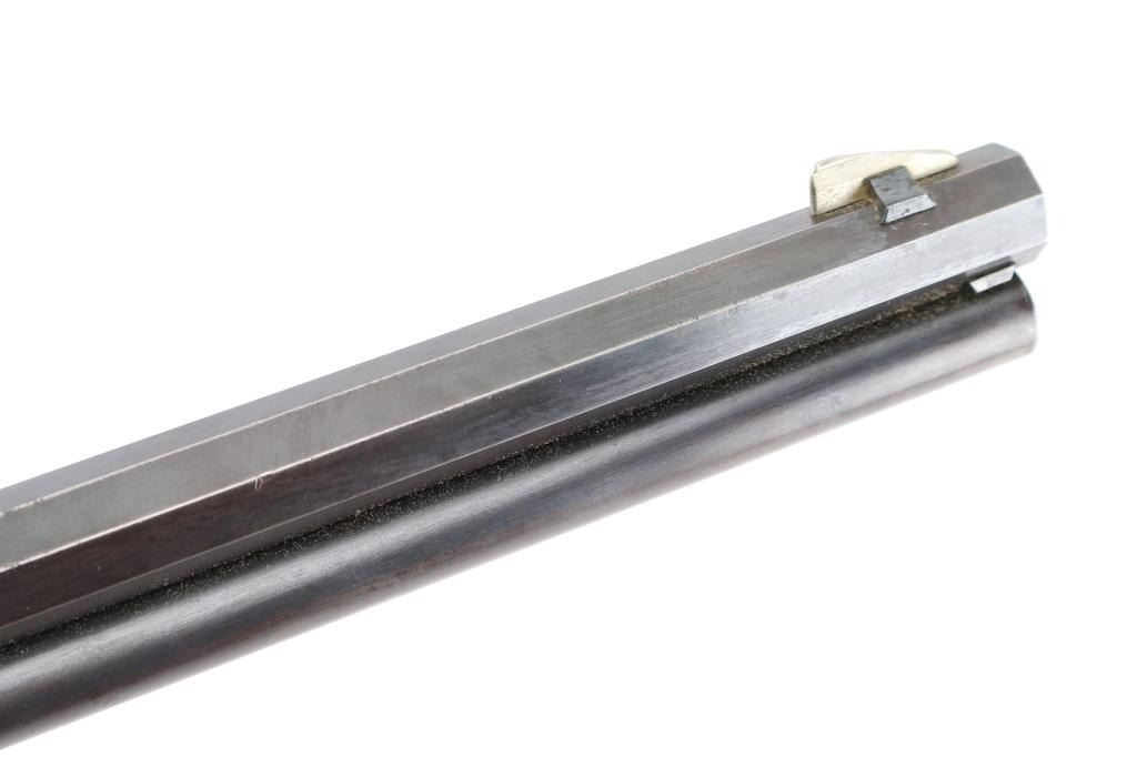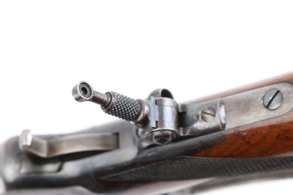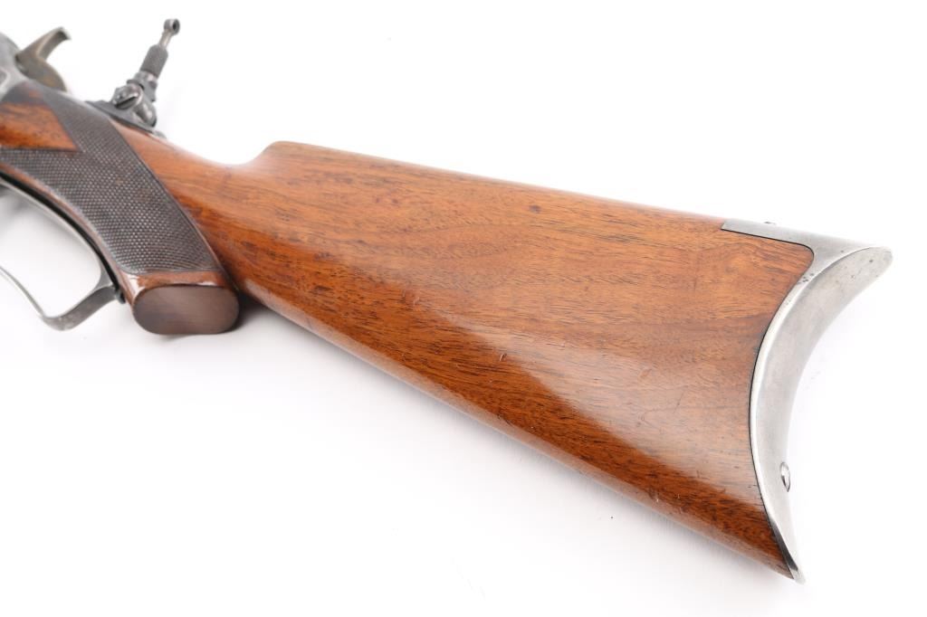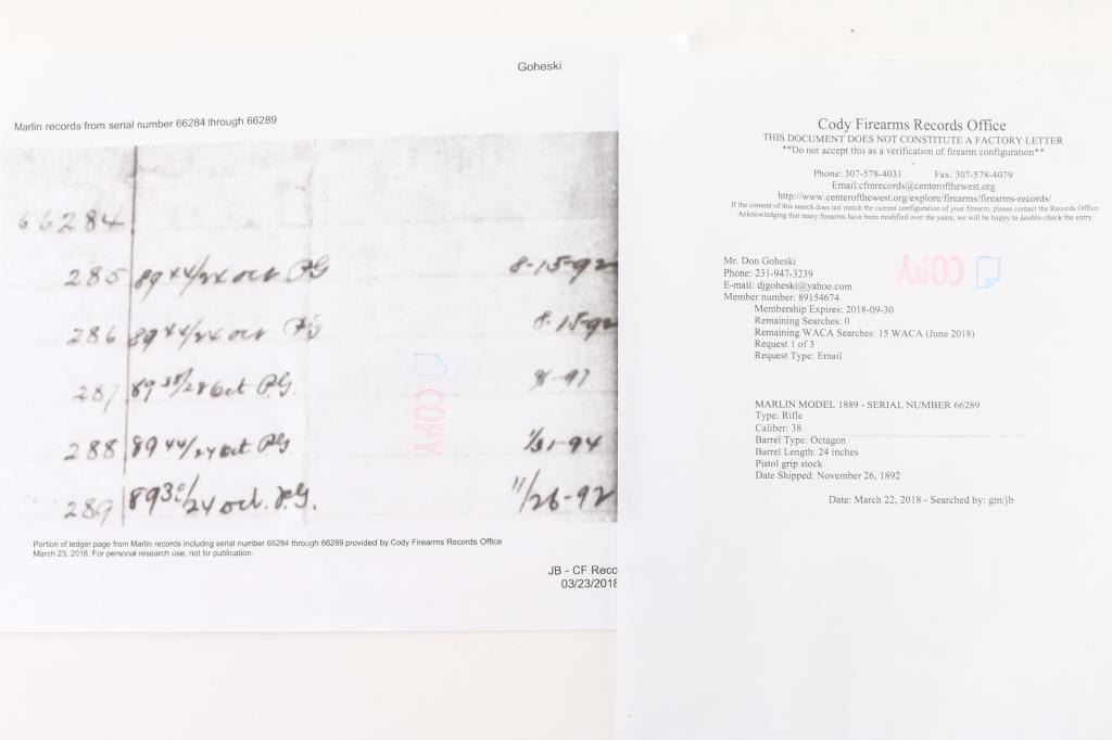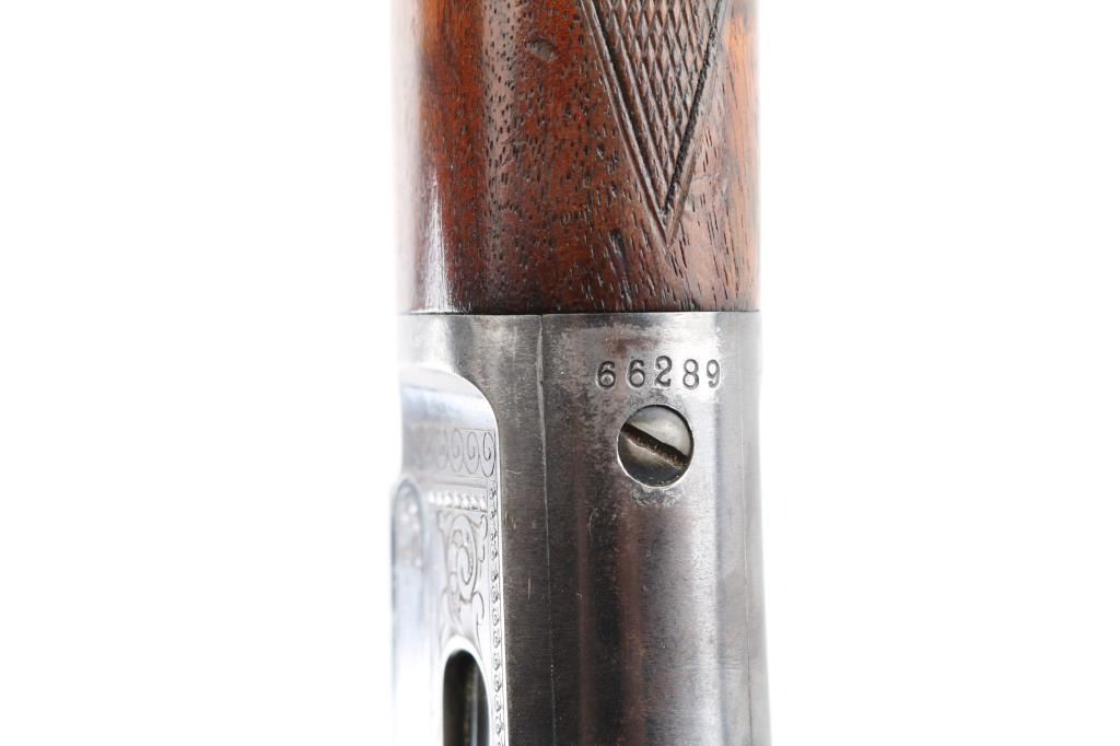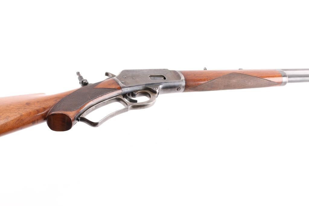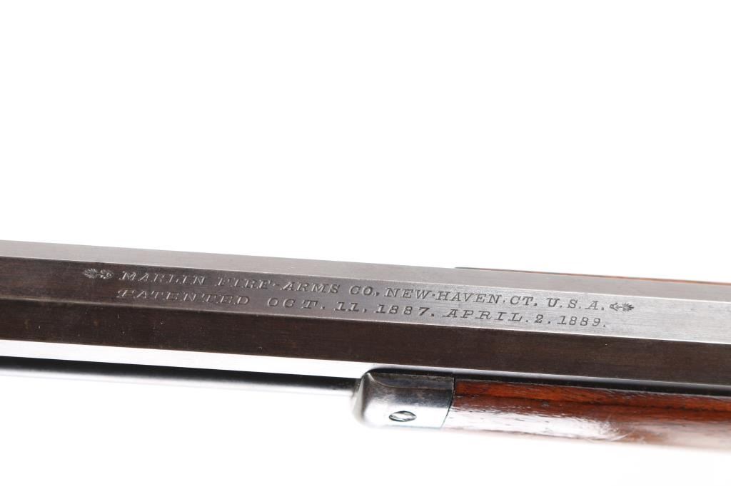 Period Engraved Deluxe, with the engraving attributed to Master Engraver Conrad Ulrich who did most of the engraving for Marlin at the time. Manufactured circa 1892. The top barrel flat is marked "MARLIN FIRE-ARMS CO. NEW-HAVEN, CT. U.S.A./PATENTED. OCT. 11. 1887, APRIL 2. 1889", ahead of the rear sight and "38-W" at the breech. The top of the receiver is marked "MARLIN SAFETY" .24" octagonal barrel with German silver front blade. V-notch adjustable rear sights. Full length tube magazine. Factory installed Lyman peep sight on tang, "H" code, stamped on the underside. Crescent steel buttplate, & fore cap. Deluxe stock with fine point checkering on grip. and forearm. Superb example of late 19th century Marlin artistry. The casehardened receiver is decorated with attractive factory floral scrollwork on a punch dot background, light scroll and line borders and a game scene depicting a stag in a circular panel on the left side. The motif is very similar to Marlin's No. 1 pattern as illustrated in Brophy's "Marlin Firearms" on page 531. At the time this rifle was manufactured, famed Master Engraver Conrad Ulrich, who spent a lifetime embellishing some of the finest high art firearms of the late 19th century to early 20th century, did most of the engraving for Marlin, and the embellishment on this rifle certainly follows a standard well-known Ulrich pattern encountered on Marlin arms. Bore is overall good, bright with good rifling, but has scattered light pitting. Blue on the barrel, & fore cap is mostly there, with some edge wear, slight handling loss on the lower barrel. The tube shows some slight areas of brown patina on the underside. The case colors on the frame, lever. hammer, & buttplate is mostly gone with only traces remaining, there is a small area of light pin-prick pitting. The bolt retains most of its hight polish blue, and the loading gate retains about 60% of its nitre blue finish. The stock is very good, with sharp checkering, some minor scratches/dings. Comes with shipping record from Cody Firearms Record Office, confirming the type/length of barrel, caliber, and stock configuration. Shipped November 26. 1892. Marlin expert William Brophy explained, "Unfortunately, the few remaining factory records do not, with any regularity, indicate if the gun was factory engraved or not." Factory engraved Model 1889s are rare. All the markings, & engraving are crisp/clear.