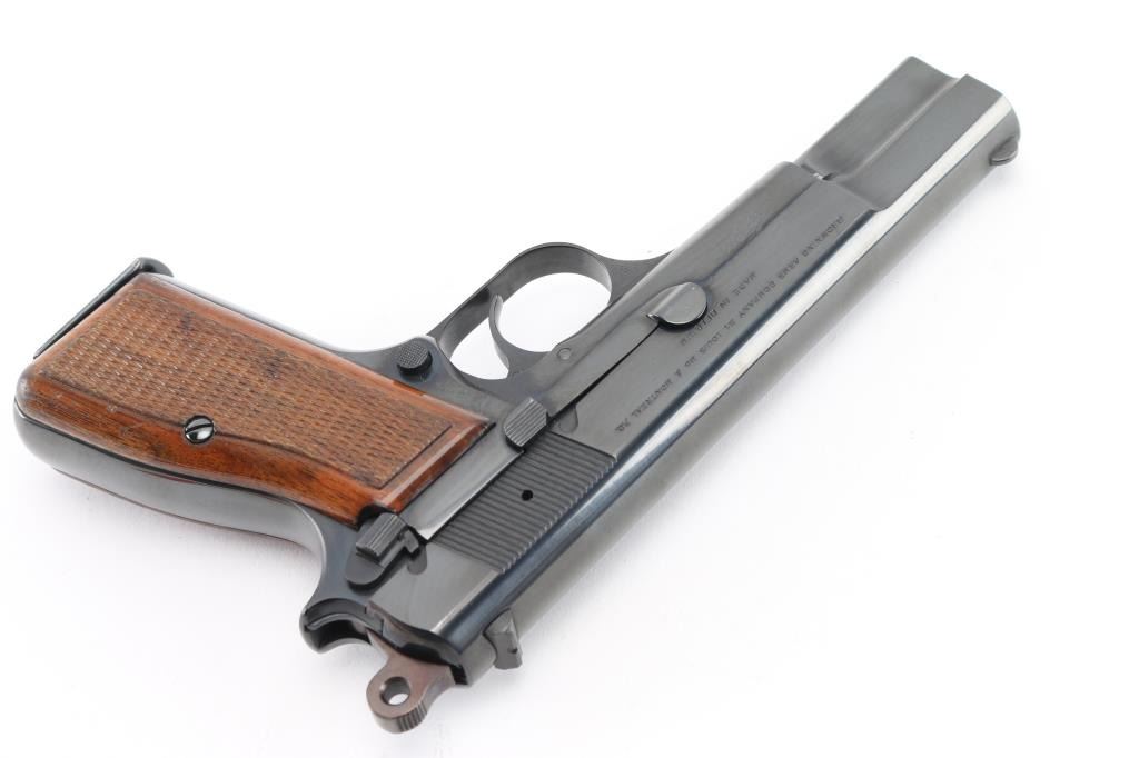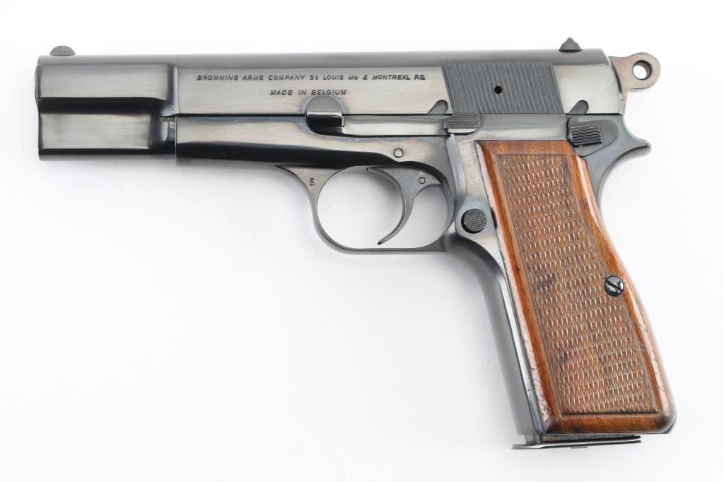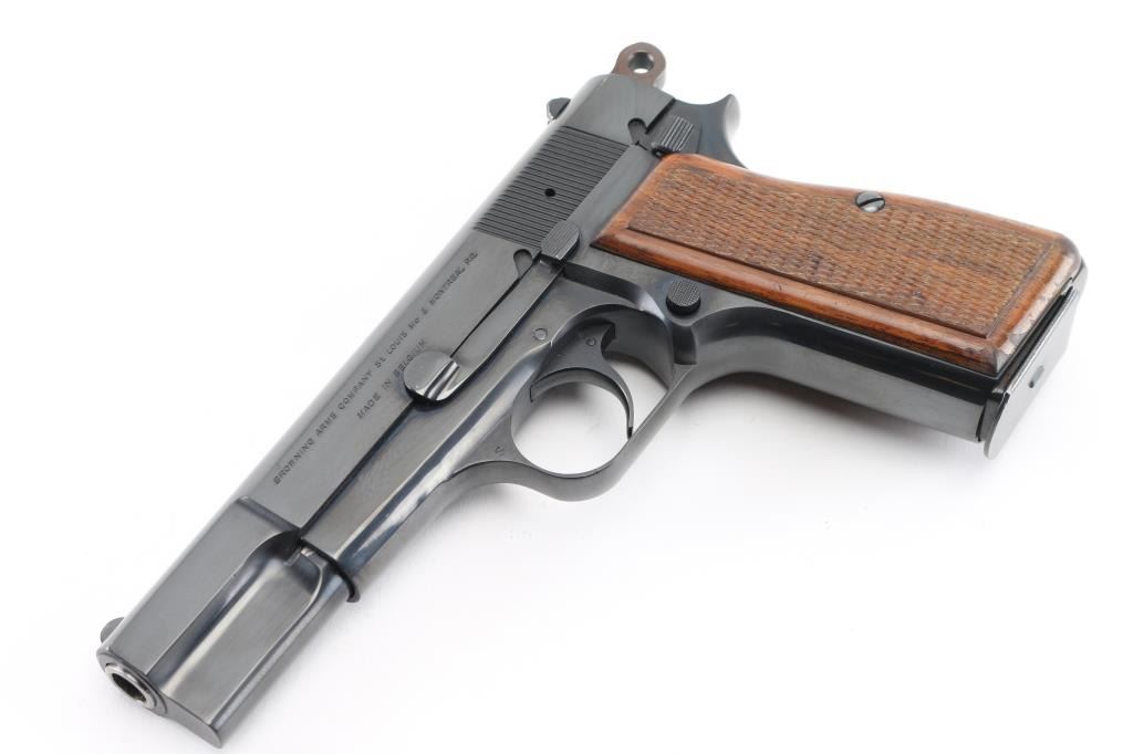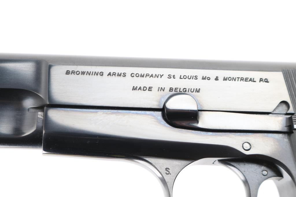 Semi-Automatic. 13 rd magazine, Short recoil operated tilting barrel. 4.7" barrel. Rowel ring hammer. Left slide stamped "Browning Arms Company St Louis Mo. & Montreal P.G." "Made in Belgium". These markings started in 1954. Serial number on right side of frame. No other parts with serial numbers. Left triggerguard stamped "R". Belgium proofs on barrel, and right triggerguard. All markings are crisp and clear. Bore is pristine. High polish blue finish is about 99% Checkered brown varnished wood grips are excellent. Pistol is in like new condition. NRA Condition-Excellent. C&R Firearm.