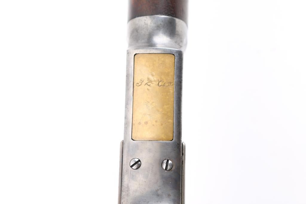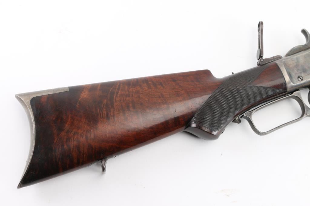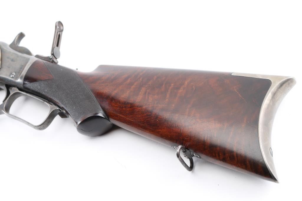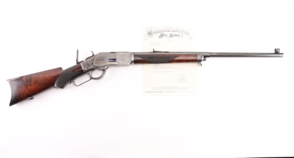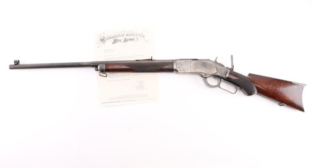 SN: 132529. Special Order Deluxe 1978 Winchester 3rd Model chambered in 32-20. Manufactured circa 1882. Features 24" half round, half octagon barrel, Adjustable Lyman windage globe front sight, buckhorn rear sporting sight. A rare Model 62-B folding tang peep sight is mounted on the receiver tang. This rare sight was designed specifically for the Model 1873 Winchester and is illustrated and described on page 189 of "THE WINCHESTER BOOK" by George Madis. Although offered for many years, comparatively few were sold making them very rare. half length button magazine tube, pistol grip wrist, finger lever latch, plain trigger, 3rd model sliding dust cover intact, integrally machined slot on receiver, steel crescent buttplate. The top barrel flat is roll-stamped with the two line legend: "WINCHESTER'S- REPEATING ARMS. NEW HAVEN. CT./KING'S-IMPROVEMENT-PATENTED-MARCH 29. 1866. OCTOBER 16. 1860." ahead of the rear sight. The upper receiver tang is roll-stamped: "MODEL. 1873" in fancy letters. The serial number is stamped in small letters on the lower tang between the lever latch and the tang screw. Caliber markings on the barrel "32 W.C.F." ahead of the breech, '32 Cal" on the brass elevator. Marking are crisp/clear. The stock, and forearm are highly figured. fancy grain walnut, with a high polish finish. Wrist & forearm have fine point checkering. Ebony inlay in the grip. Sling swivels installed in buttstock, and the steel fore cap. Bore is very good/bright, strong rifling, a little frosting in the grooves. wood is near excellent with some minor scratches/dings. The blue barrel has dulled, but mostly all there, someone has touched up a couple of scratches on the side barrel flats which appears to cold blue above the fore cap. All markings are crisp/clear. The case colored receiver, hammer, lever, fore cap, & buttplate is about 30%, with the rest gone to handling loss,some minor scratches, there is some areas of very light pitting, mostly on the left receiver. The nitre blue finish on the loading gate is about 90%. Comes with the Winchester Factory letter confirming this rifle was ordered with the 1/2 octagon barrel, plain trigger, Checkered stock, pistol grip, folding peep & wind gauge sights, 1/2 magazine, casehardened, and sling swivels. Received in the warehouse September 1st, 1883, and shipped September 3rd, 1883. Order number 6398. NRA Condition-Fine as Antique Firearm.
