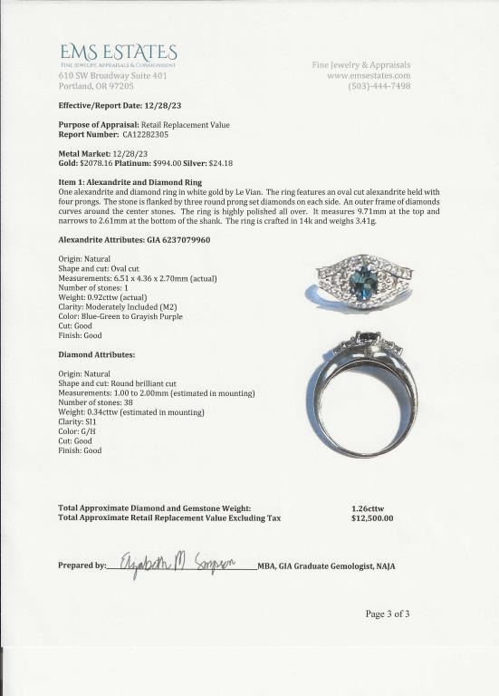 featuring a GIA Certified Alexandrite weighing 0.92 carats with color change from Blue Green to Purple with approx. 0.34 carats of Diamonds in G-H colors and VS/SI clarity set in a 14 karat white gold ‘LEVIAN’ custom made setting. Retail $12,500.00