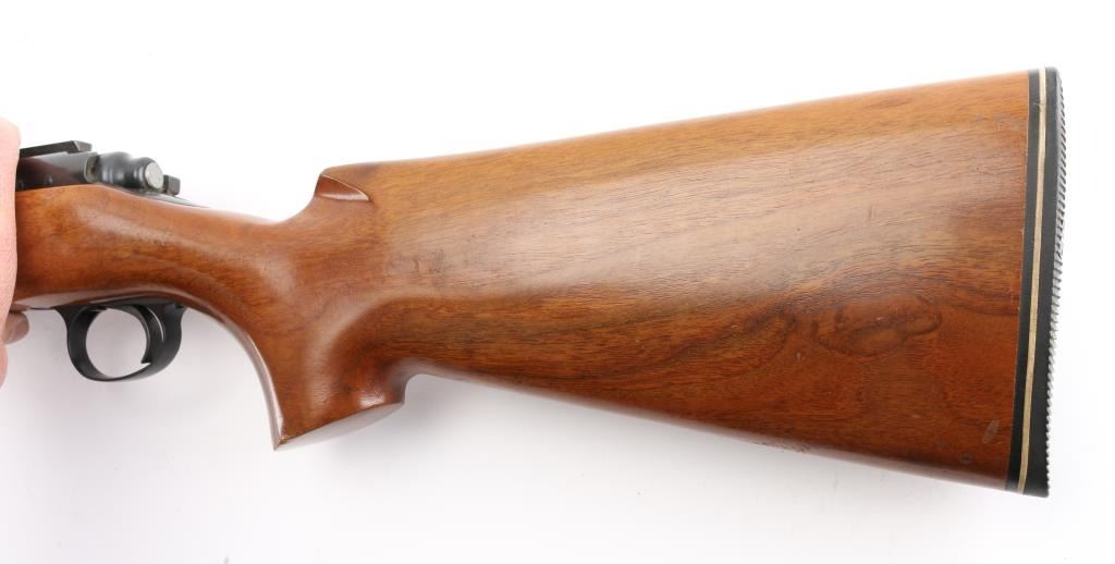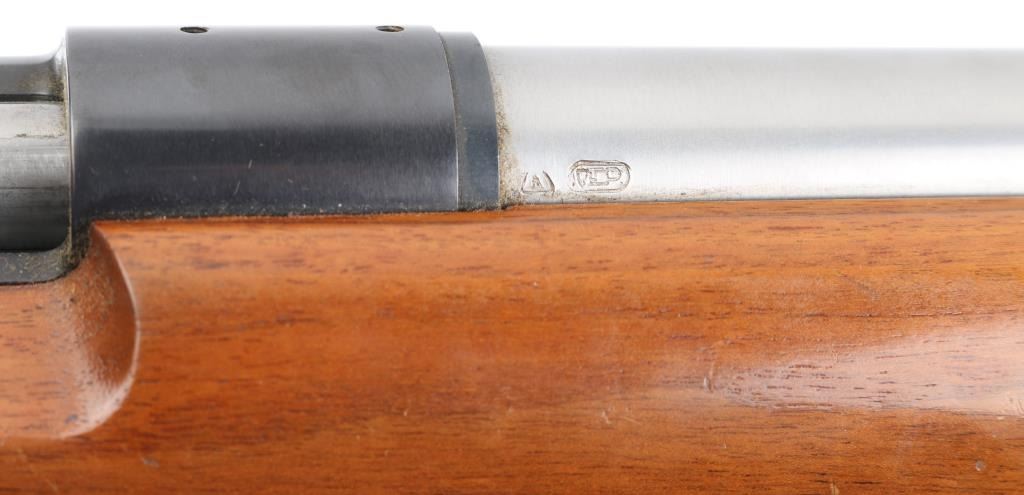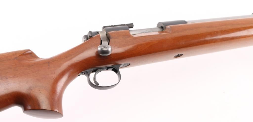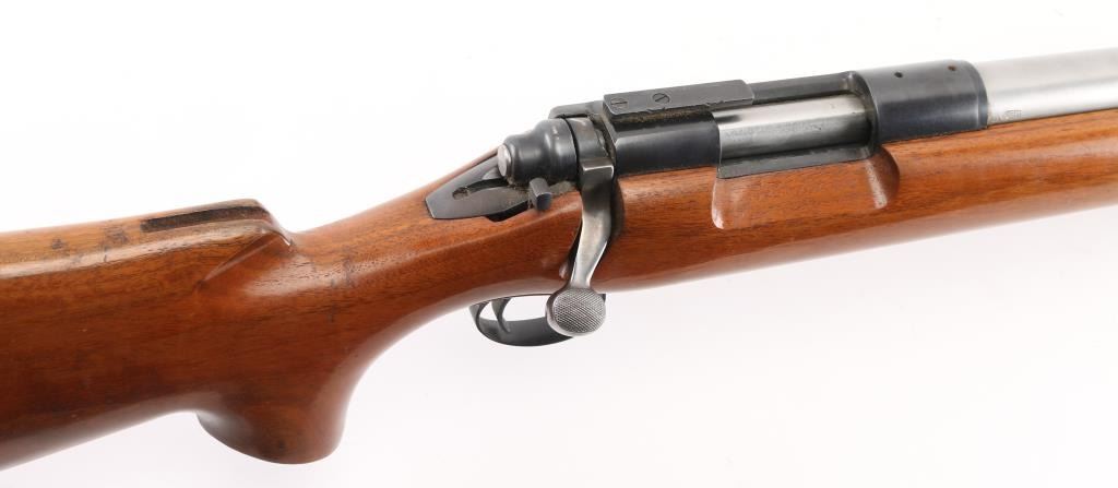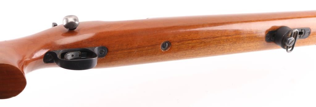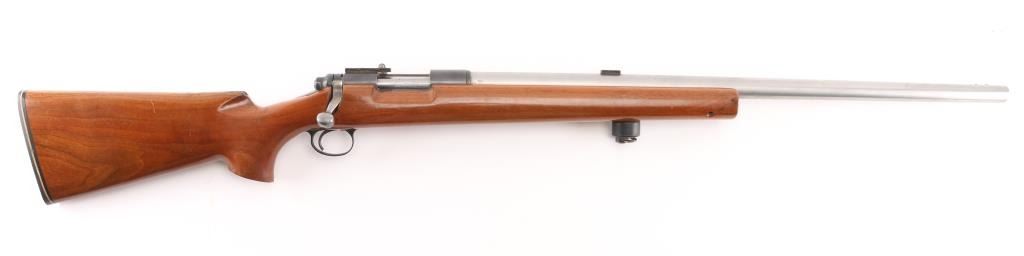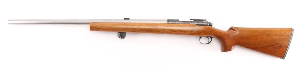 Single shot bolt action target rifle features blued action, 26.5" stainless heavy bull barrel, walnut target stock with beavertail forend, no sights, drilled & tapped near muzzle and rear sight base installed, receiver drilled/tapped for optics, with rear scope base installed., thin serrated rubber butt pad, T-slot accessory rail under forend with hand stop installed, manual safety. Bolt release forward of serrated trigger, knurled bolt knob. Comb slotted for bolt. Bore is excellent/bright. Retains 95% finish on action with handling marks. Wood is near excellent condition, with minor scratches. NRA Condition-Very Good+. Modern Firearm