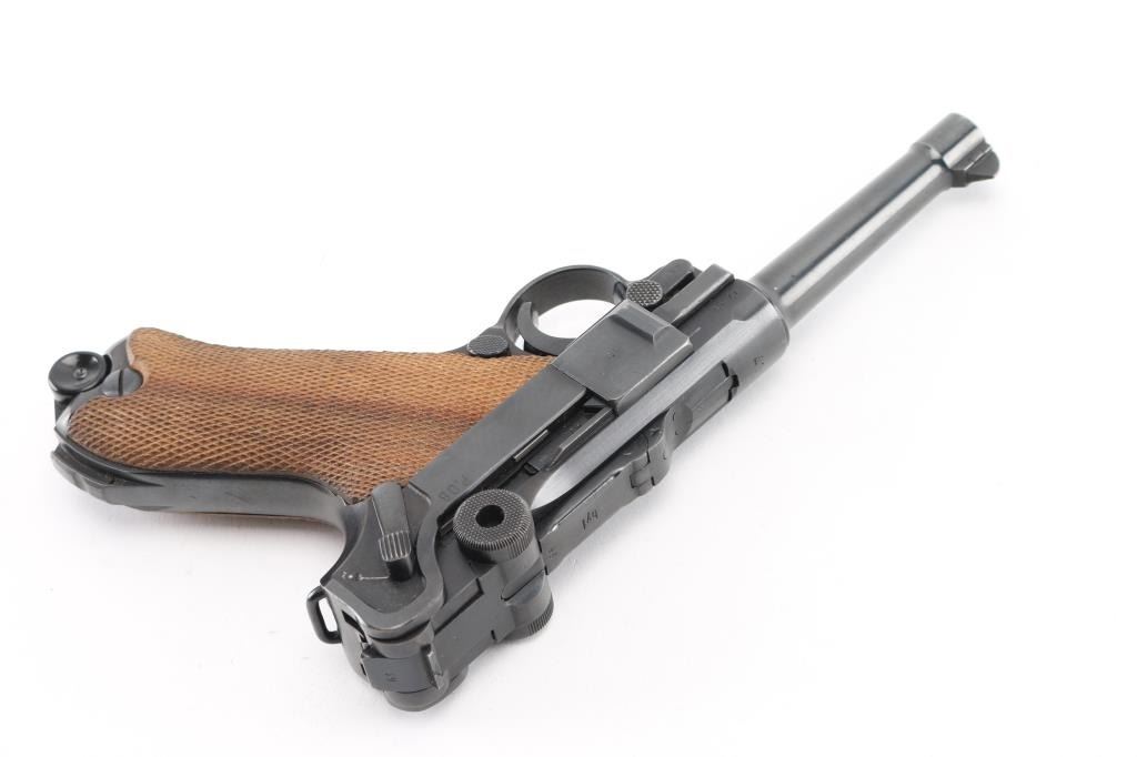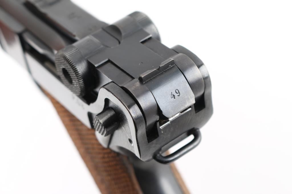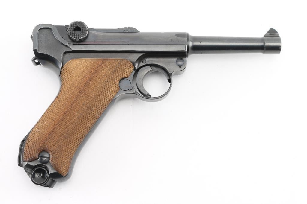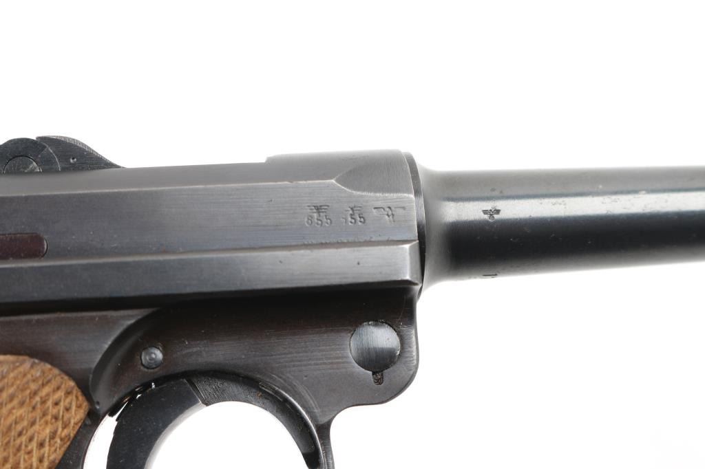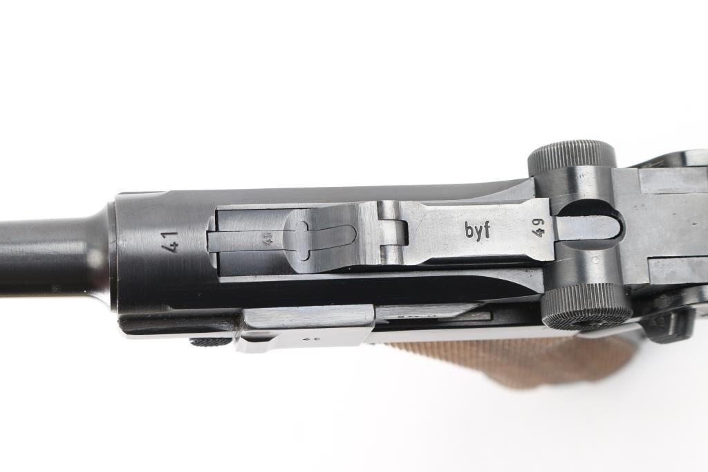 WWII era German military toggle locked recoil operated semi-automatic pistol chambered in 9x19mm Luger, manufactured by Mauser circa 1941. Features an all blued finish, 4" barrel. dovetailed inverted 'v' front sight, 'v' notched rear sight, smooth crescent trigger, knurled charging knobs on the rear toggle link, manual safety of the left side of the frame, knurled push button magazine release, 8 round magazine with black synthetic base, marked "P.08" & "fxo" with eagle 37 Waffenamt, steel frame with lanyard loop & stock lug, and two-piece checkered wood grips. All observed serial numbers are matching. Lanyard stable on the rear of frame. The frame is marked "P.08" & the safety "GESICHET", the breech block & barrel extension are marked [Eagle]/[Swastika], and [Eagle]/"655" is stamped twice on the barrel extension and once on the barrel. Pistol exhibits approximately 98% of it's original blued finish showing slight muzzle wear and tracking behind the safety lever. Action is strong, the bore is bright with sharp rifling with a very light area of pitting near the muzzle, and the grips are excellent. No import marks. NRA Excellent. C&R Firearm.