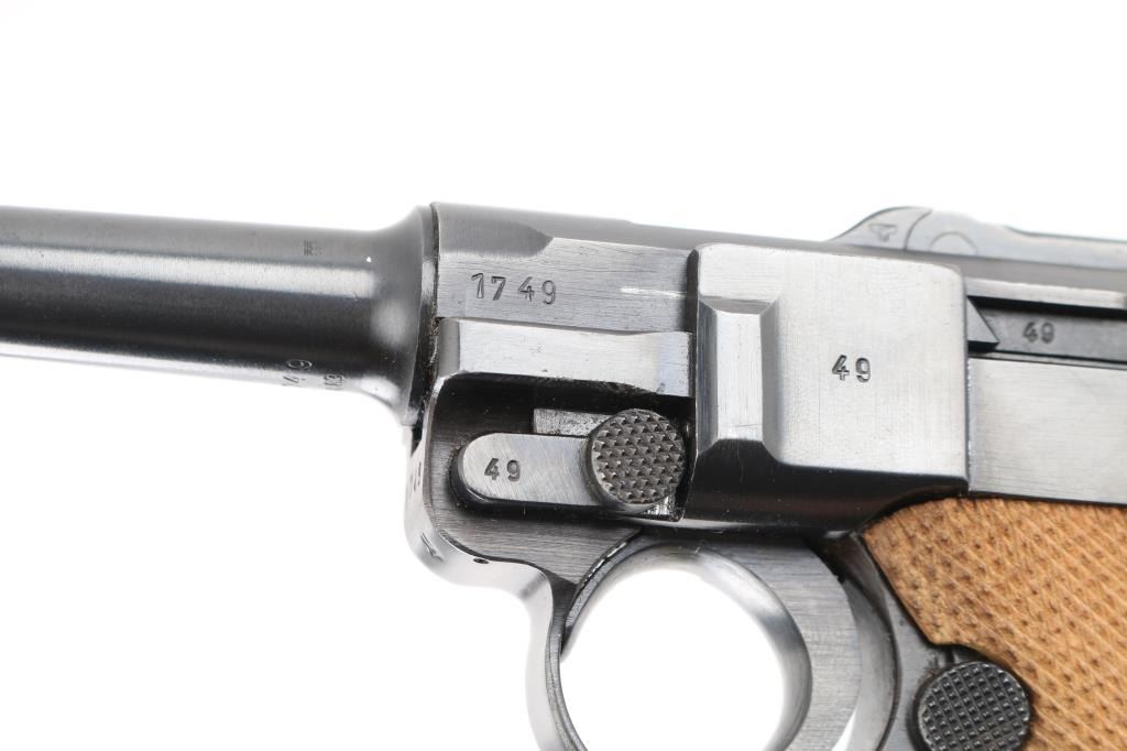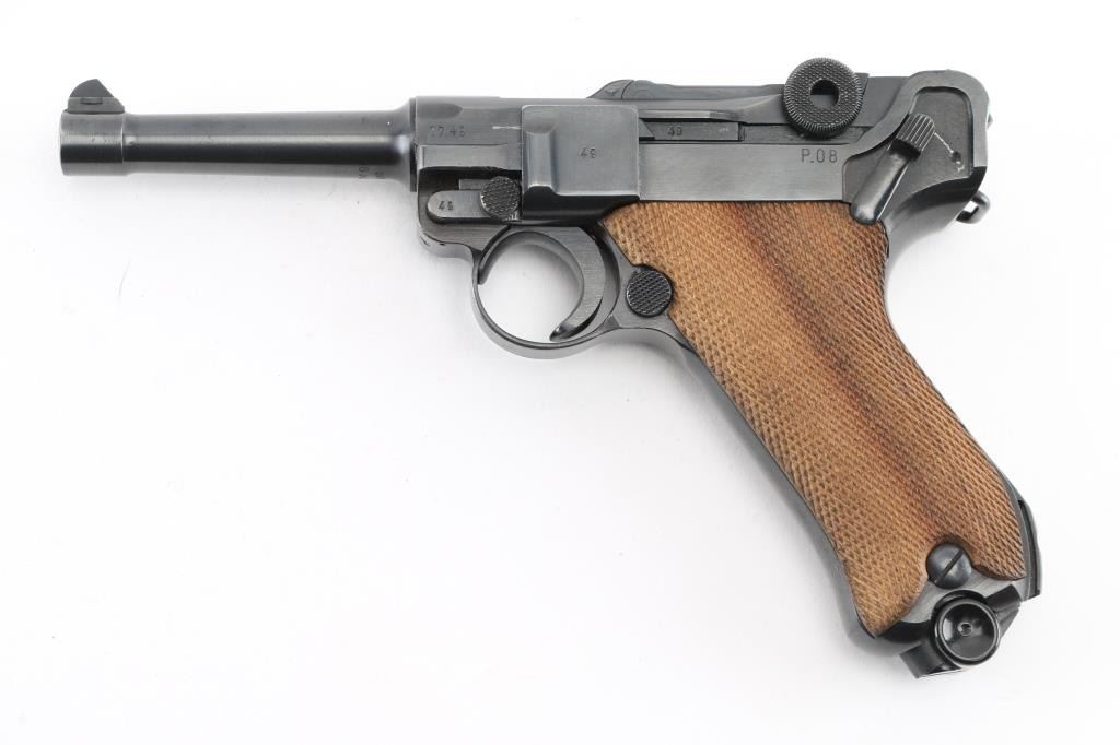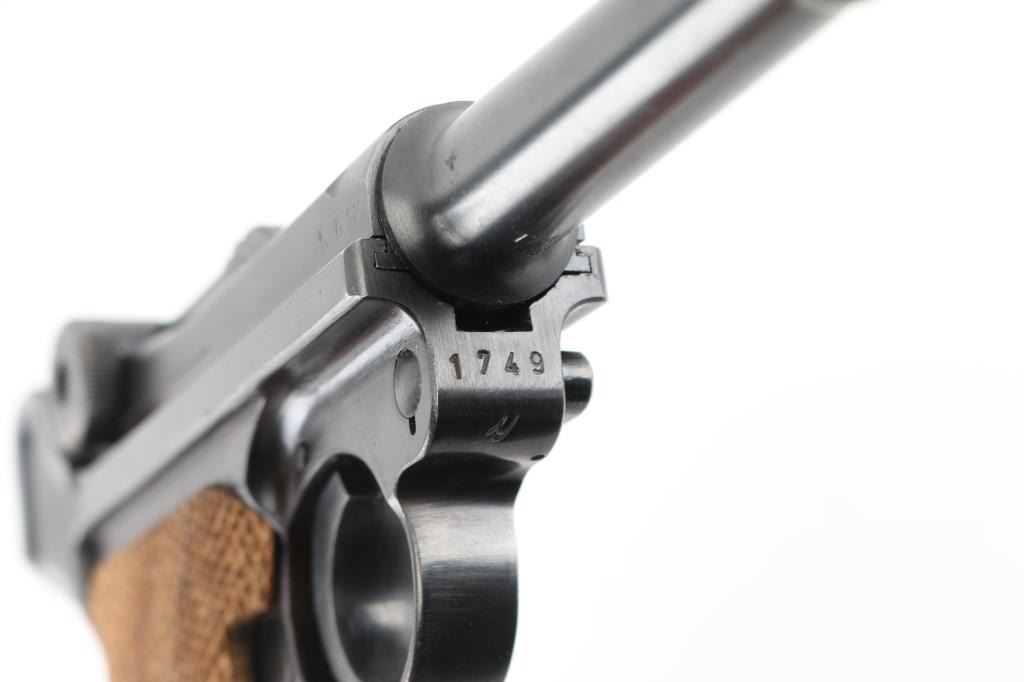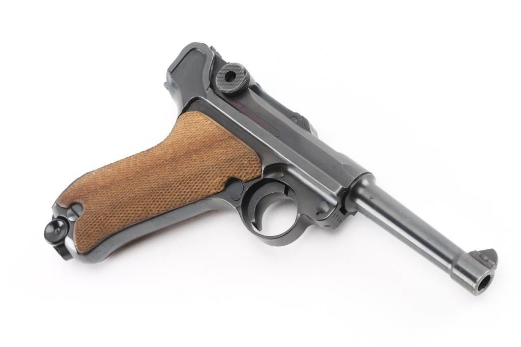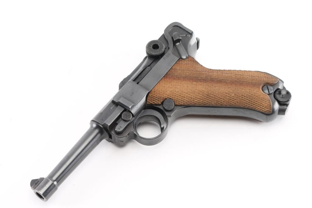 WWII era German military toggle locked recoil operated semi-automatic pistol chambered in 9x19mm Luger, manufactured by Mauser circa 1941. Features an all blued finish, 4" barrel. dovetailed inverted 'v' front sight, 'v' notched rear sight, smooth crescent trigger, knurled charging knobs on the rear toggle link, manual safety of the left side of the frame, knurled push button magazine release, 8 round magazine with black synthetic base, marked "P.08" & "fxo" with eagle 37 Waffenamt, steel frame with lanyard loop & stock lug, and two-piece checkered wood grips. All observed serial numbers are matching. Lanyard stable on the rear of frame. The frame is marked "P.08" & the safety "GESICHET", the breech block & barrel extension are marked [Eagle]/[Swastika], and [Eagle]/"655" is stamped twice on the barrel extension and once on the barrel. Pistol exhibits approximately 98% of it's original blued finish showing slight muzzle wear and tracking behind the safety lever. Action is strong, the bore is bright with sharp rifling with a very light area of pitting near the muzzle, and the grips are excellent. No import marks. NRA Excellent. C&R Firearm.