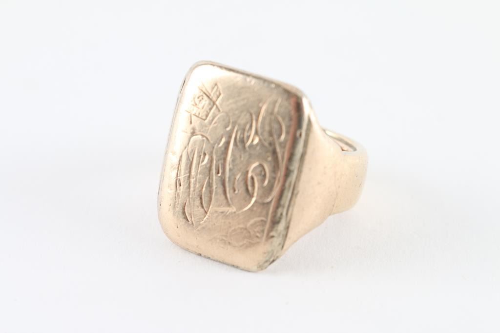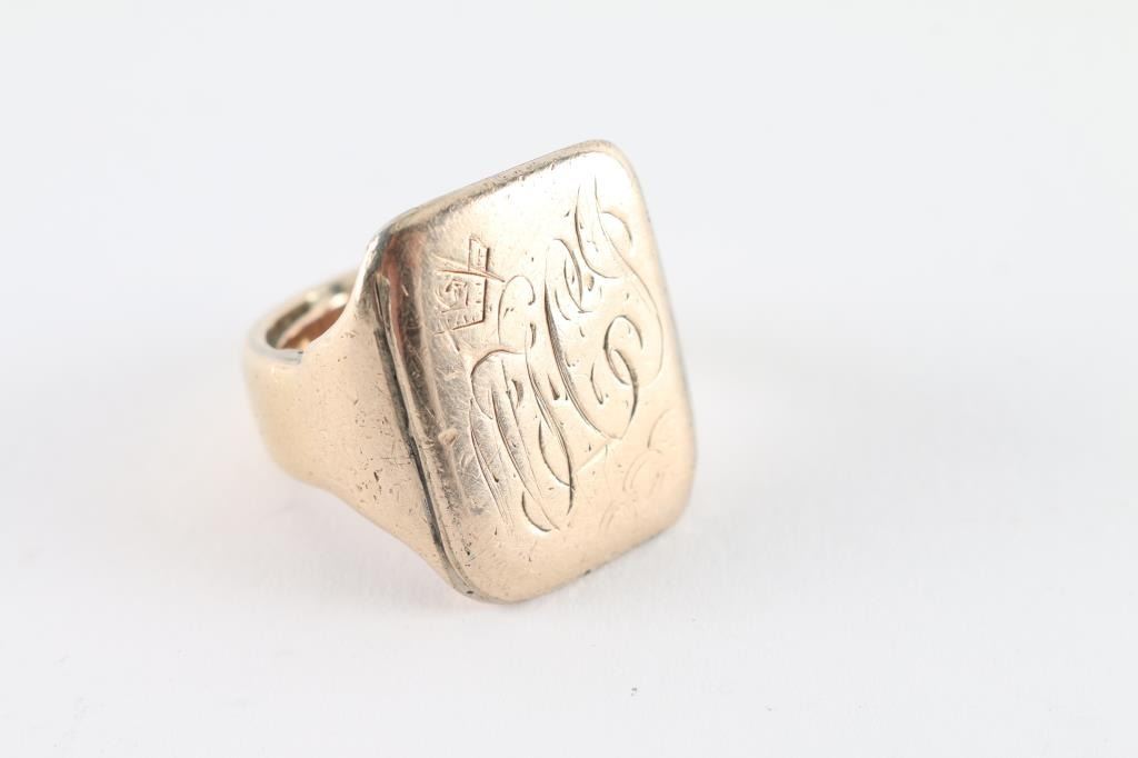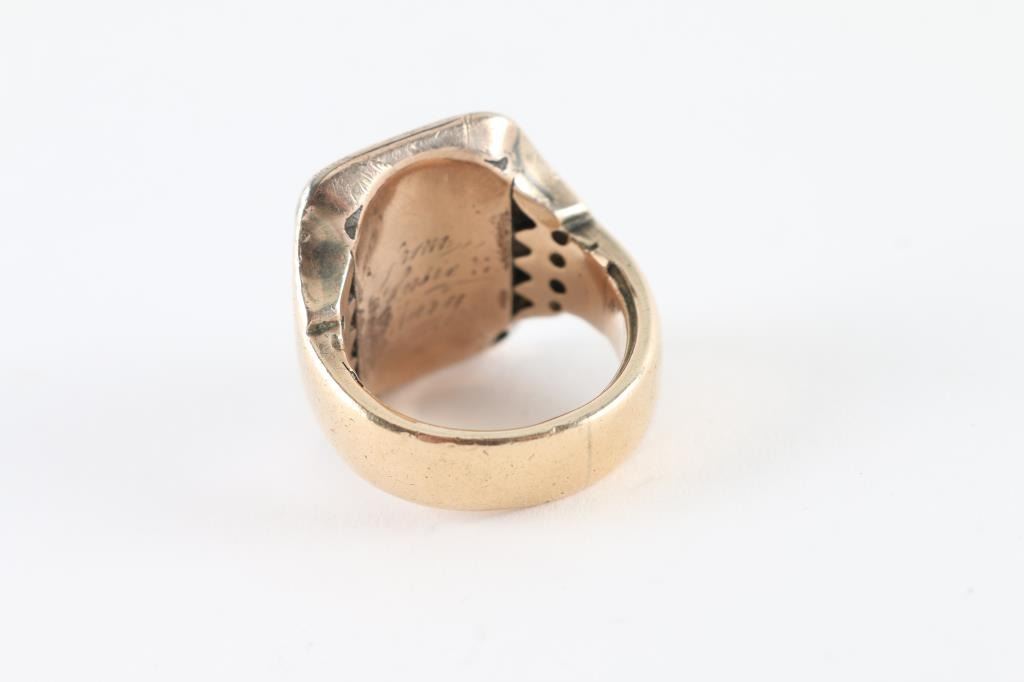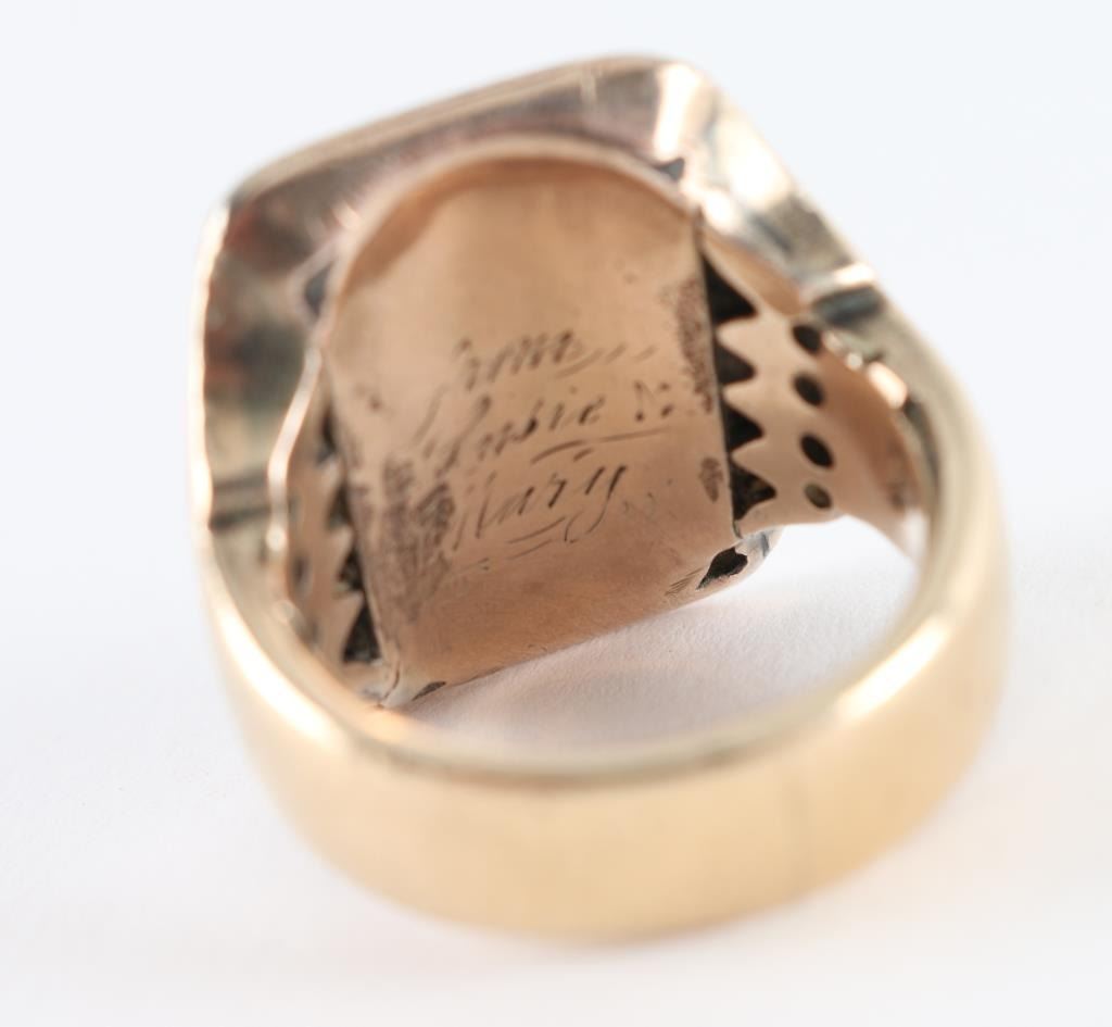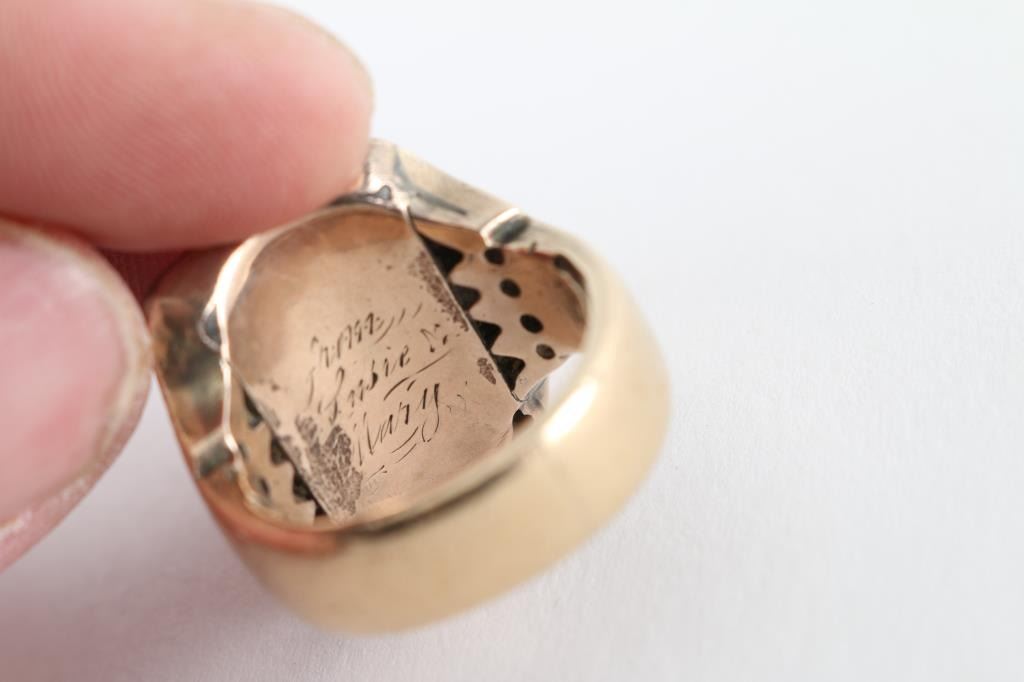 Heavy gold ring found at Civil War encampment site in Ohio attributed to Frank Joslin of Company B 5th Michigan Cavalry aka Custer Brigade. Frank Joslin was from Ypsilanti, Michigan and was a Mason. The face of the ring is period inscribed with his initials and Masonic symbol. The interior is also inscribed "From ???ie ? Mary". From a major collection of American 19th Century historical artifacts.