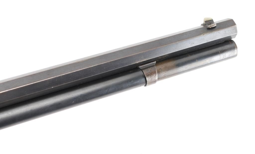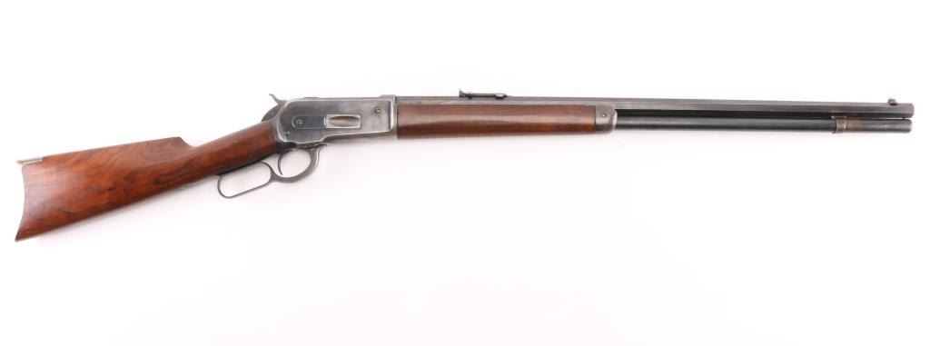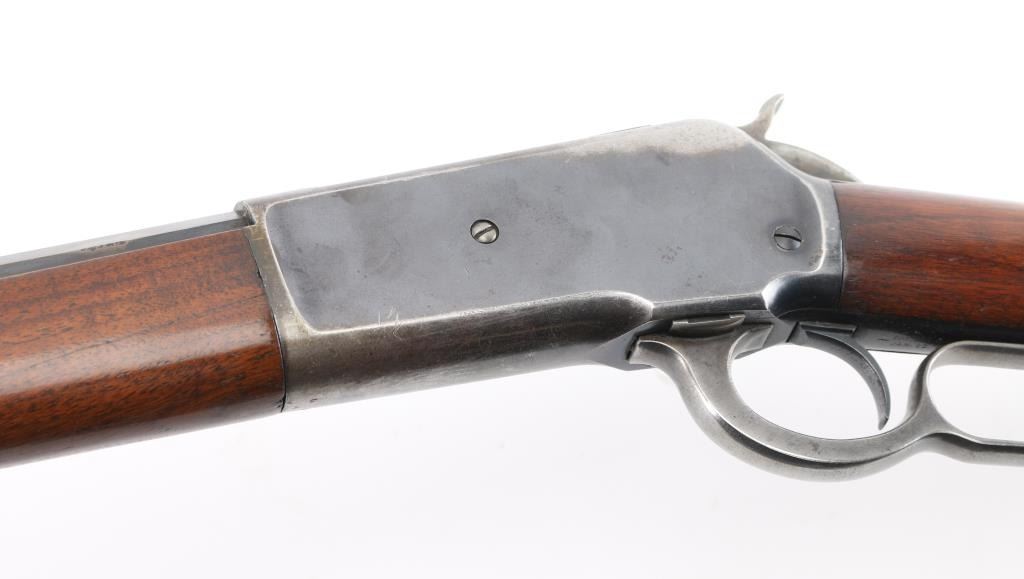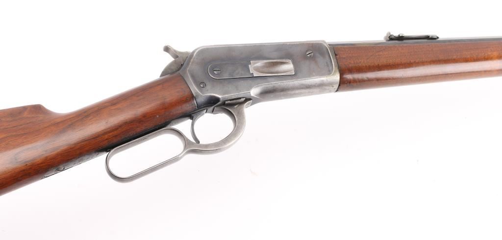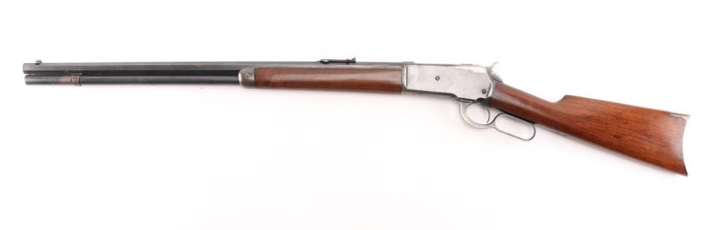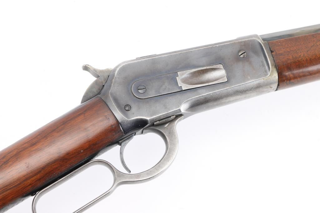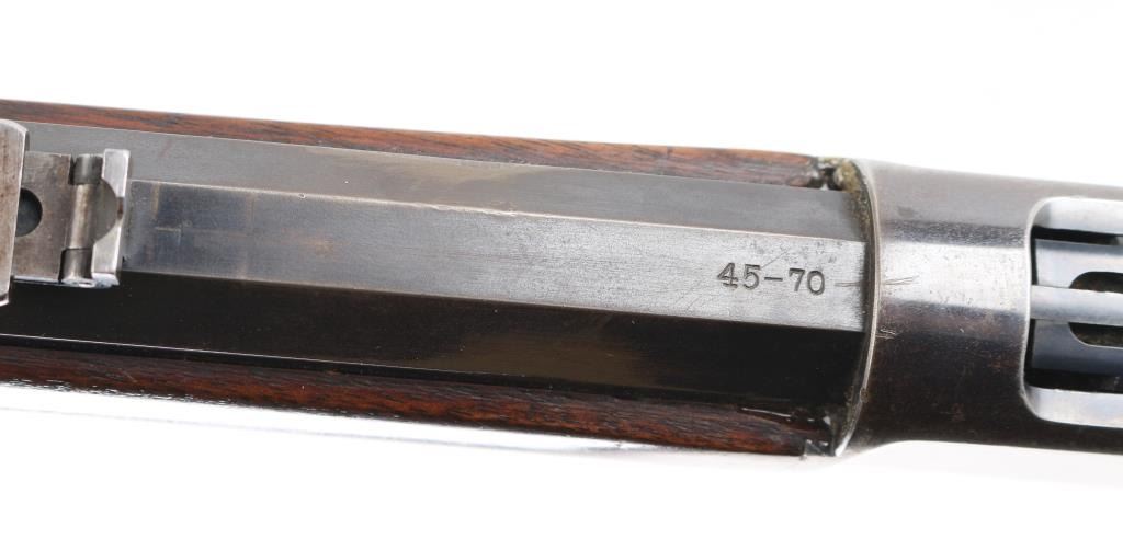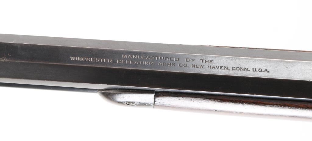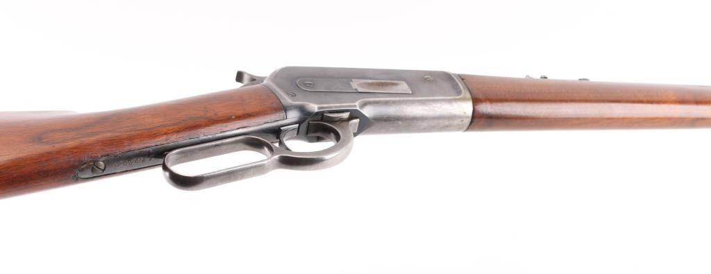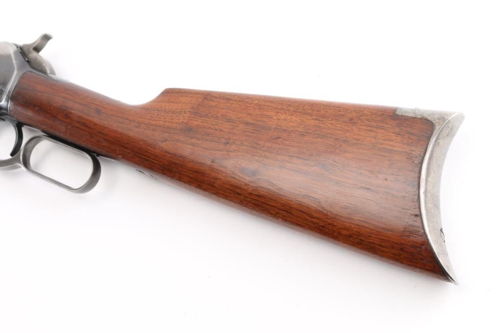 Lever action rifle manufactured circa 1903. Features blued finish, smooth walnut, straight wrist stocks, 26" octagon barrel, full length magazine tube, dovetailed blade front sight, folding elevation adjustable rear sight, steel crescent buttplate. Bore is good condition, fairly bright with strong rifling, showing frosting throughout, small areas of light pitting or leading. Retains about 60%blue, showing handling loss and edge losses. mostly to the receiver, scratches, area of finish loss on the upper magazine. There is a small area of loss on the lower right barrel, where it looks like someone buffed a small dent on the edge of the barrel flat, does not effect the bore. Wood is very good condition. NRA Condition-Good. C&R Firearm.