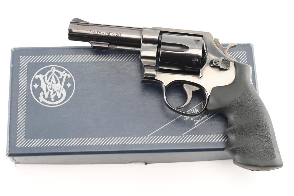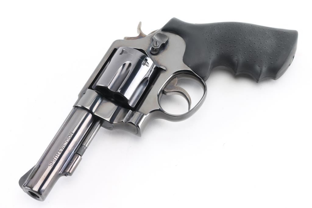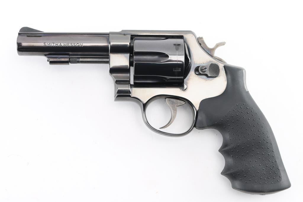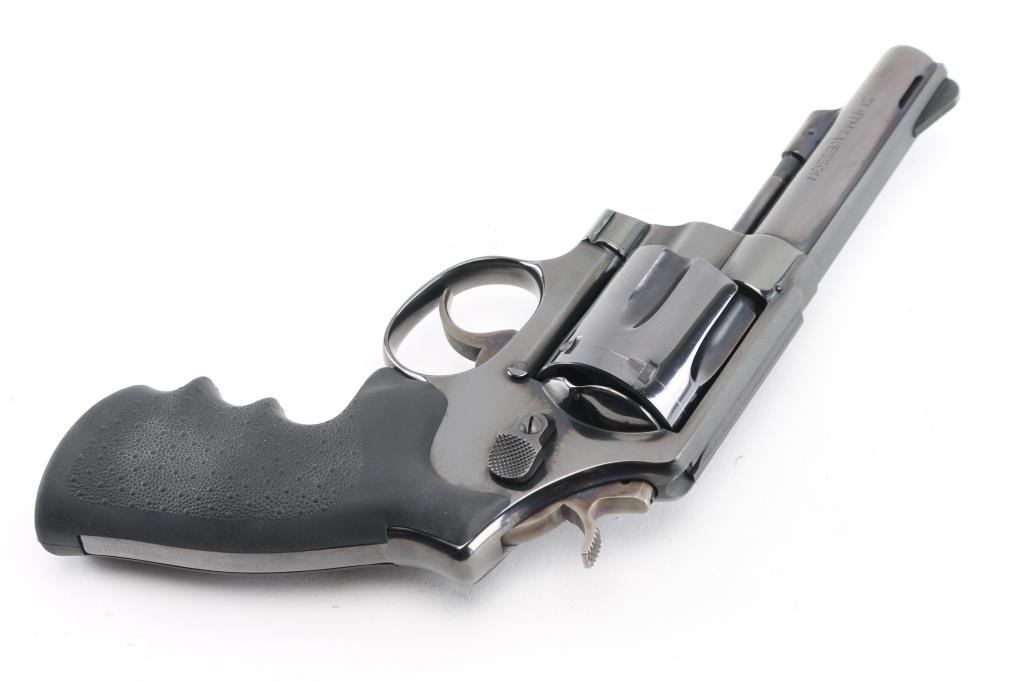 SN: N271843. Double/Single-Action revolver. 6-rd capacity. (1974-1977) K-frame. 4" Heavy pinned, ported barrel with serrated front blade, and square notch rear sights. Square butt. Blued finish. Pebbled black rubber Hogue grips. Smooth trigger. Action is crisp/tight. Cylinders/bore are excellent. Blued finish is about 97% with some tracking on the cylinder, minor scratches, and slight muzzle wear. Grips are excellent. Comes in its original blue factory box with paperwork & cleaning gear. NRA Condition-Excellent. Modern Firearm.