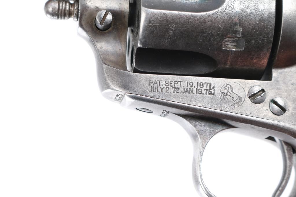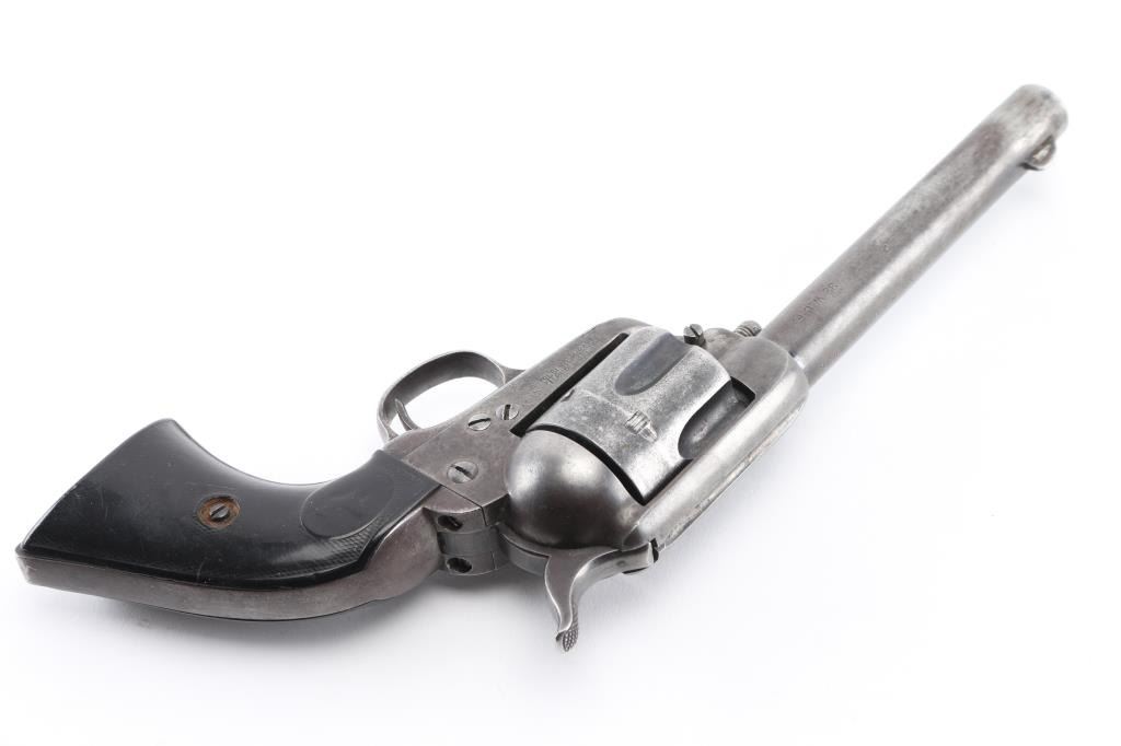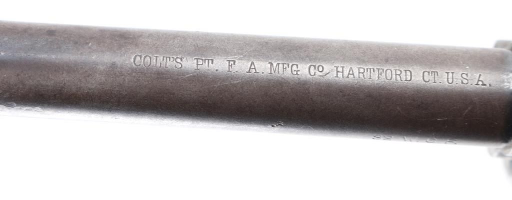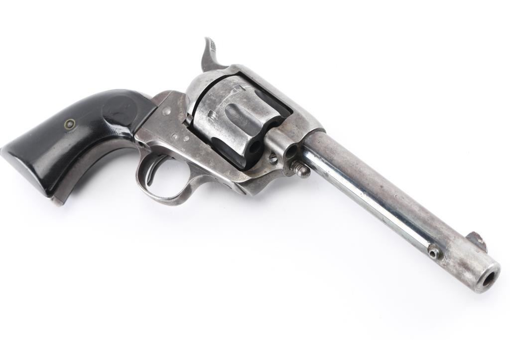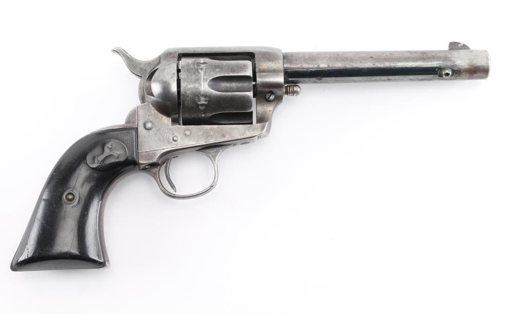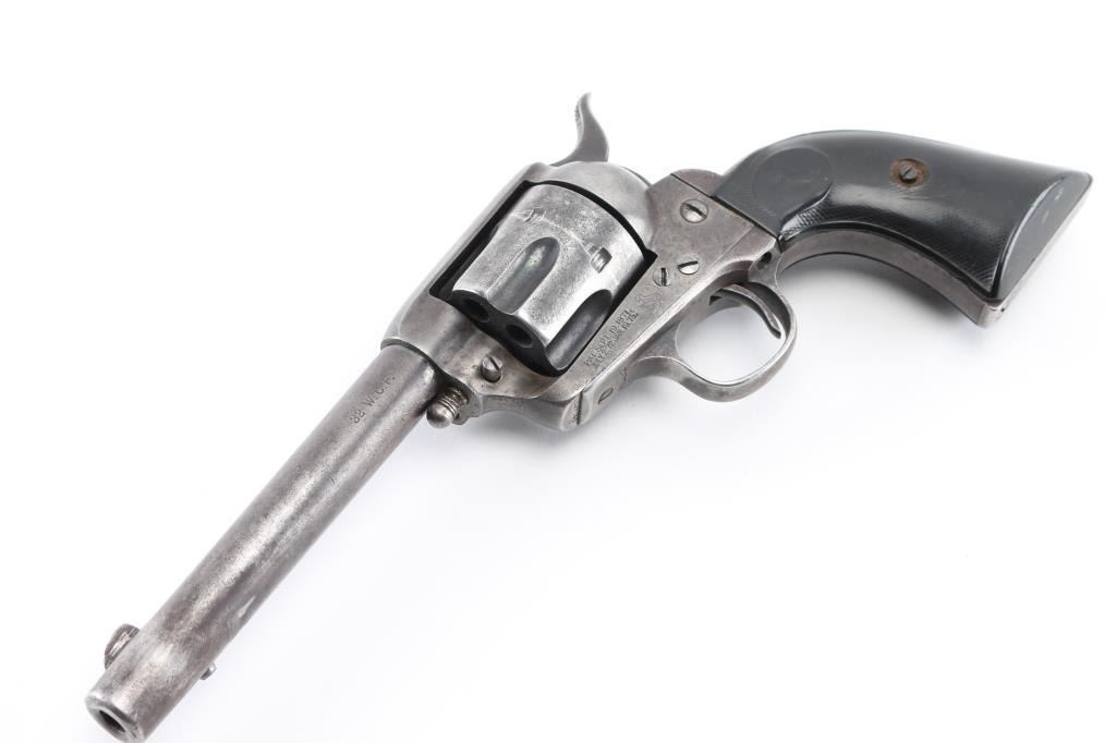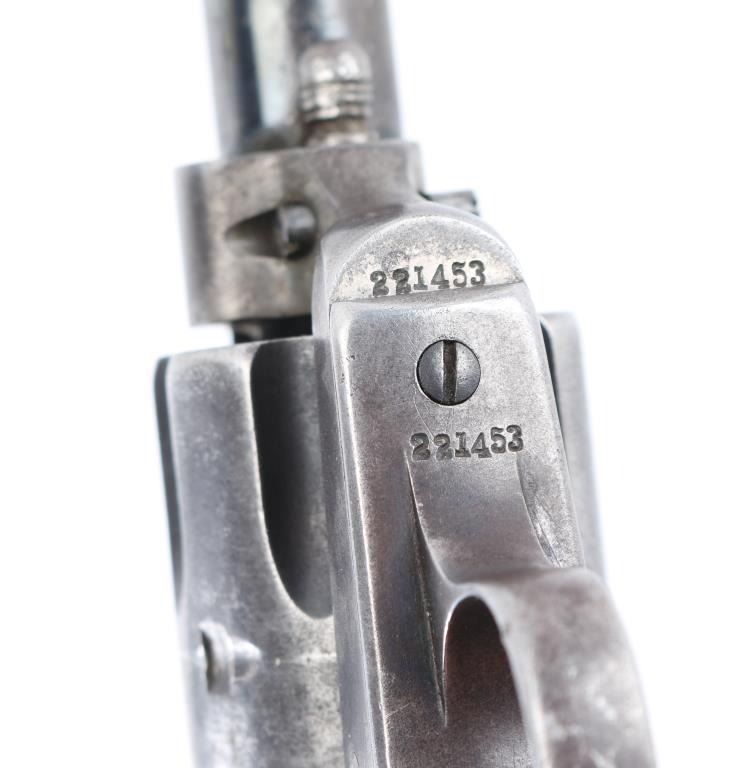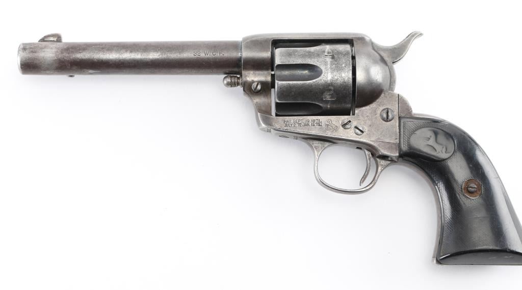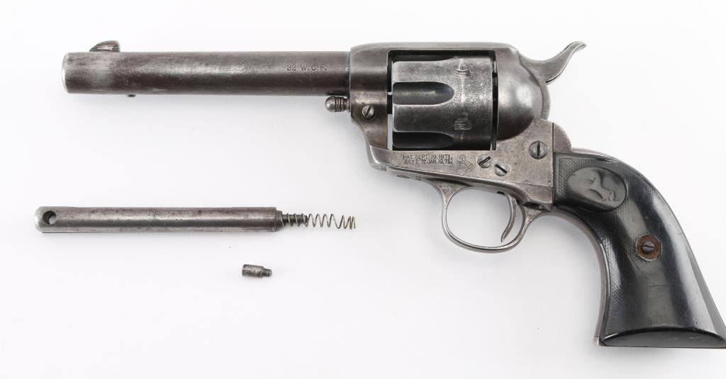 Single-action. 6-rd capacity. The classic American Colt SAA 1st Generation smokeless chambered in .32 W.C.F. (32-20). Manufactured 1902. Blued metal finish, with black, hard rubber checkered grips with Rampant Colt. 5.5" barrel, with open iron sights. V-notched frame. One line Colt address on top of barrel. Caliber on left side of barrel. Patent dates, and rampant Colt on left frame. Serial numbers match on frame, triggerguard, and backstrap. Numbers, and markings are clear. Assembly number is clear on the loading gate. (494). Cylinder chambers appear excellent. Bore appears very good overall with strong rifling. There are small traces of blue in protected areas, he rest has turned to a dull gray patina. Missing the ejector, & ejector housing. Correct cylinder pin for this model. Grips are sound but worn smooth. Action is crisp/tight. NOTE* This revolver has a bulged barrel about 1/2" from the muzzle with corresponding dark ring in the bore. As a result of this the ejector housing is detached, retaining screw housing is damaged, so it won't accept the screw. Ejector head is broken off. These parts come with the revolver. Also the left grip is missing the screw escutcheon. NRA Condition-Fair/Needs Repair. C&R Firearm.