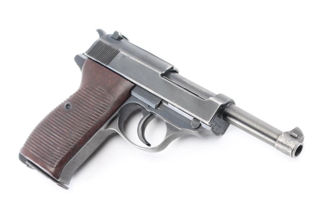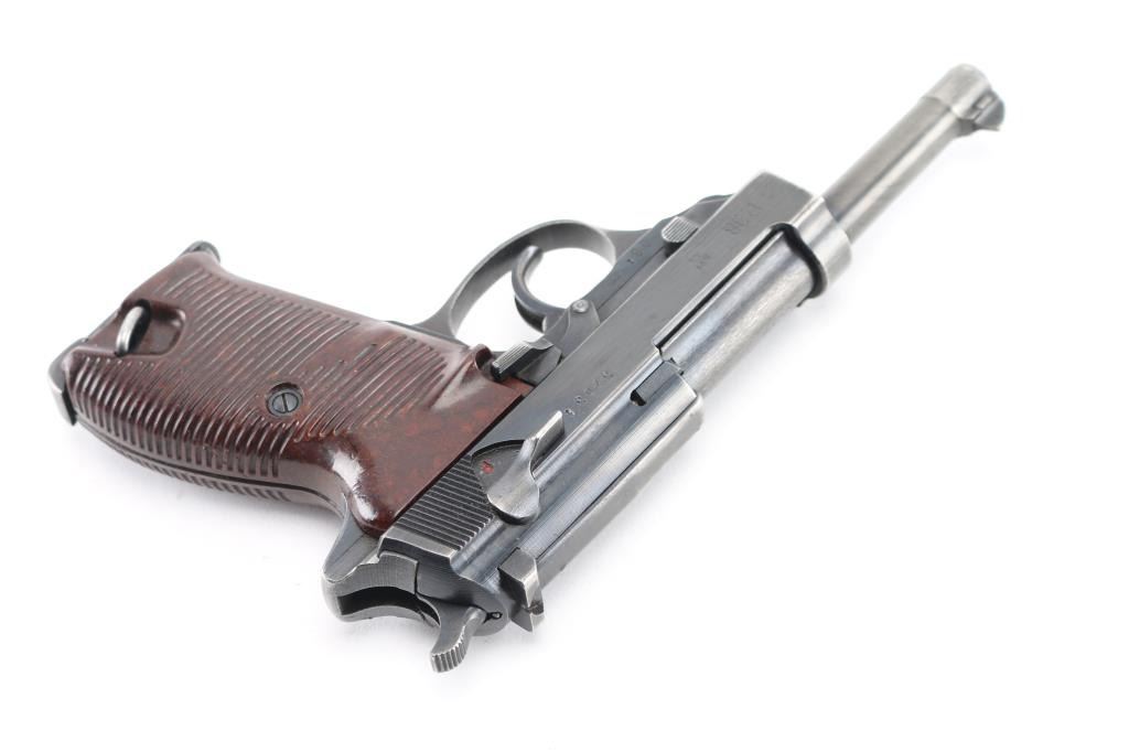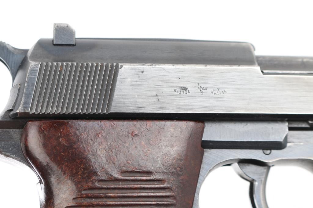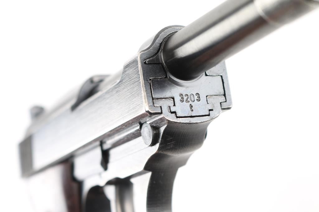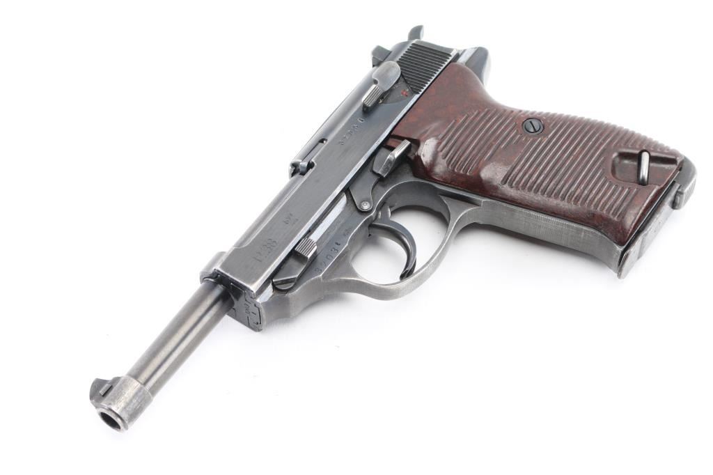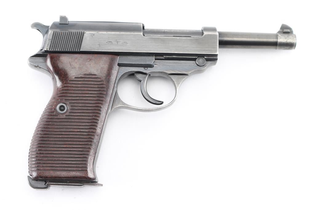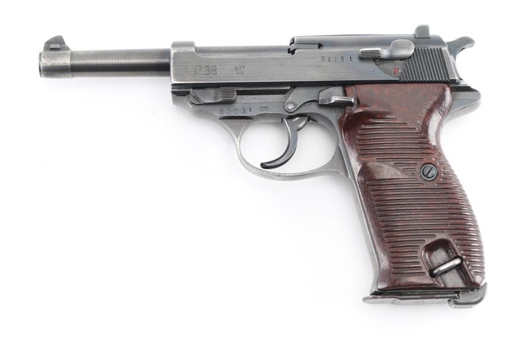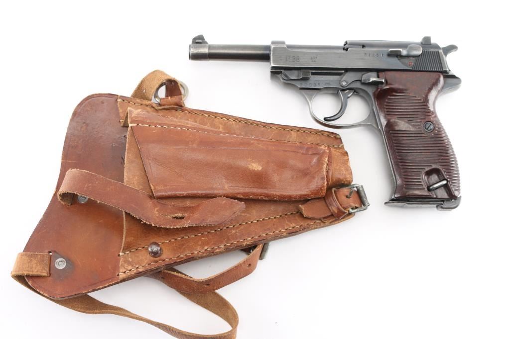 German WWII issue military semiautomatic pistol, circa 1944. Features blued finish, 4.9" barrel, dovetailed blade front sight, notch rear sight, slide mounted decocking safety, heel magazine release, grooved brown bakelite grips. Bore is very good. Retains 90% finish with edge losses, slight fading or thinning on front strap & trigger guard. Grips are very good. Numbers match on frame, slide, barrel, locking block. Waffenamt 135 on frame & slide with eagle/swastika proof. Magazine is good condition, 'jvd' marked. No importer marks. Comes with rare original WW2 brown leather P.38 shoulder holster with magazine pouch. These holsters were unmarked, complete with straps. Condition is NRA Very Good+. C&R Firearm.
