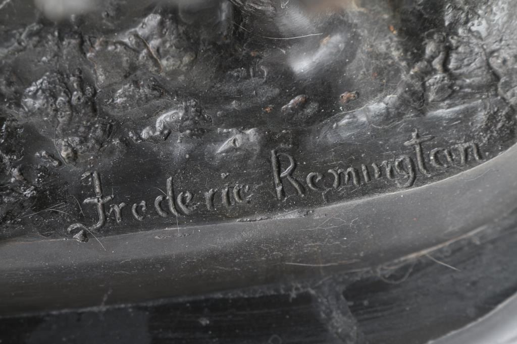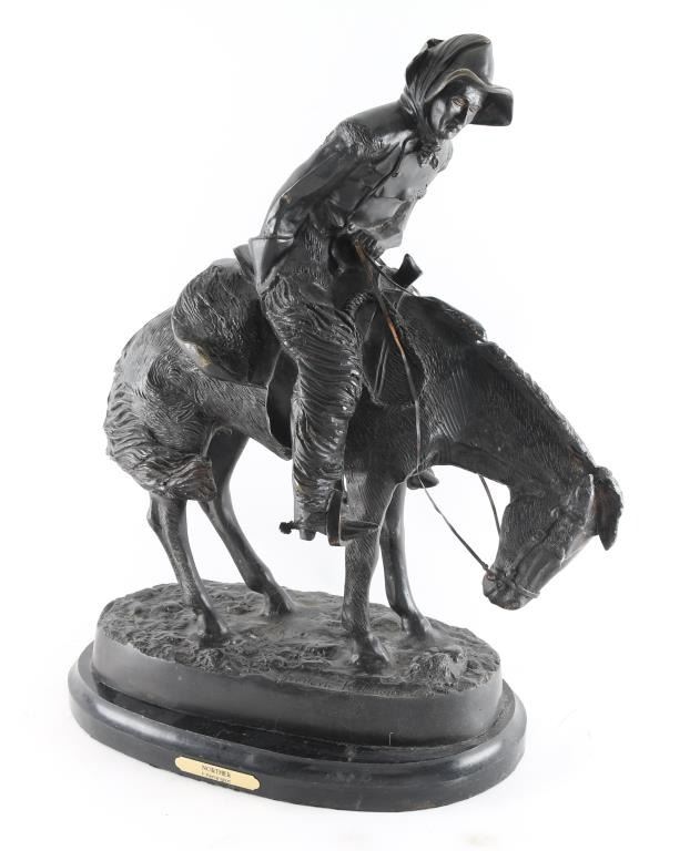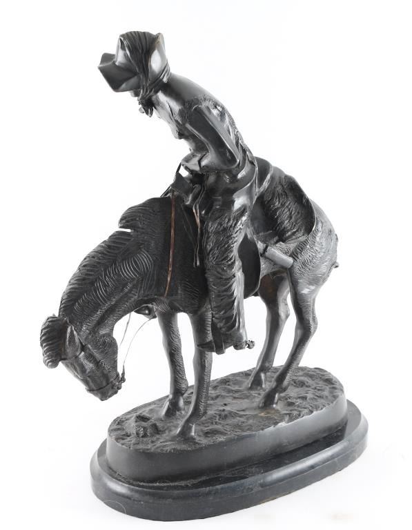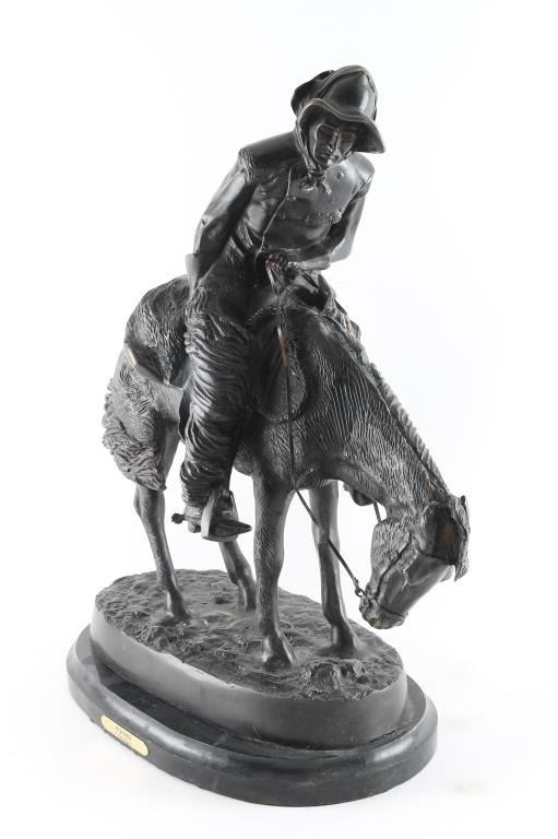 By cowboy artist Frederic Remington entitled "The Norther" signed on base. Mounted on marble base. Measures 22x17".