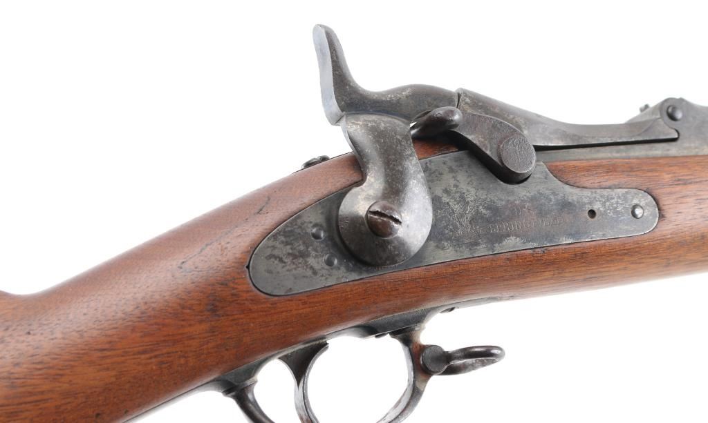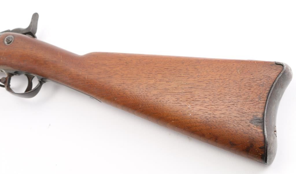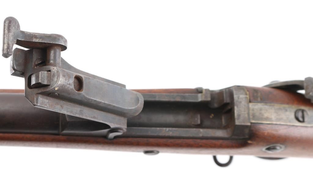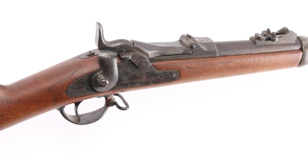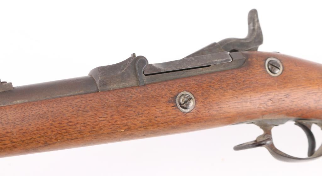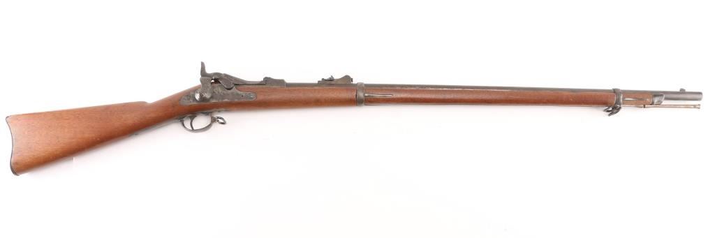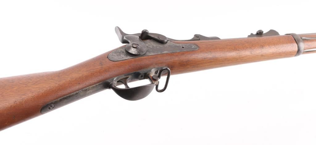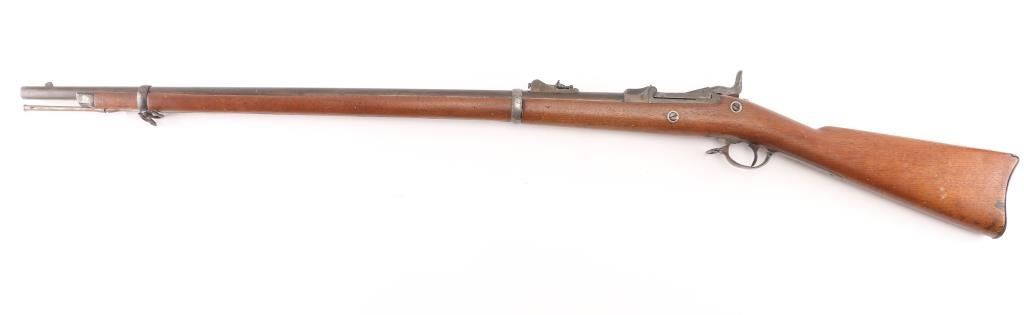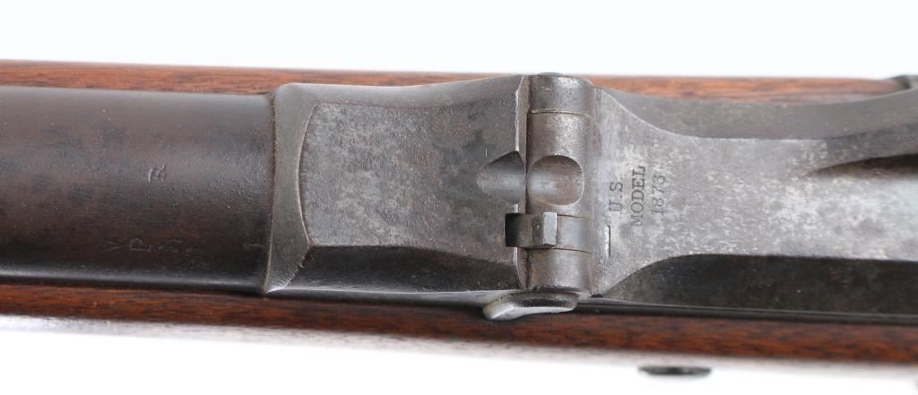 US military single shot rifle manufactured circa 1883. Features 32" barrel, blade front sight, 1873 rear sight with elevator ladder and tangent rails, cleaning rod, sling swivels, stacking swivel, external hammer, straight gripped walnut stock, curved steel buttplate. Bore is fair, rifling with scattered areas of pitting. Metal finish has turned a a molted gray/brown patina. Wood is sound has been sanded, & Refinished, no visible cartouches. Breech block is dated 1873. Barrel marked over chamber "V / P / (eagle head)", "P". "R" marked rear sight on base.. "US" on butt plate at top of heel. Lock plate marked "U.S. Springfield 1883". Condition is NRA Good. Antique Firearm.