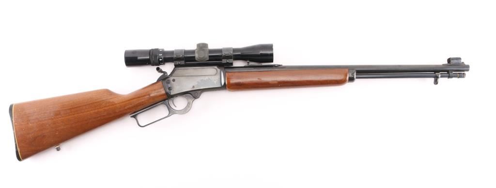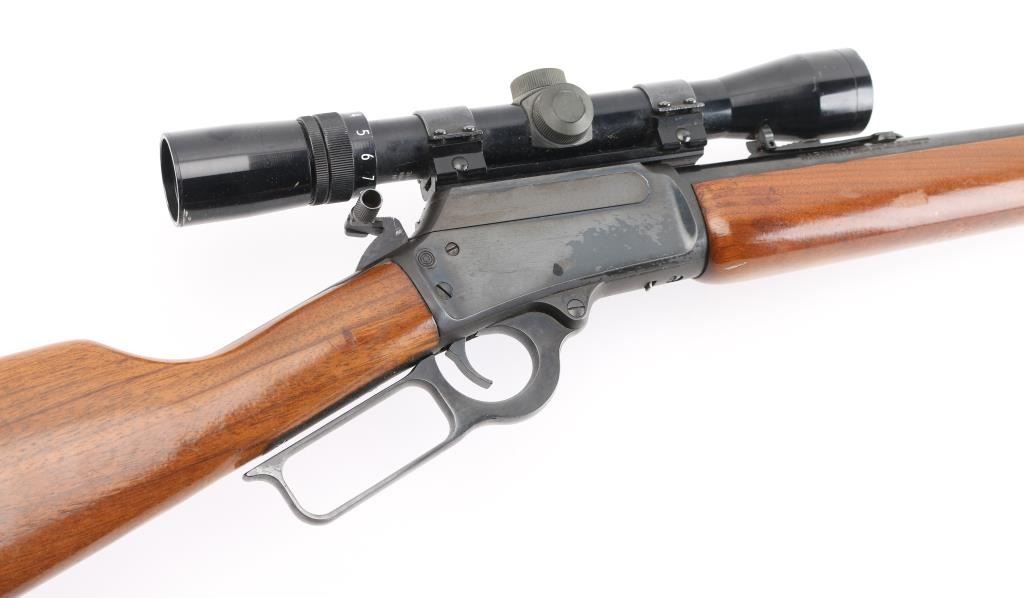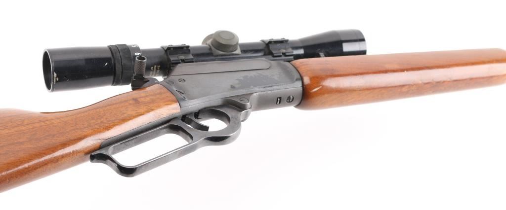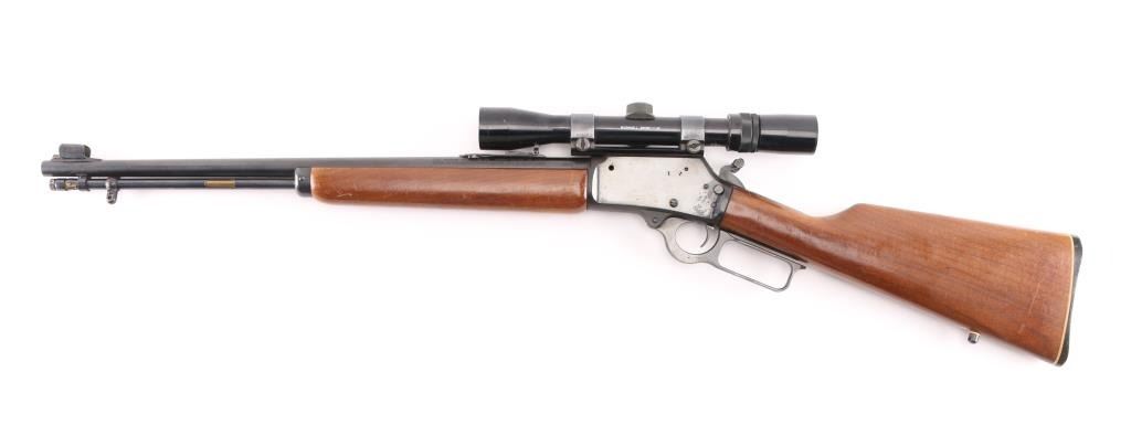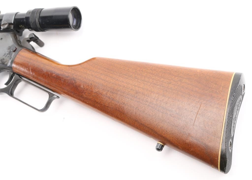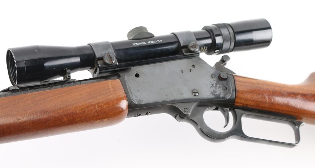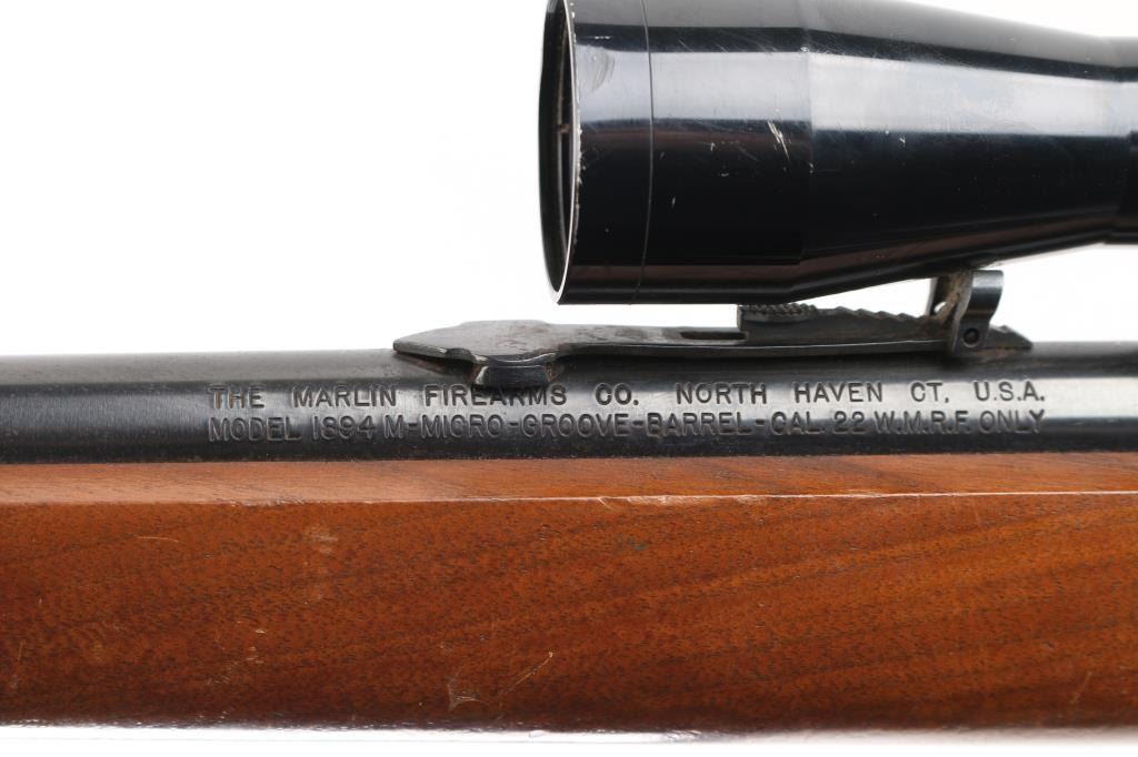 Marlin Model 1894M lever action rifle in .22 W.M.R.F. (Winchester Magnum Rimfire). Manufactured in 1983, making this a first year production of this model. This 1894M is in good condition. Features a 20" micro groove barrel with an excellent bore. Also has a "JM" stamp indicating it was made the by the original Marlin firearms team. An elegant rifle chambered for pistol calibers. Its handy size is punctuated by a quick-pointing, straight-grip stock design and Old West-styled, adjustable semi-buckhorn sights. The Model 1894M, manufactured from 1983-1989 is a caliber .22 Magnum lever action with no loading gate and a tubular magazine. Only approximately 12,000 made. Finger extension on hammer spur. Sling studs. Mounted with a Bushnell Sportview 3x-9x, 32 scope with Weaver rings, clear optics. The top of the tube magazine has a small crack, does not interfere with the operation of the rifle. NRA Condition-Fair (magazine tube) Modern Firearm.