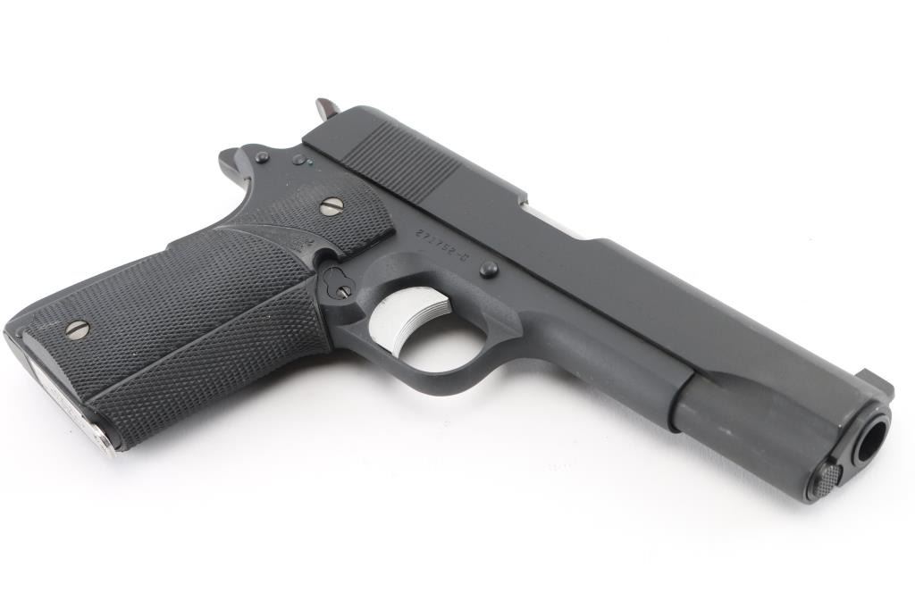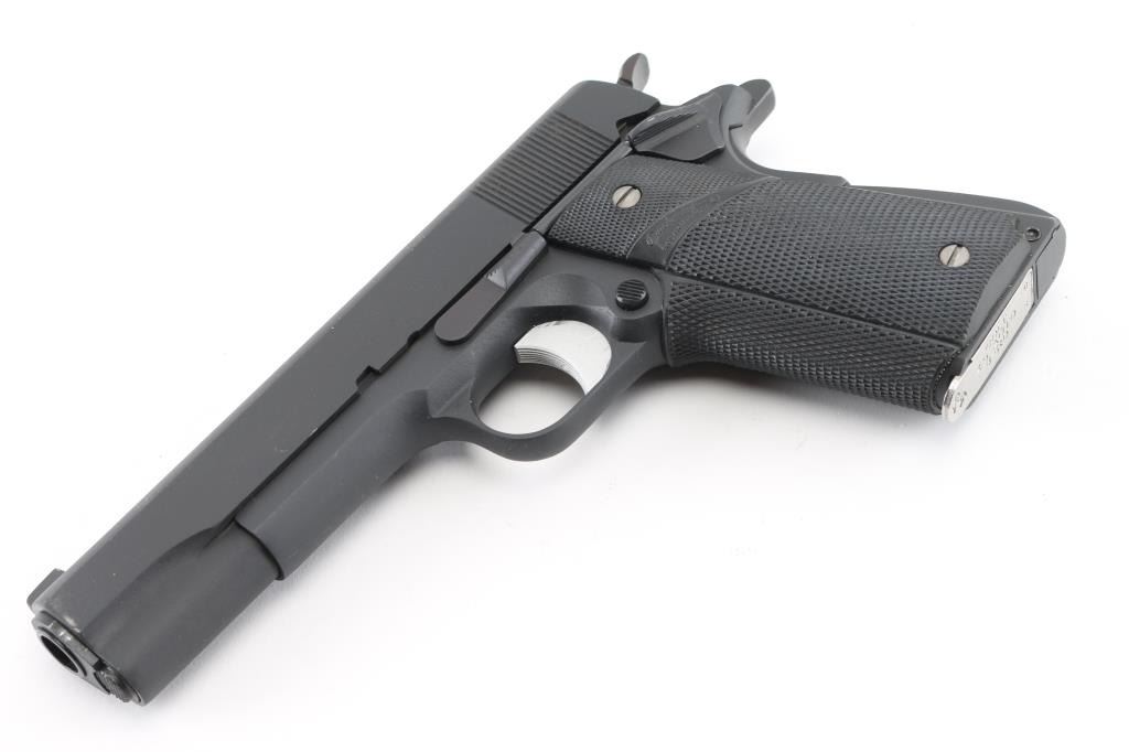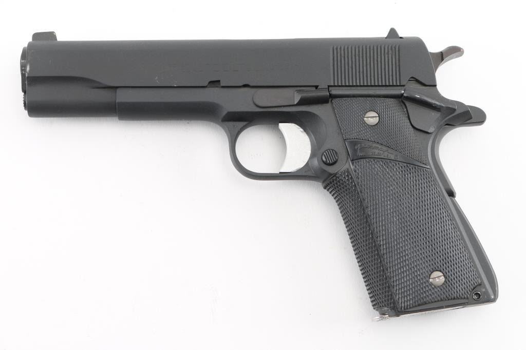 1911A1 pattern single action semi-automatic pistol manufactured circa 1955. Features matte black re- finish, 5" barrel, blade front sight. square notch rear sight (Missing the screw, so sight is loose in the dovetail), serrated trigger, knurled hammer spur, thumb safety on the left side of the frame, grip safety, push button magazine release, steel frame, serrated arched mainspring housing, Pachmyer checkered black rubber wrap around grips, later replacements. Bore is very good condition. Retains 98% re-finish with some minor edge wear. Grips are excellent. Includes (1) Colt magazine. Marking are a little faint due to re-finish. Condition is NRA Excellent (Re-Finished) C&R Firearm.