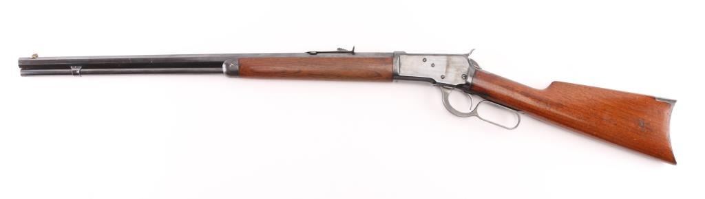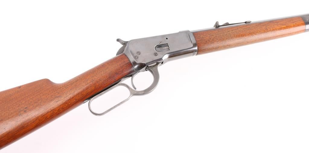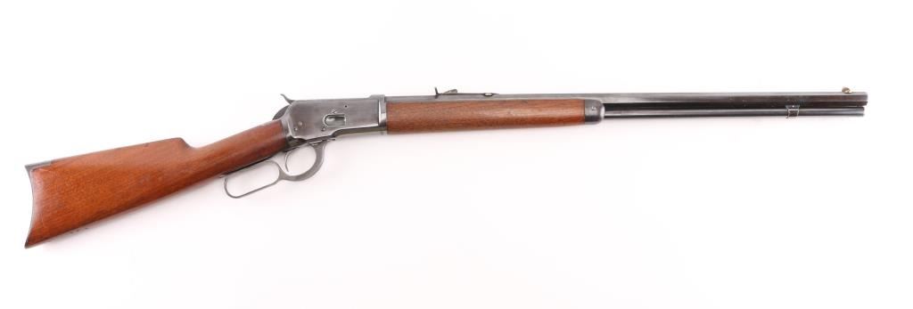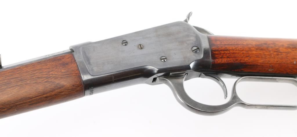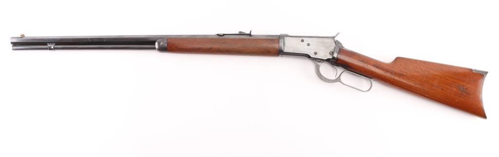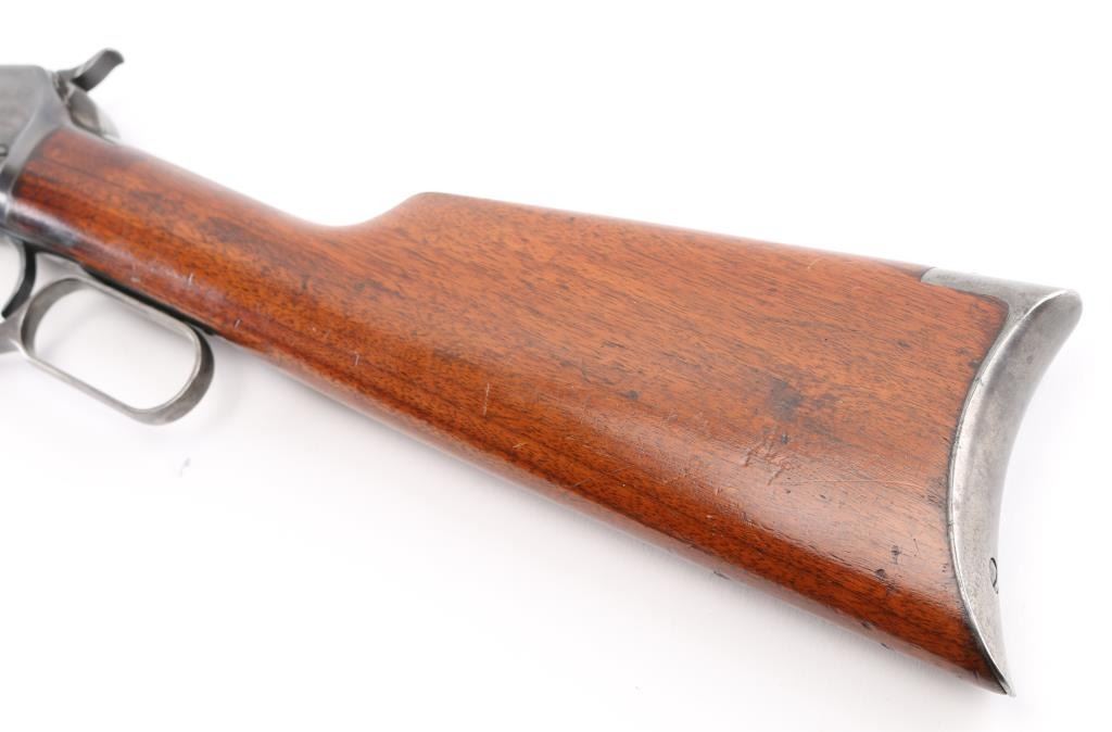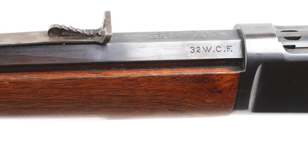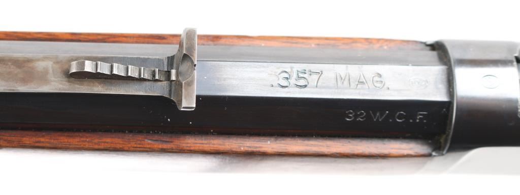 Lever action rifle manufactured circa 1910, re-finished and re-chambered to 357 Magnum. The metal surfaces retain approximately 98% of quality re-finish. Markings are sharp. The original 24" octagonal barrel is marked ".32 W.C.F.". The smooth wood stocks have been varnished. The butt stock ends with a smooth steel crescent butt plate. The bore is excellent and the action is crisp. NRA Condition-Near Excellent/Refinished, C&R Firearm.