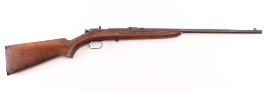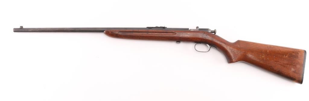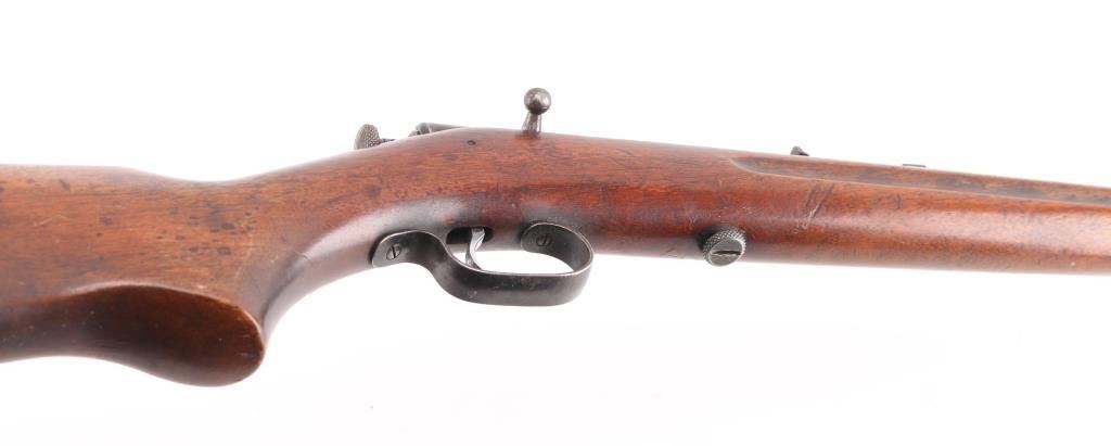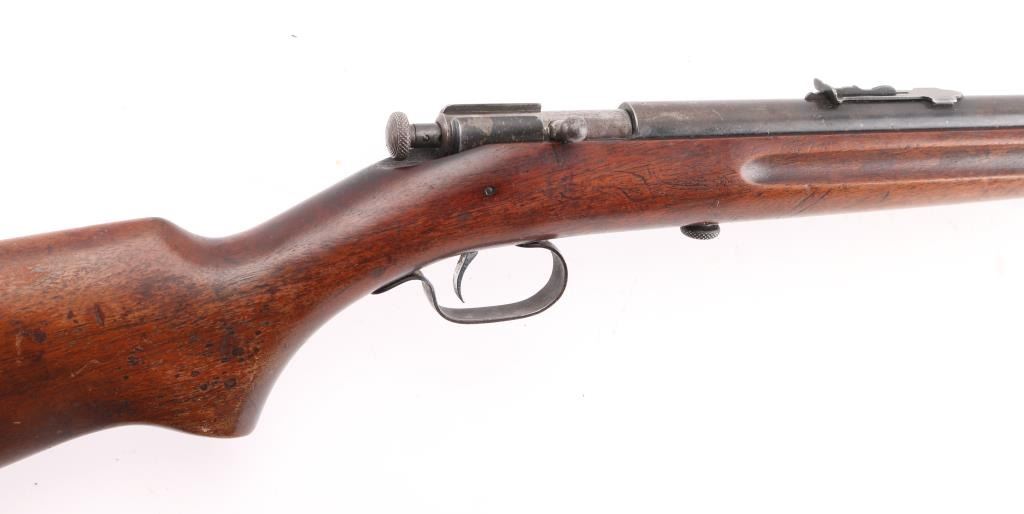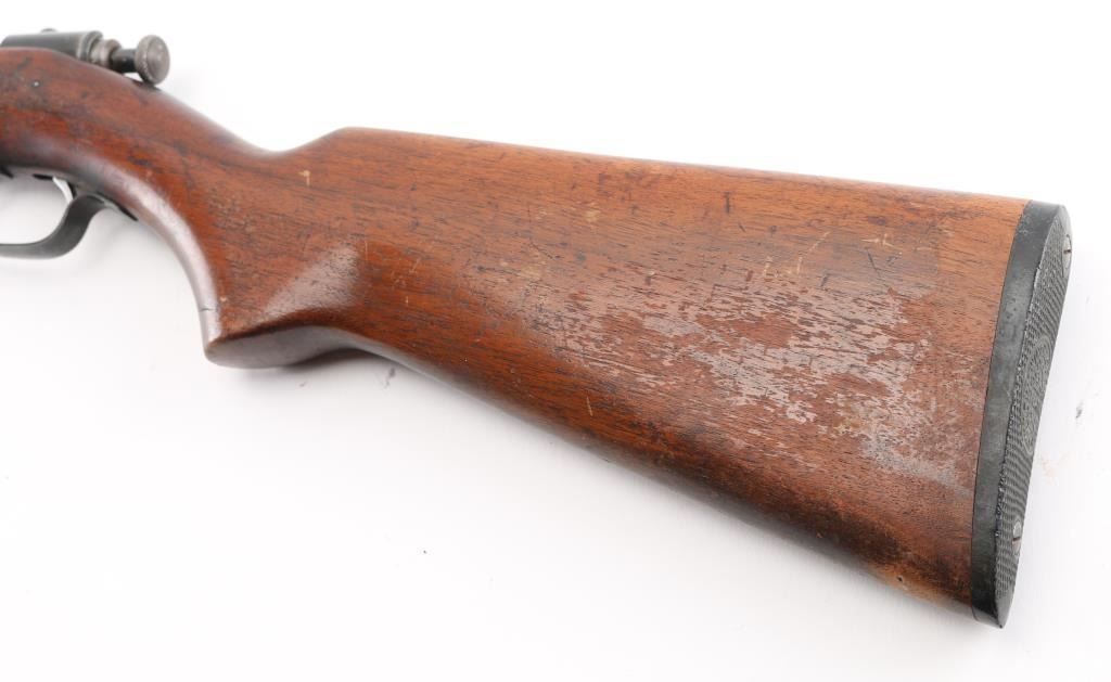 Note^ Parts/Repair gun. Vintage manual-cocking single shot bolt-action rifle chambered in .22 Short, Long & Long Rifle, circa 1931-1939. Features a blued finish, 23" barrel, dovetailed blade front sight with brass bead, adjustable rear sporting sight, bent bolt handle with round knob, serrated cocking piece, smooth trigger and one-piece walnut pistol grip should stock with factory black hard rubber buttplate. Rifle exhibits most of the original blued finish in protected areas with the balance of the metal surfaces turned to a nice aged brown patina. Action performs well, bore is good. needs cleaning and wood stock is good. Bolt is loose in the receiver, trigger is loose, does not fire,. Condition is Poor/Needs Repair. C&R Firearm.