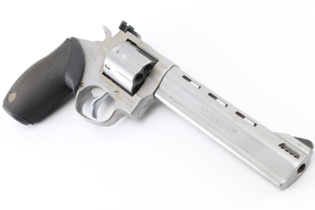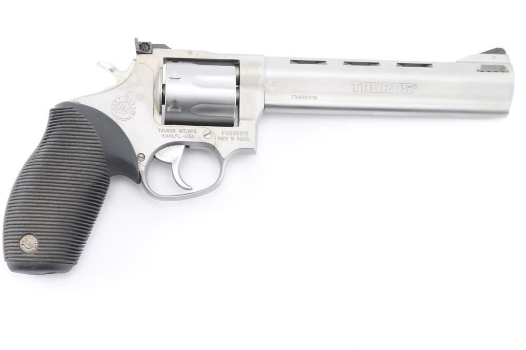 Brazilian made stainless steel double action revolver chambered in .357 Magnum. Features a matte stainless steel finish, 6.5” vent rib, ported barrel with full underlug, raised ramp front sight with orange accent, adjustable rear sight, fluted seven-shot cylinder, transfer bar safety, integral locking safety, (No key) semi-target hammer & trigger, and an ergonomic shock absorbing black rubber grip with brass Taurus medallions. Revolver exhibits only a few bright handling marks and a thin drag line on the cylinder. Action is smooth, the bore looks very good, needs cleaning. and the rubber grip is fine. Condition is NRA Excellent. Modern Firearm.
