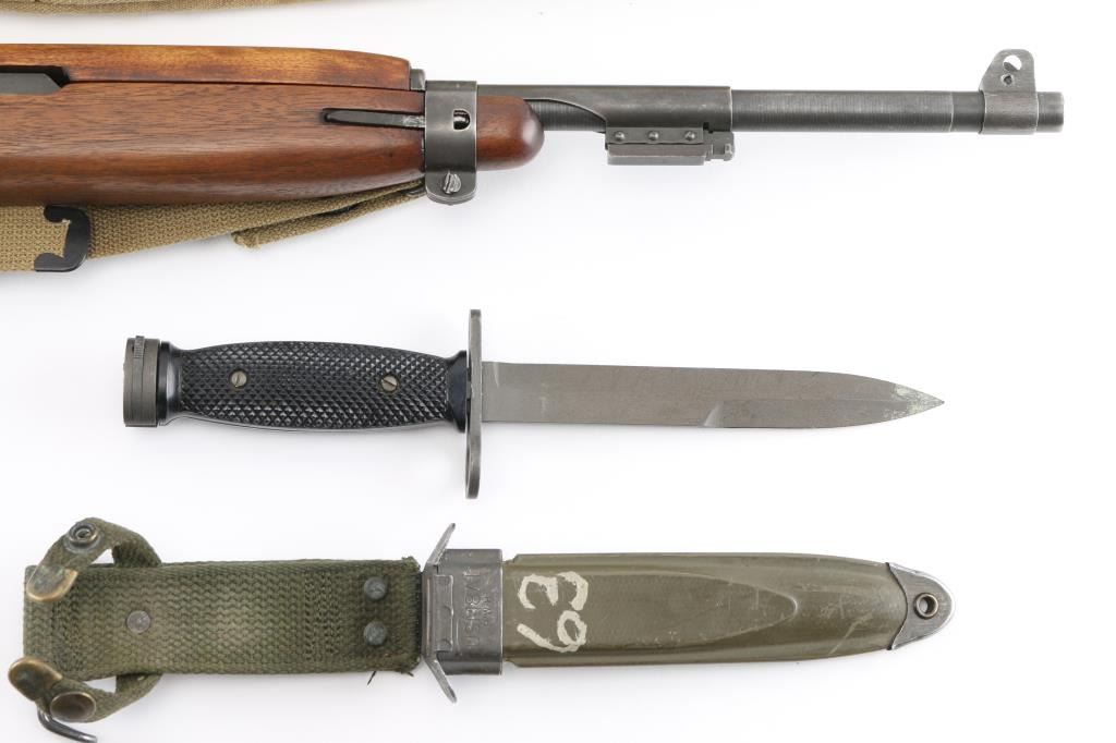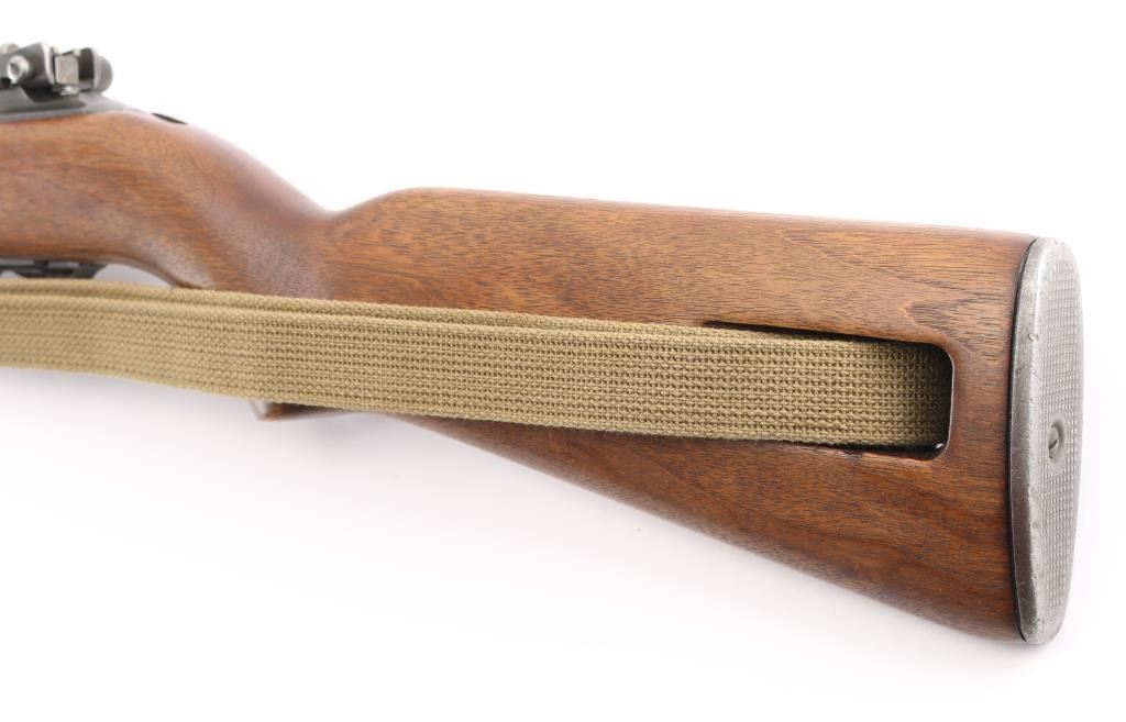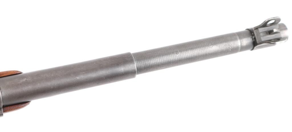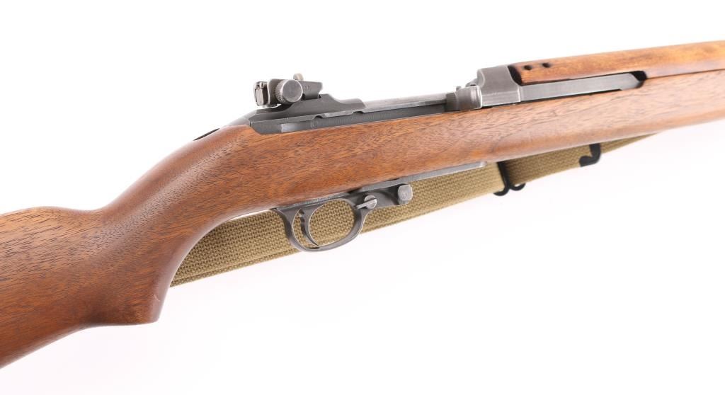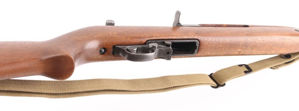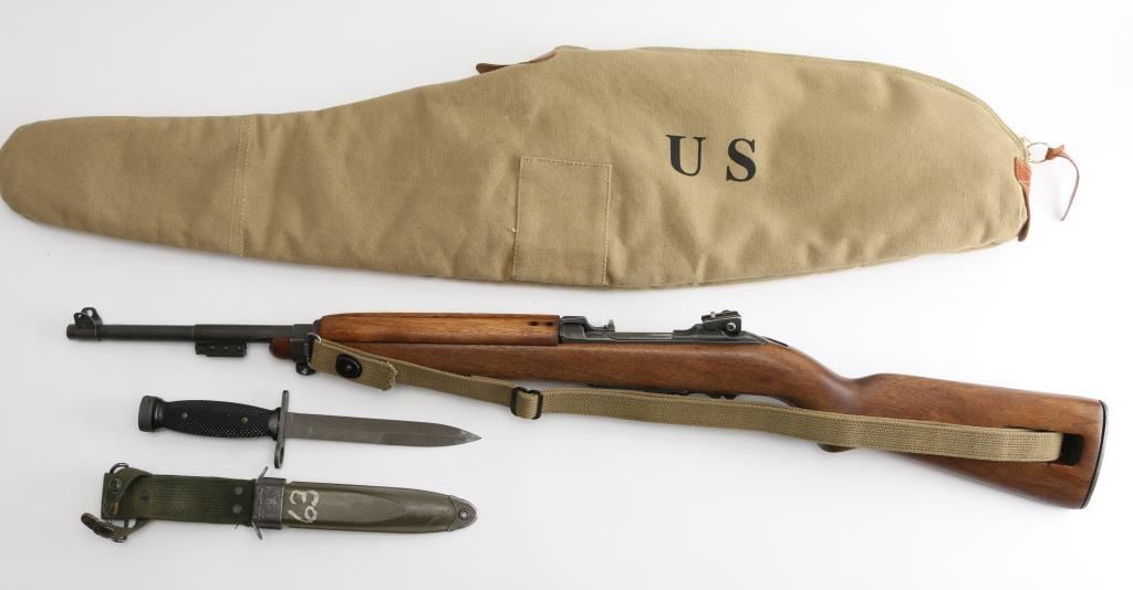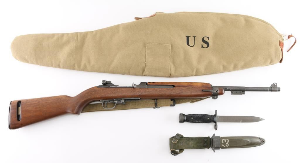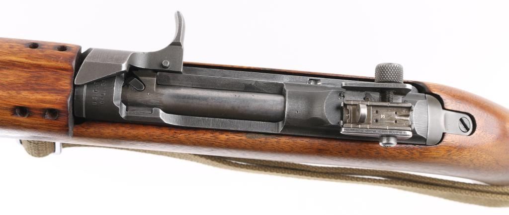 WW 2 US military semiautomatic rifle. Features parkerized finish, blue bolt, walnut stock & handguard, protected blade front sight, late stamped Adjustable rear sight marked "I.R.C.O" ( International Register Co.) 18" barrel, rotary safety with "SS" in circle (W.M. Steinen), Type 3 barrel band with bayonet lug marked " M.M.Q." Late war 4 rivet handguard, type 2 mid-war high wood stock with oval oiler slot. late war round bolt, mag release stamped "M". Bore is excellent bright. Retains 80% finish with loss on edges, handling wear mostly on the bolt. Markings include "ROCK-OLA" on receiver, barrel marked "Underwood 1-44" with flaming bomb & "P" . Stock appears to have been refinished at some point, no visible cartouches. No importer marks observed. No magazine Comes with a U.S. Camillus M4 bayonet with M8A1 scabbard, very good condition, U.S. marked green canvass case & sling. (Repros) NRA Condition-Good to Very Good. C&R Firearm