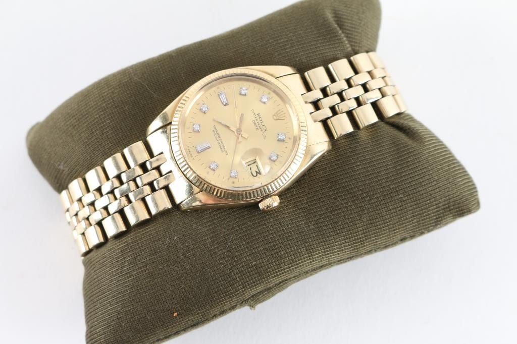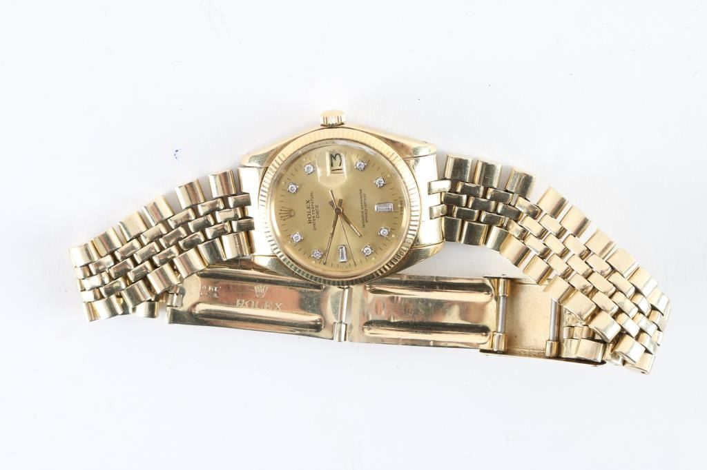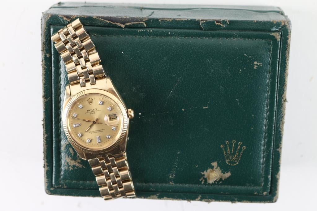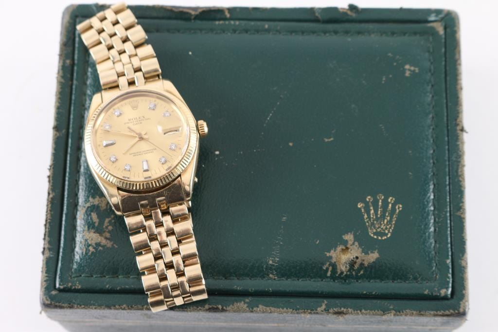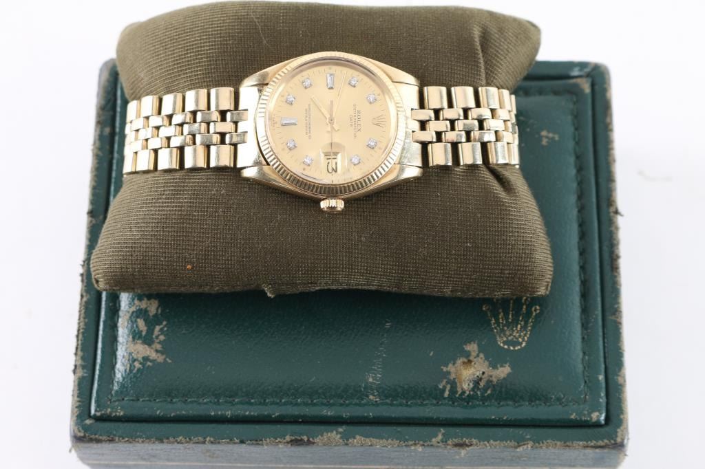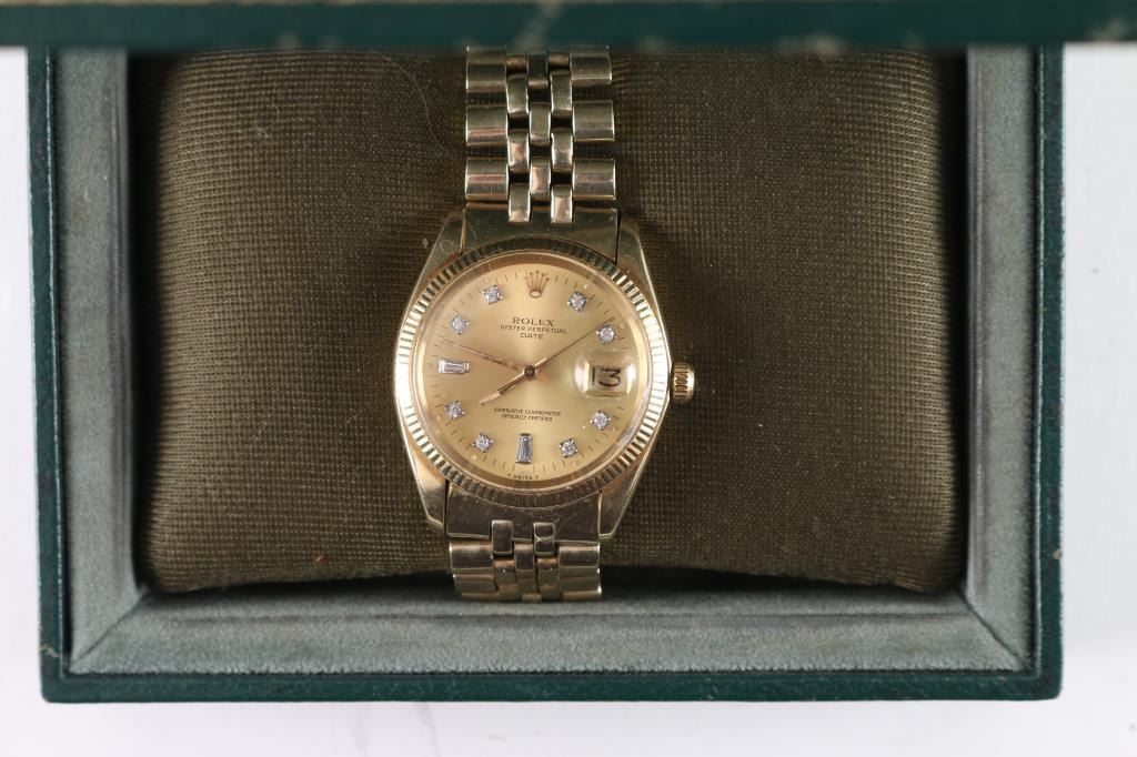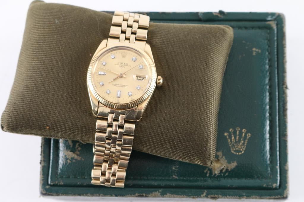 Vintage wristwatch with Rolex automatic movement, 35mm 14kt yellow gold case, fluted bezel, upgraded champagne dial with diamond markers, date display, and old style 14kt yellow gold bracelet with deployment clasp marked Rolex. Approximate 8" circumference. Watch is marked .585 & 14K indicating American import circa 1960's-70's. Includes a vintage Rolex case. Watch is in good working condition with superficial scratches on the exterior and wear to band.