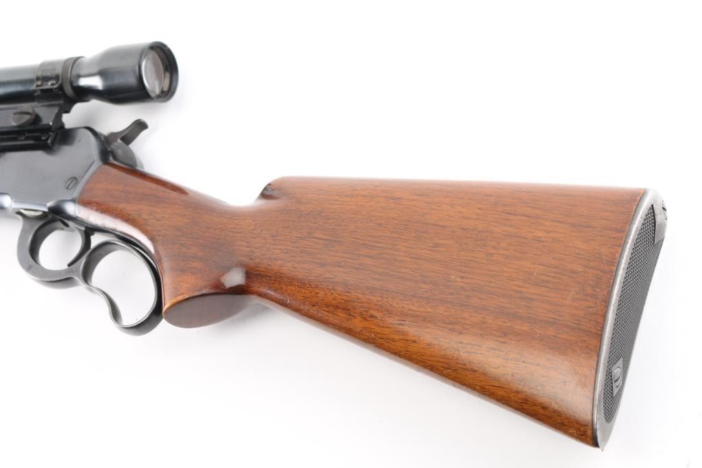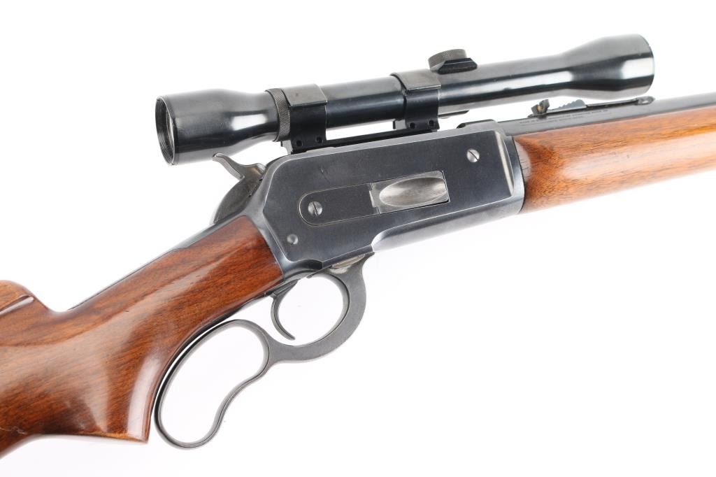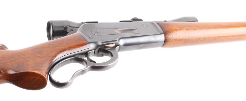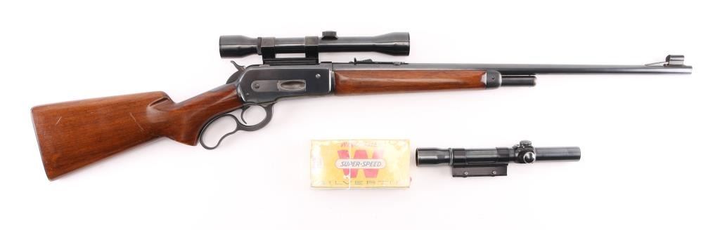 American made, pre-war, lever action rifle with a long tang, standard version, manufactured circa 1938, blued steel, approximately 24" barrel, tunneled ramp front sight, buckhorn rear sight, tube fed, side loading, top ejection, checkered hammer spur, curved oval loop, smooth trigger, checkered metal buttplate, finish is excellent, Walnut pistol grip stocks are complete but show some dings, unmarked scope with Weaver mount. Includes a leather buttpad, Weaver K25 scope, one sealed 20-round box of Winchester .348 Win Silvertip 200 grain expanding bullet ammunition. The Model 71 was never chambered to any cartridge except .348, and the .348 was never factory-chambered to any rifle other than the 71. It was—and remains—a big-game go-to combination. Stock style and barrels differed, but cosmetically and almost mechanically, it is an 1886, although few parts are interchangeable. **NRA Excellent** Modern Firearm