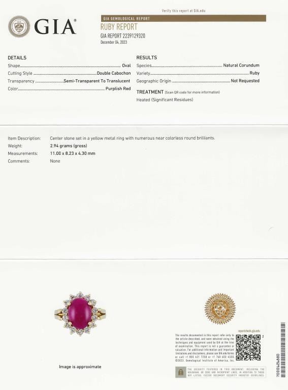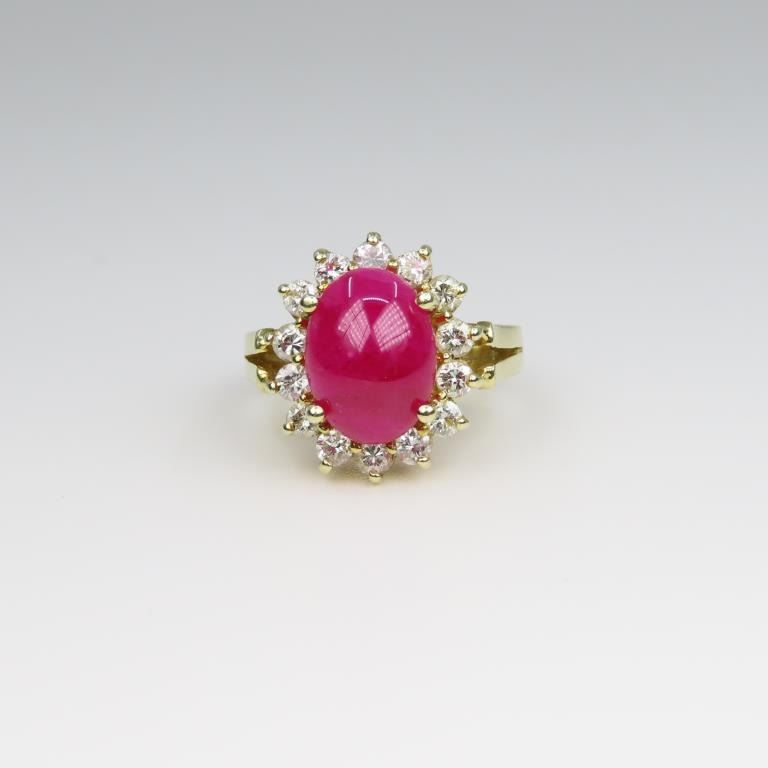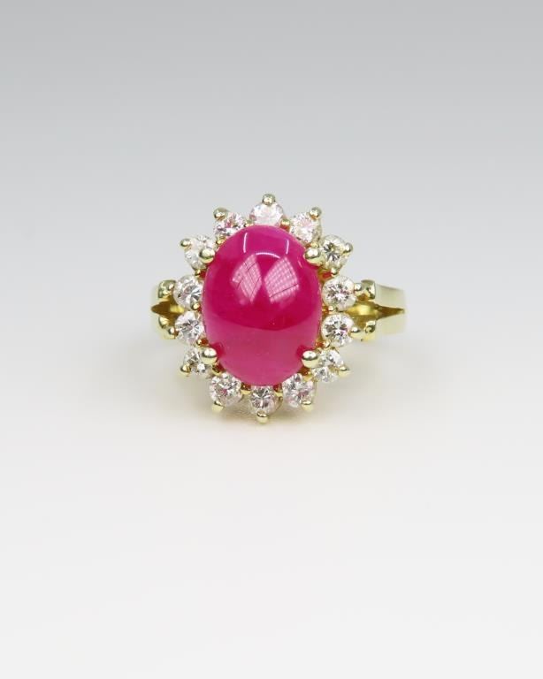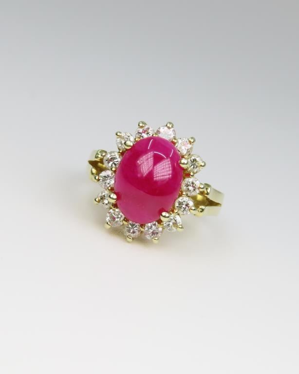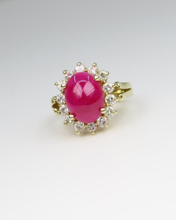 featuring an oval cabochon Ruby weighing approx. 4.00-4.50 carats framed with 14 round cut Diamonds weighing approx. 0.75 carats with H-I colors and VS/SI clarity set in 14 karat yellow gold setting. Retail $8,000-$12,000 Size 5.
