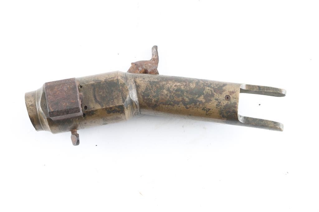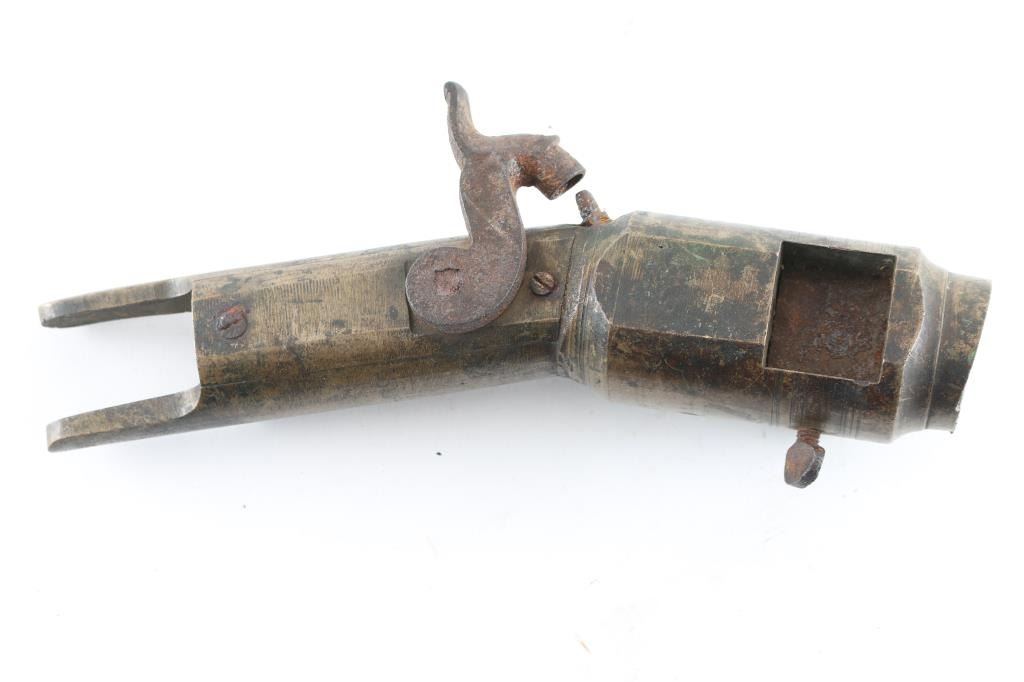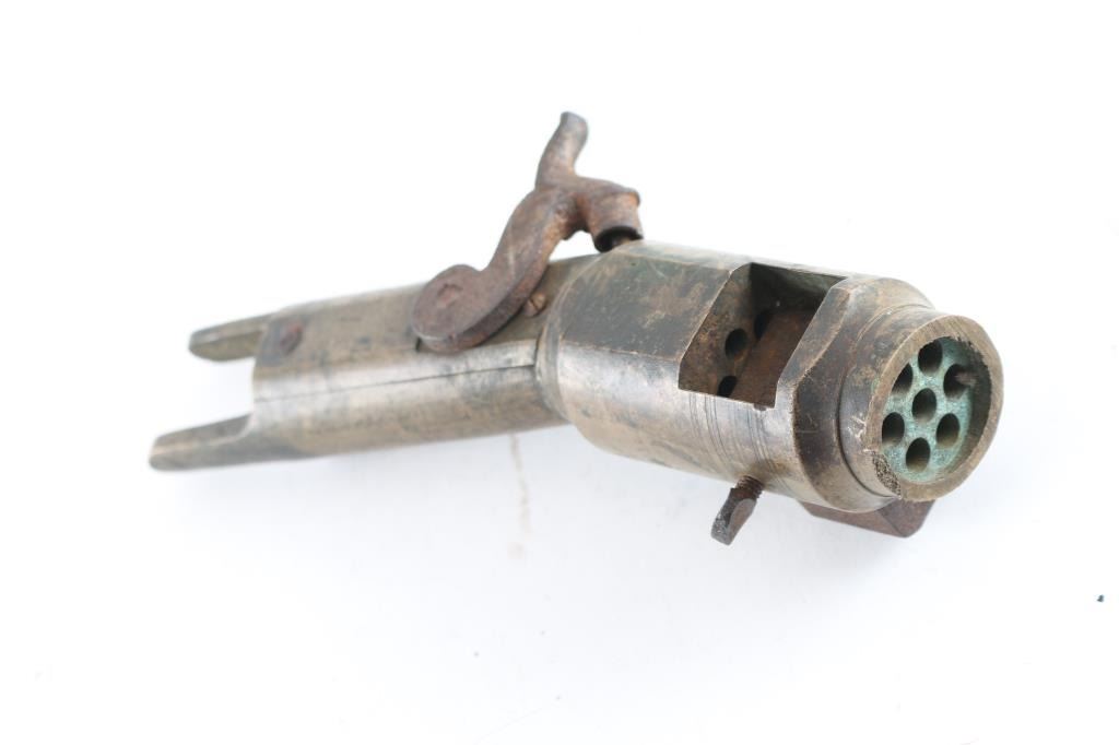 Patent model for the Henry Harrington percussion 7-shot volley gun. All brass construction with steel hammer. Side loading breech block. One percussion cap would set off all seven chambers. The final Harrington patent had a bottom loading block. Hammer does not cock/Block is frozen in place. Rare.
