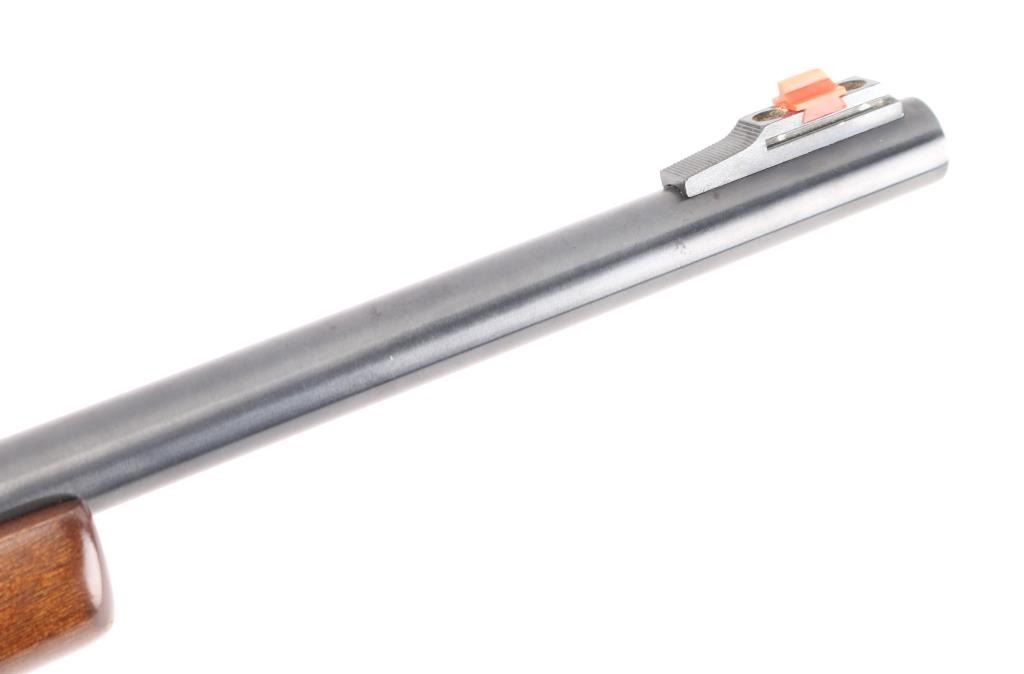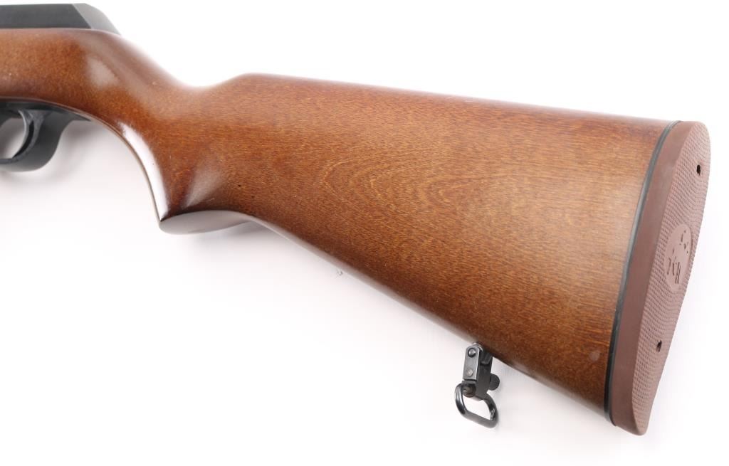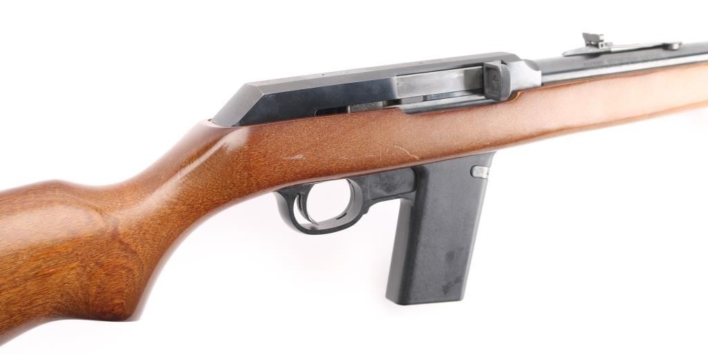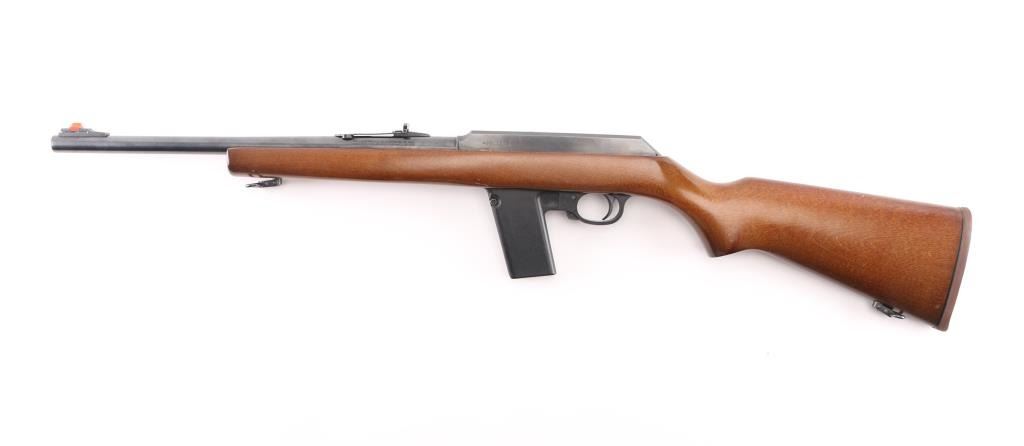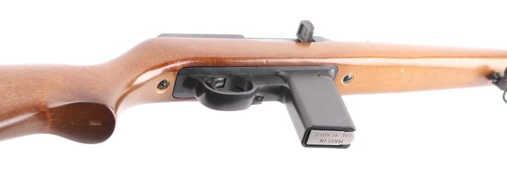 "The Camp Carbine". Semiautomatic carbine features 16 1/2" barrel, buckhorn style sights with orange insert front sight, removable sling swivels, manual safety, thin rubber butt pad, accepts detachable 1911 magazines. Plastic trigger guard and magazine well. receiver drilled/tapped for optics. Bore is pristine. Wood has some minor scratches, receiver has some minor scratches on the top. Comes with one Marlin magazine. NRA Condition-Very Good+. Modern Firearm.