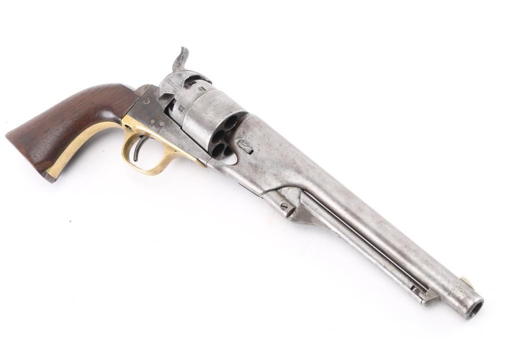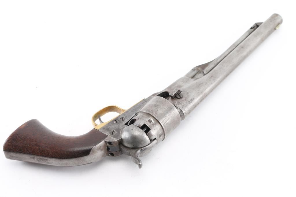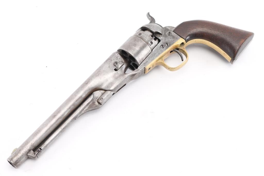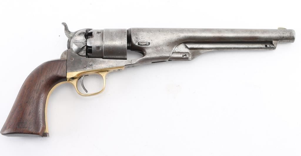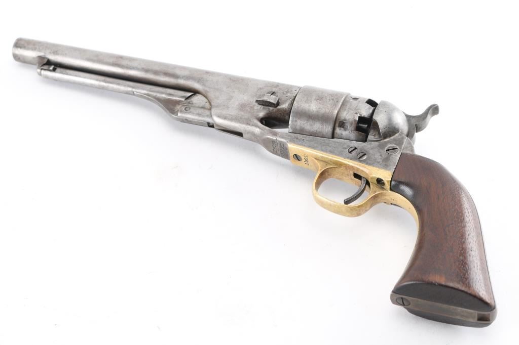 Martially marked & inspected single action percussion revolver issued to the Union Army during the American Civil War, manufactured circa 1863. Features an 8" round barrel, German silver blade front sight, 'v' notch rear sight cut into the hammer lip, smooth thin trigger, knurled hammer spur, non-fluted six shot cylinder with roll stamped Naval Engagement scene, loading lever, round brass trigger guard, steel backstrap, shoulder stock cuts in the recoil shield & butt and one-piece oil finished smooth walnut grip with boxed "JT" cartouches for Jerome Towne (1862-63). All observed serial numbers match including the cylinder, frame, trigger guard and backstrap. Inspector marks include: Barrel - "H" & "E". Cylinder - "H" & "E". Trigger guard - "T". & Backstrap - "T". One line New York barrel address Revolver displays a mottled aged grey/brown patina with the cylinder scene mostly gone. Revolver is mechanically excellent. The bore shows strong rifling & scattered light pitting, the remaining markings are crisp/clear, and the walnut grip is very good with no cracks or chips. An early revolver made in the third year of the war. Condition is NRA Very Good. Antique Firearm.